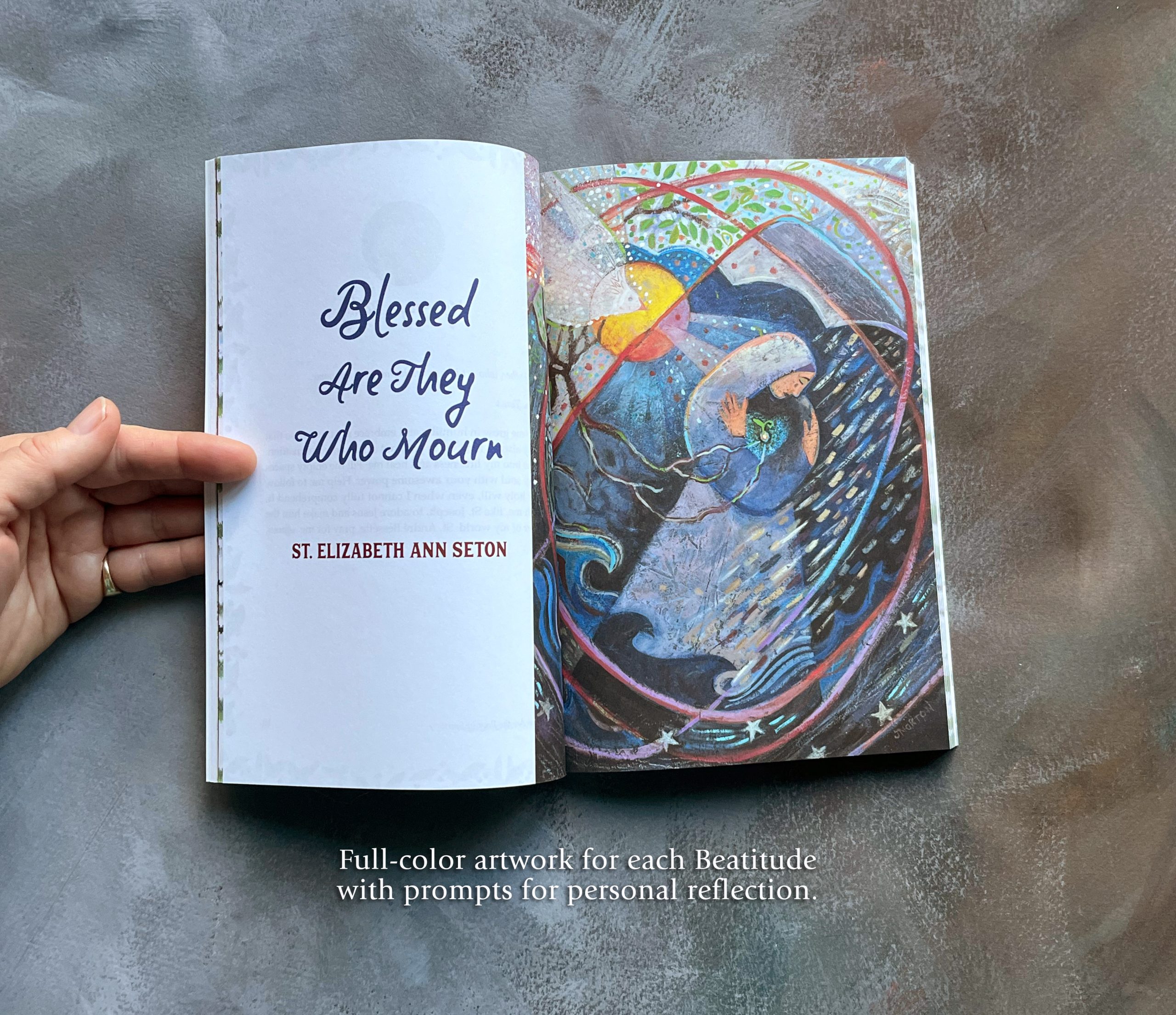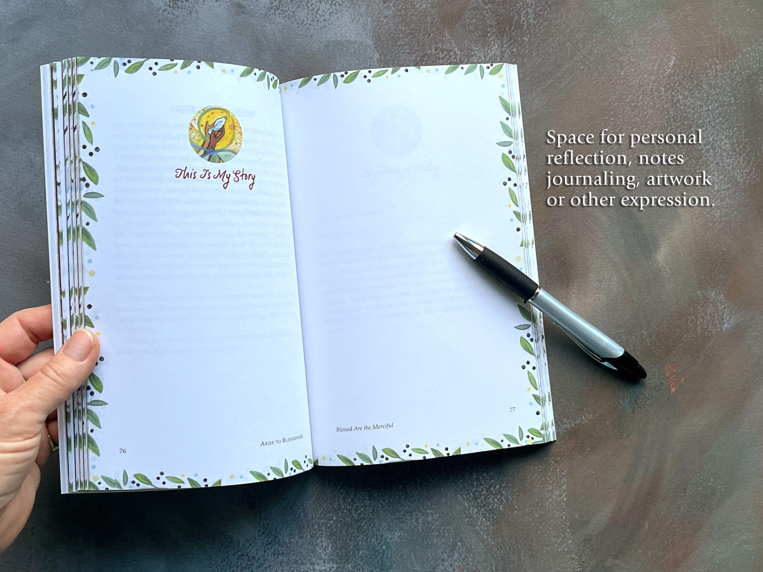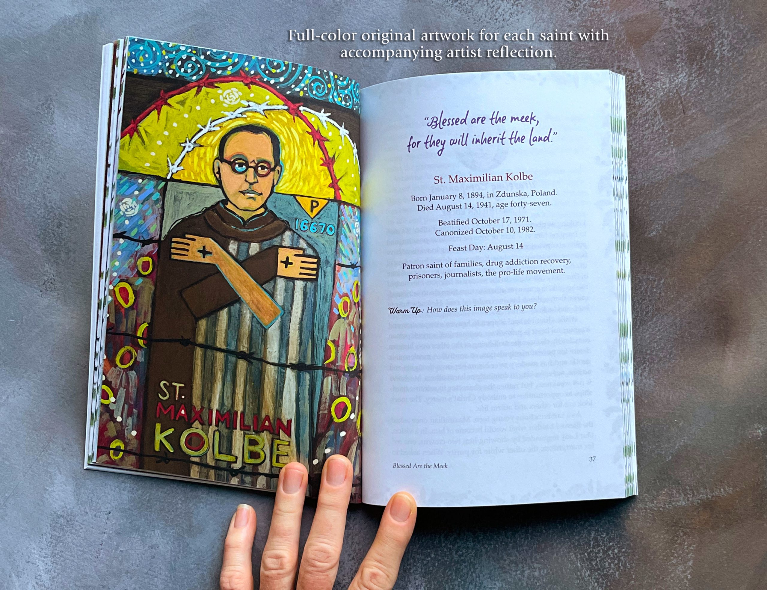 A Journal Retreat with Eight Modern Saints Who Lived the Beatitudes. Ponder the Grace and invitation to walk closely with Jesus through this self-guided retreat journal. Each chapter includes original artwork, Gospel readings, artist’s reflections, heart-felt prayers and plenty of space to write, draw and respond in your own way to the journal prompts. Perfect for a gift, personal retreat, or to guide a group reflection. Book ships with USPS Media Mail.