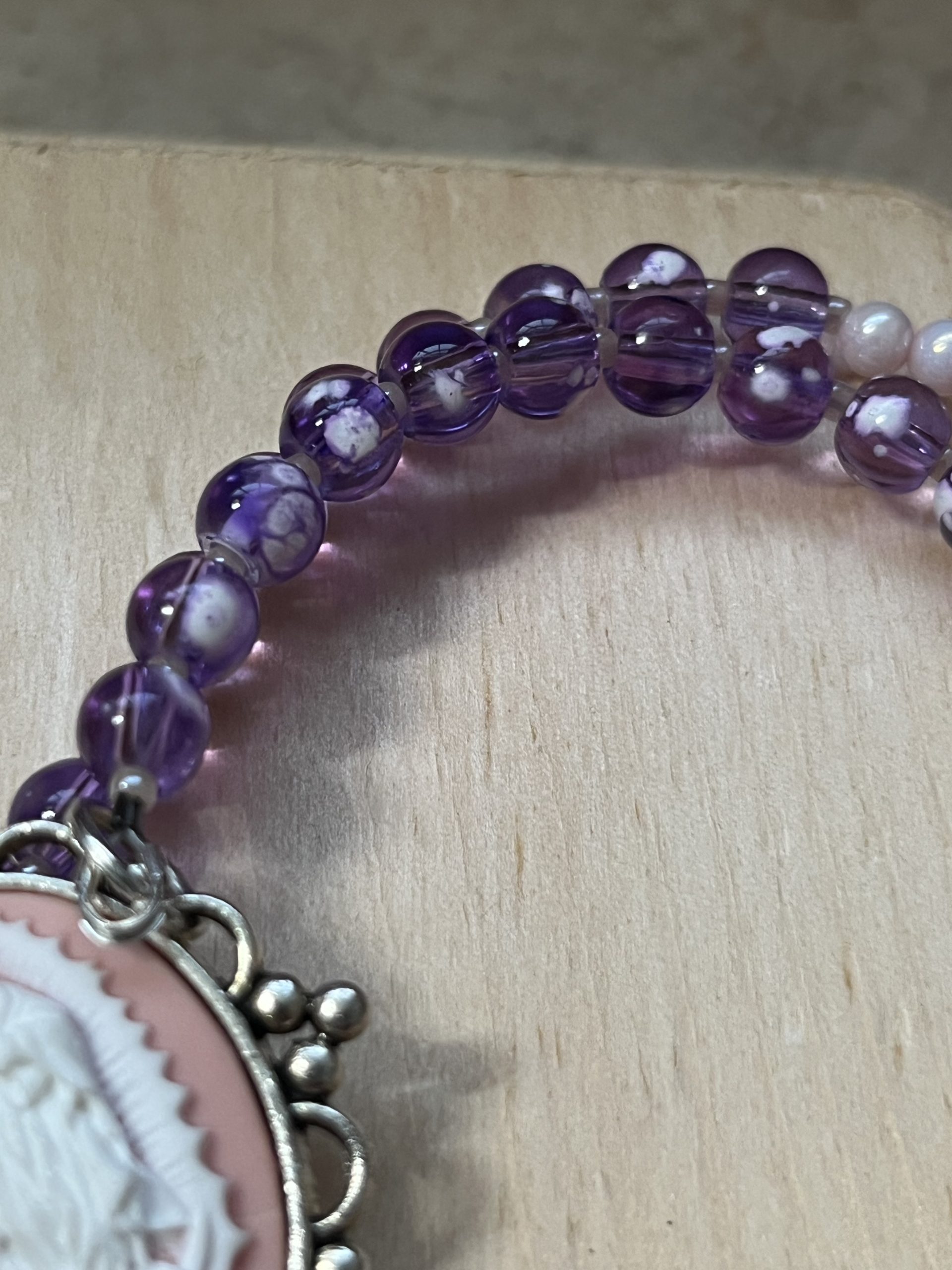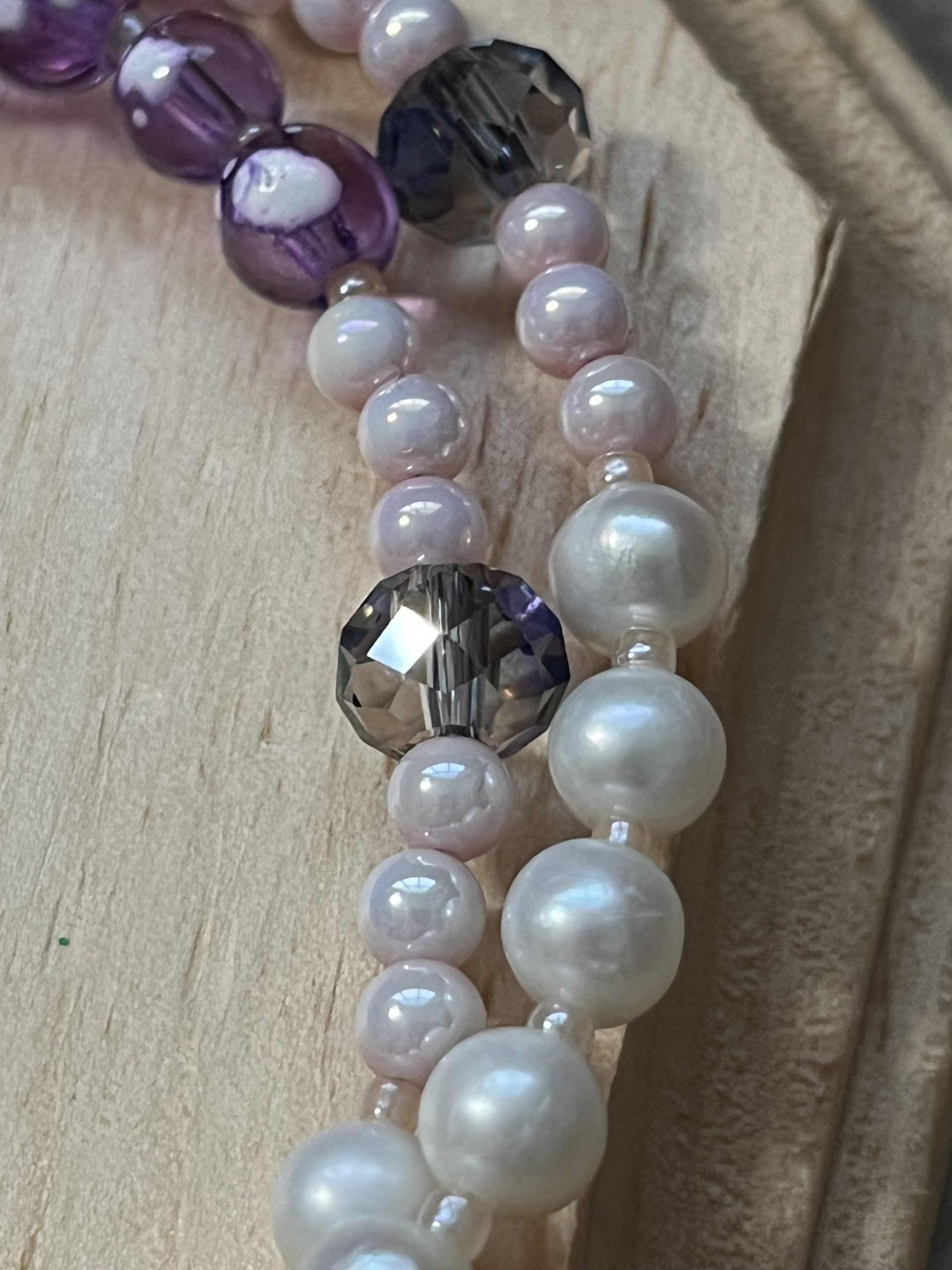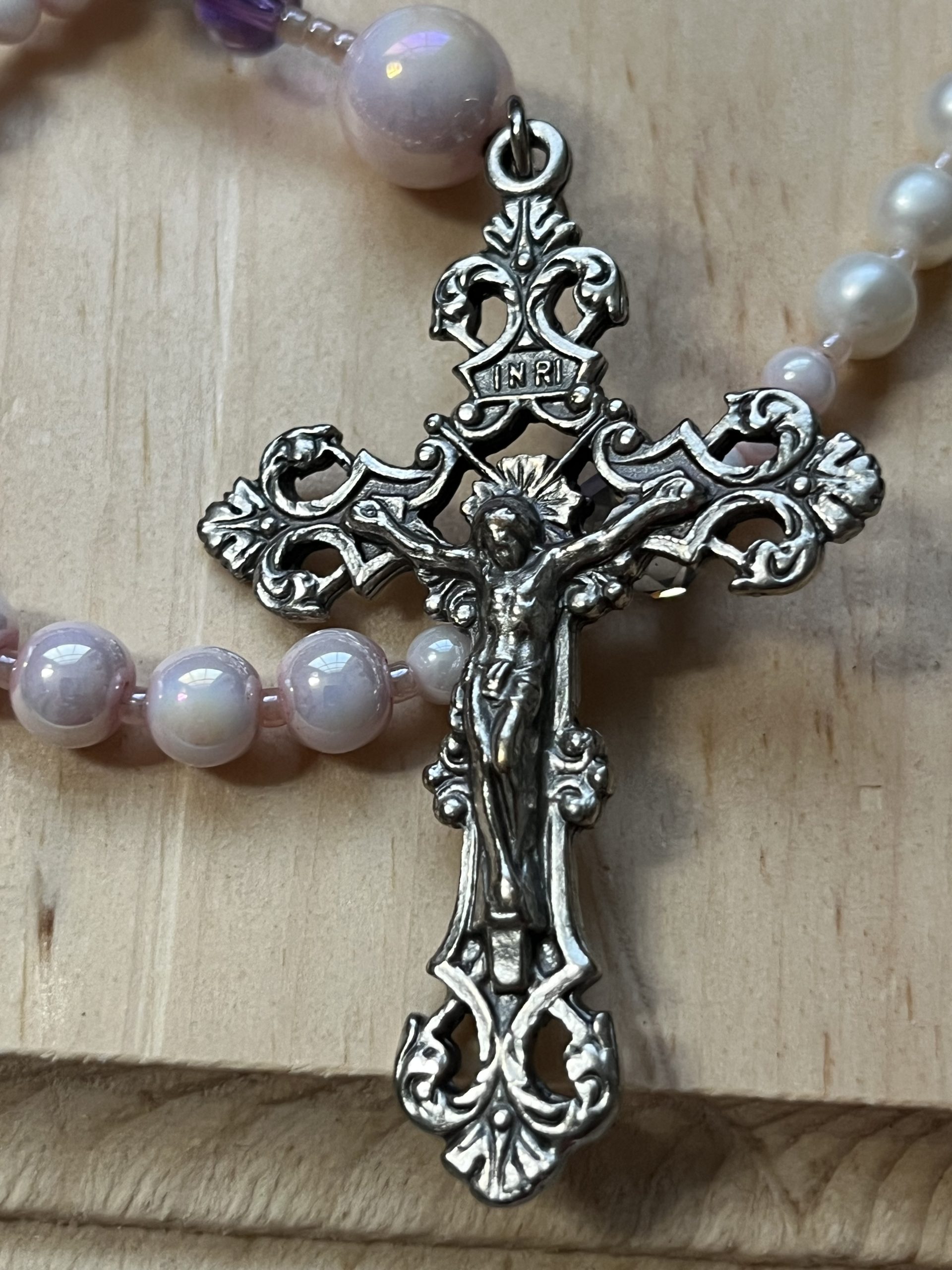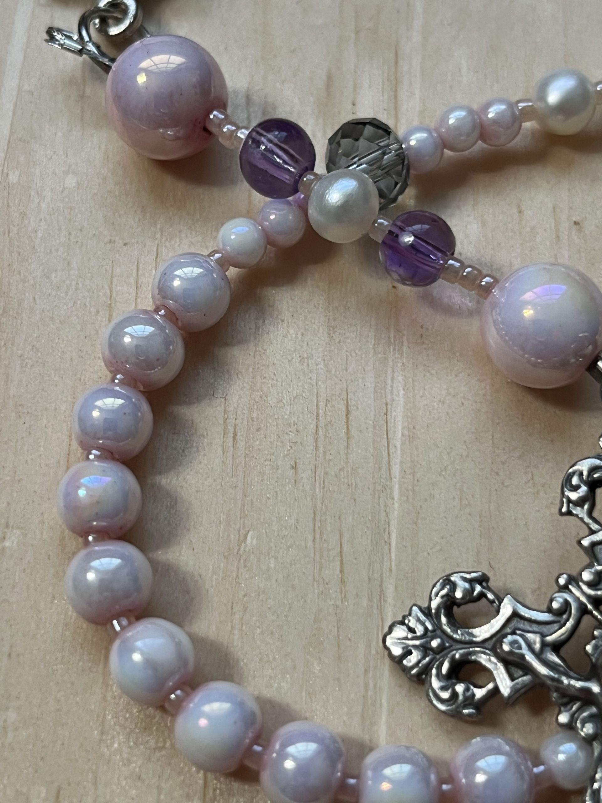 The Hail Mary beads are a blend of 6mm snowflake lavender glass beads, white freshwater pearls, and pink luster glass beads, accented with delicate light pink seed beads.