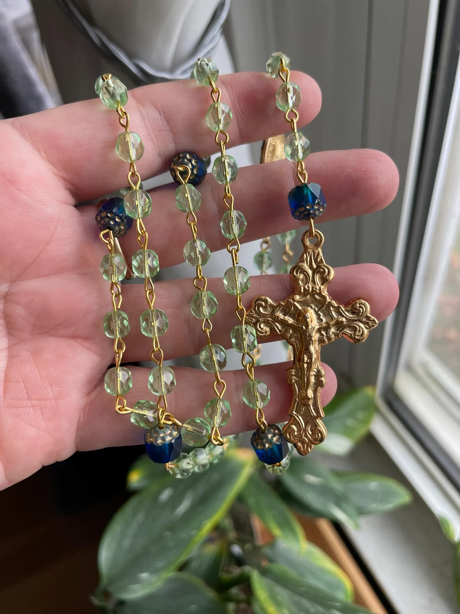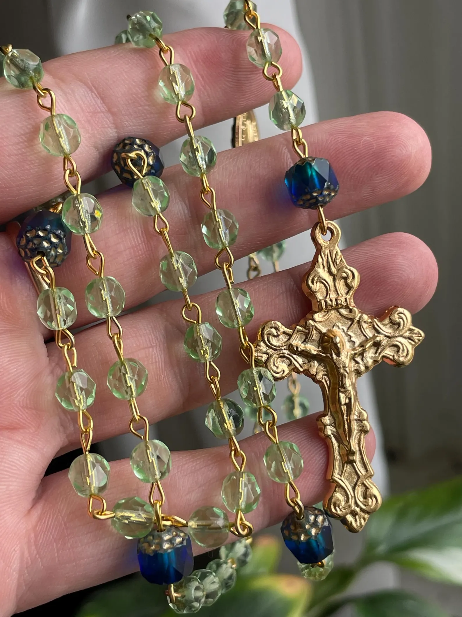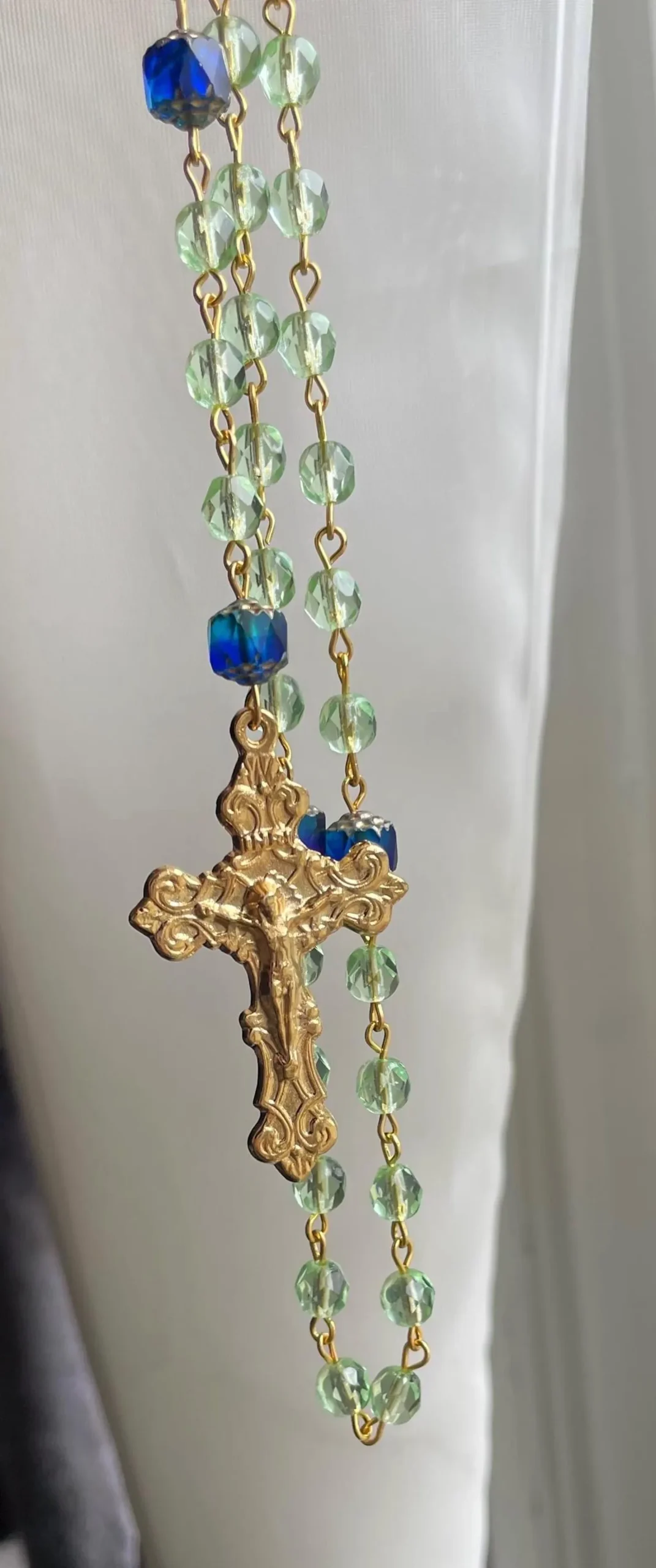 🪽Made from lovely and soothing lime green and blue-gradient Czech glass. The crucifix and connector are a gold plated finish.