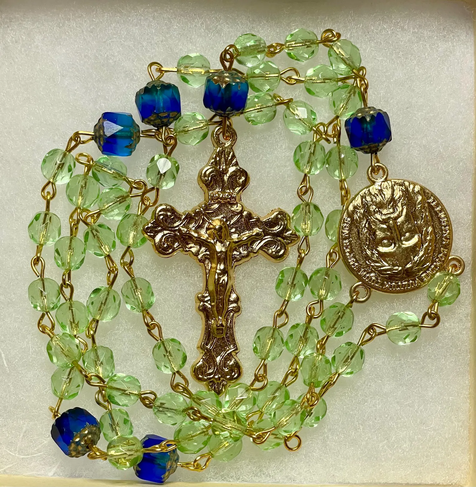 Blue and Green Czech Glass Handmade Rosary – St. Siricius
