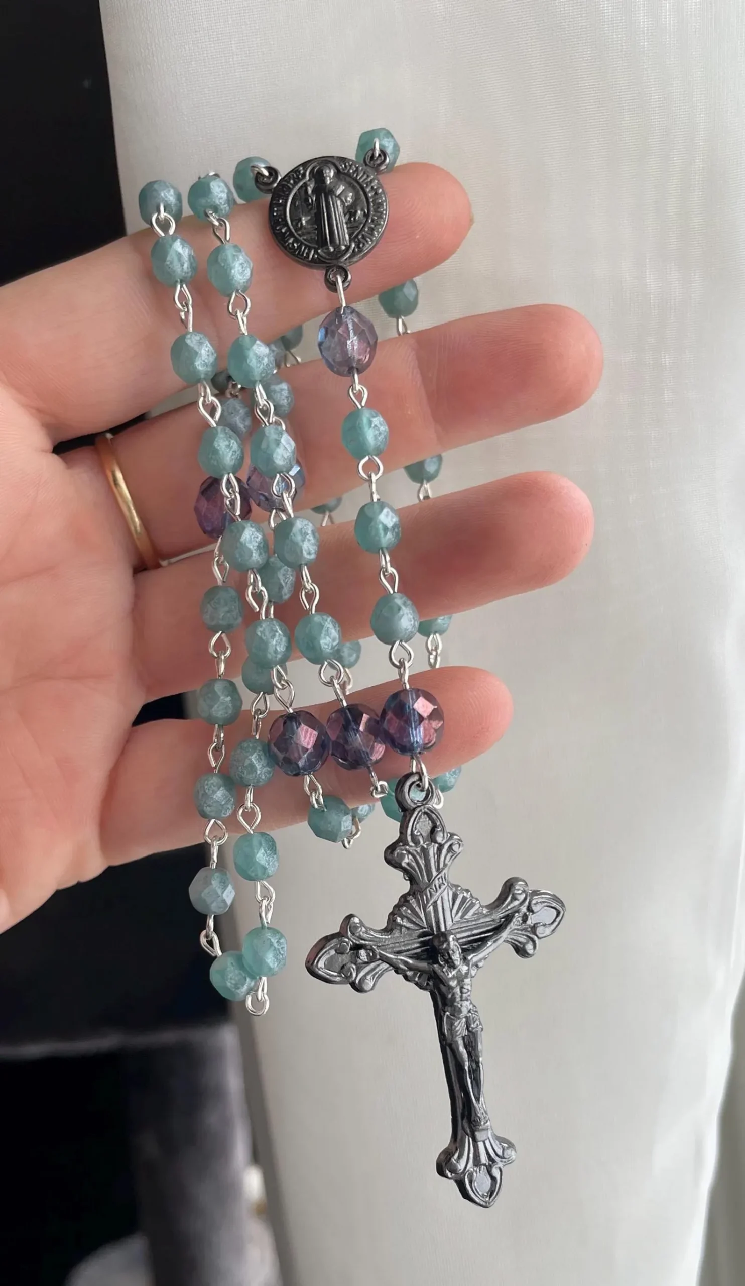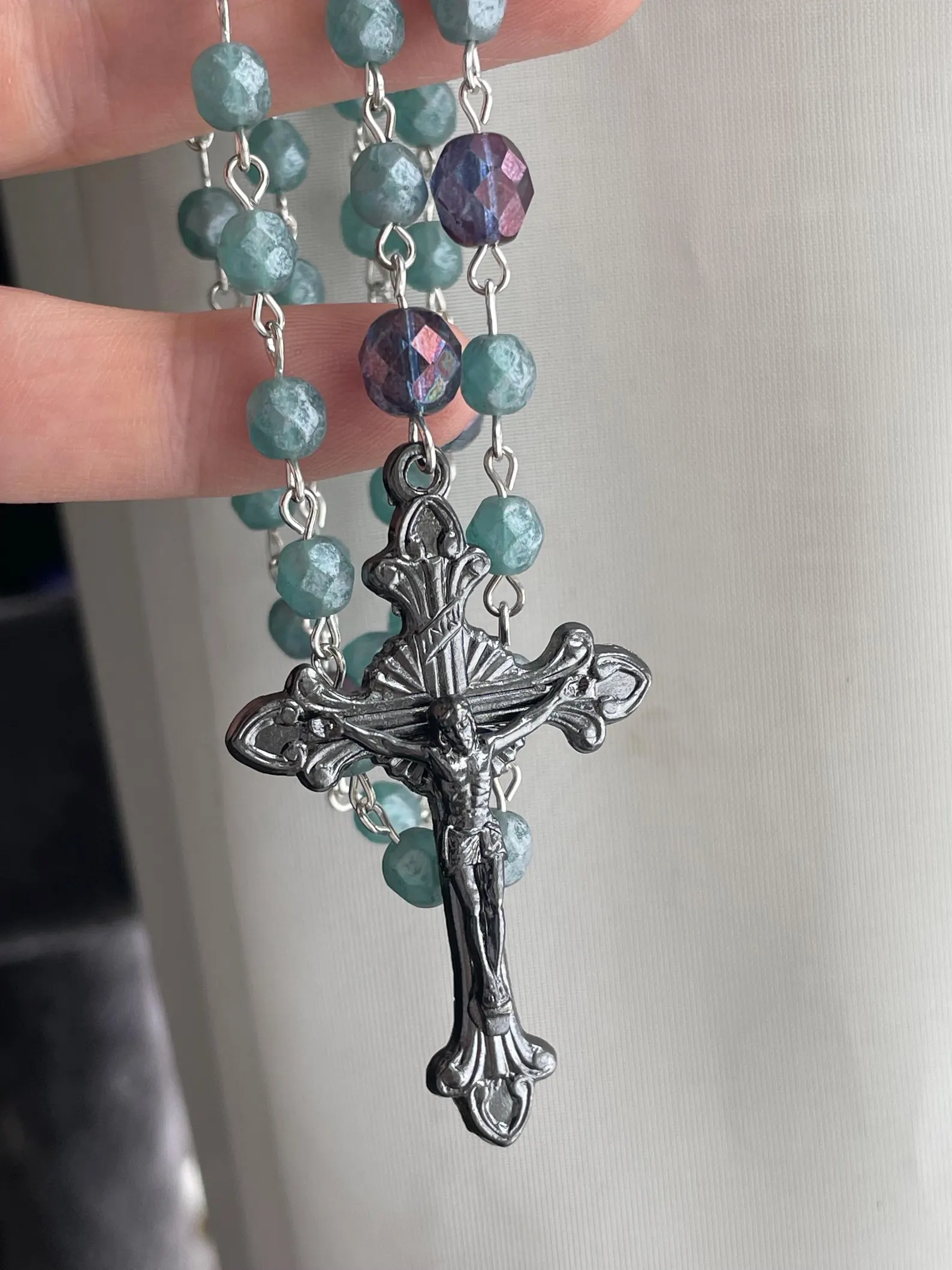 🪽Made from light blue frosted Czech glass beads, and smoky purple/navy blue Czech glass beads. The crucifix and connector are a gunmetal finish.