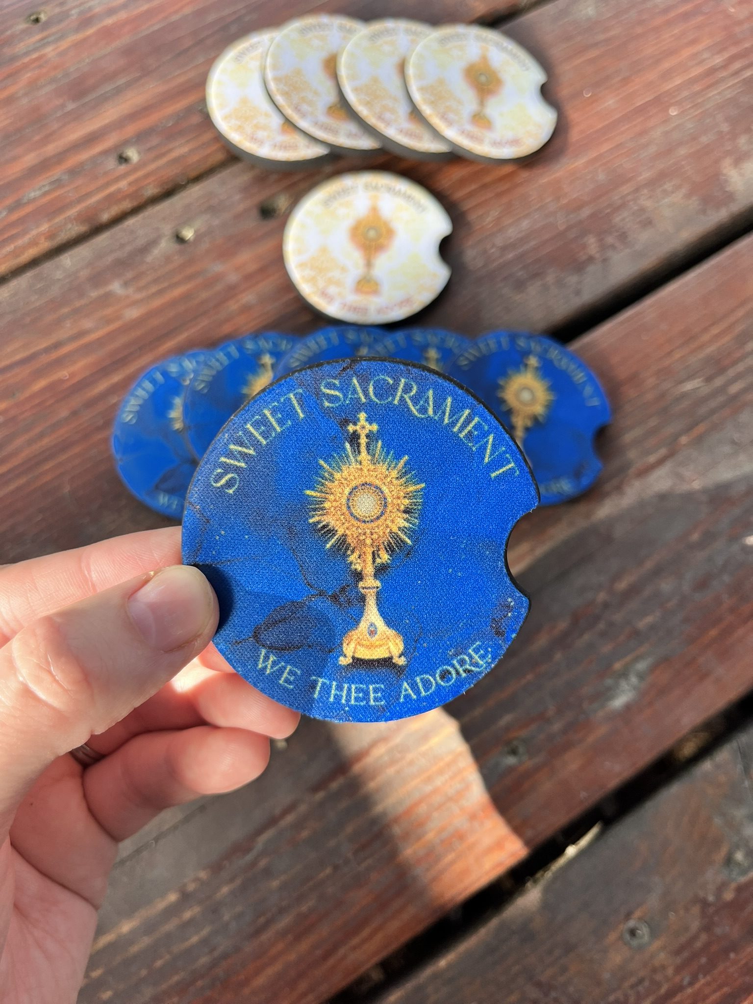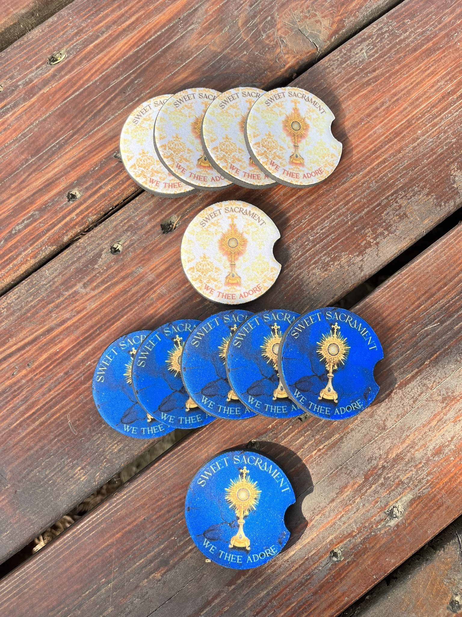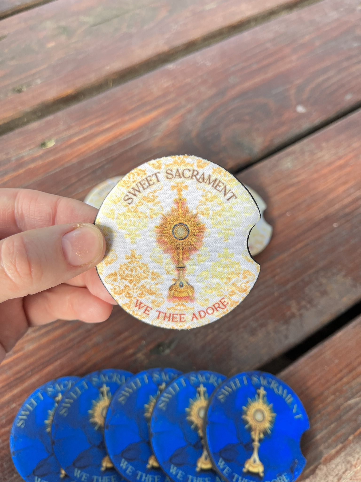 Handmade Catholic car coasters with Eucharistic designs – fit in standard car cupholders!