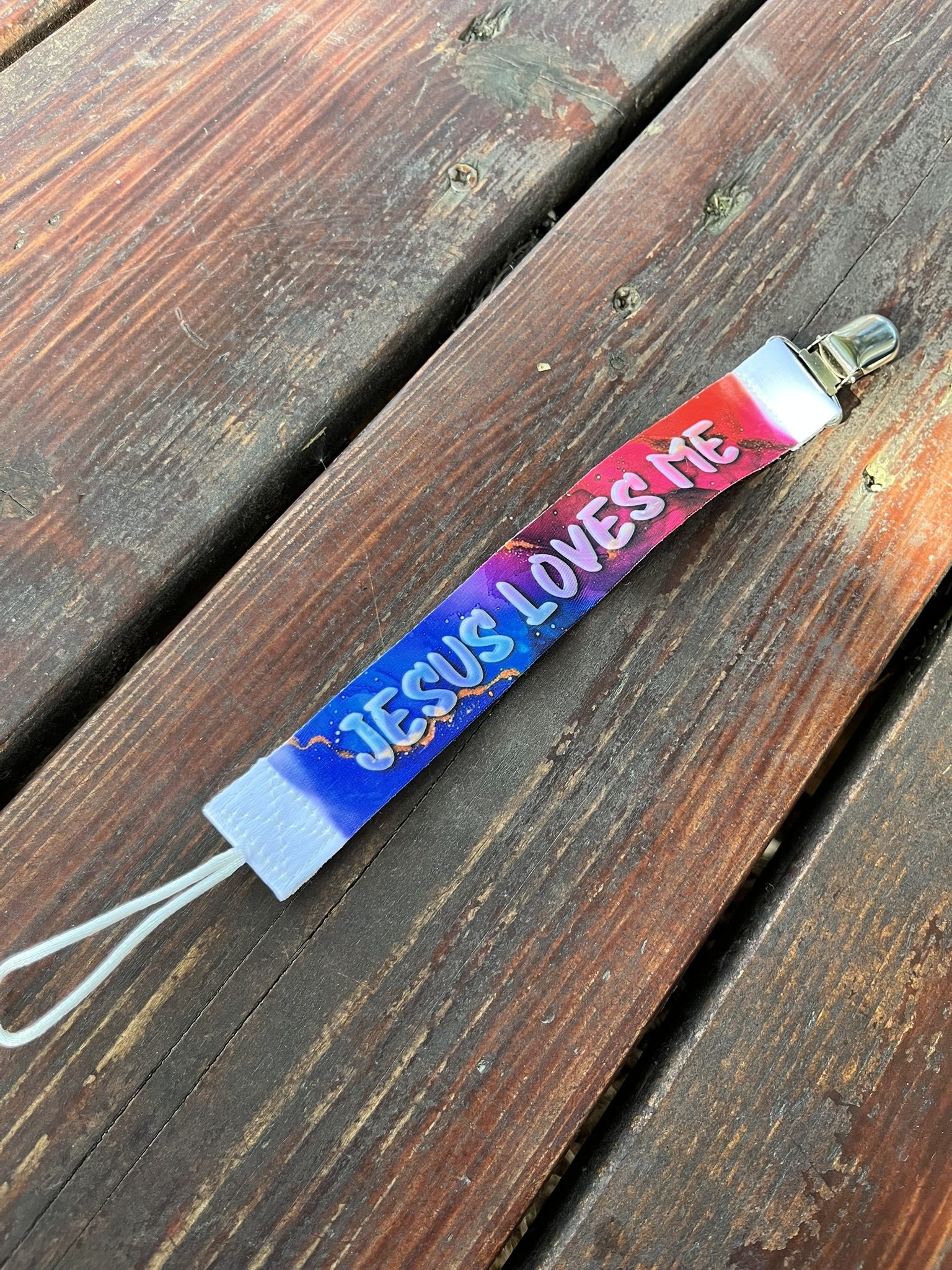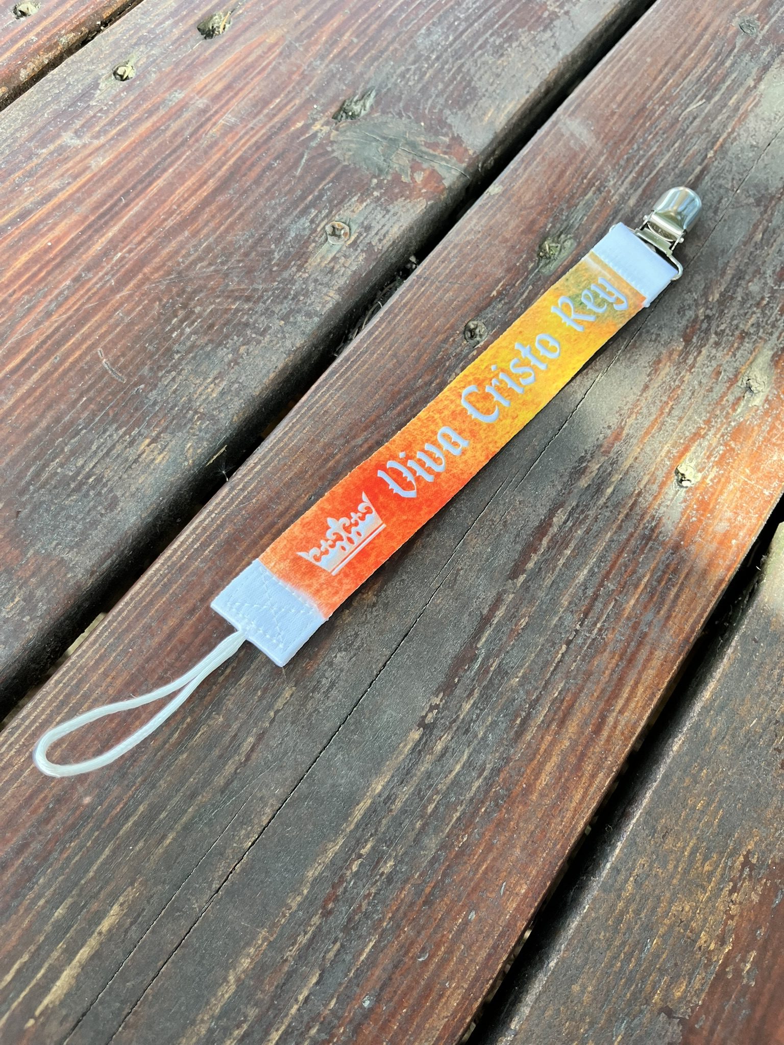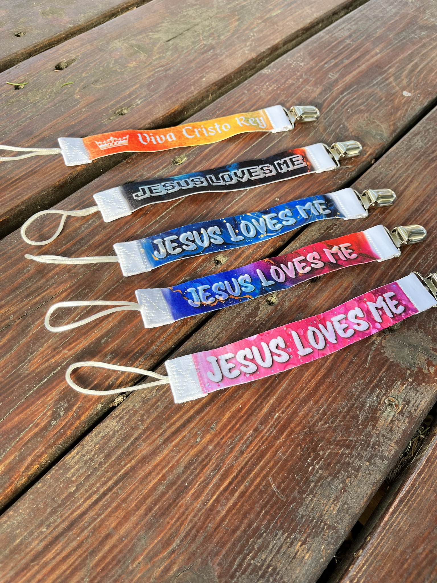Christian Baby Pacifier Clips – Jesus Loves Me and Viva Cristo Rey – Various colors and designs
