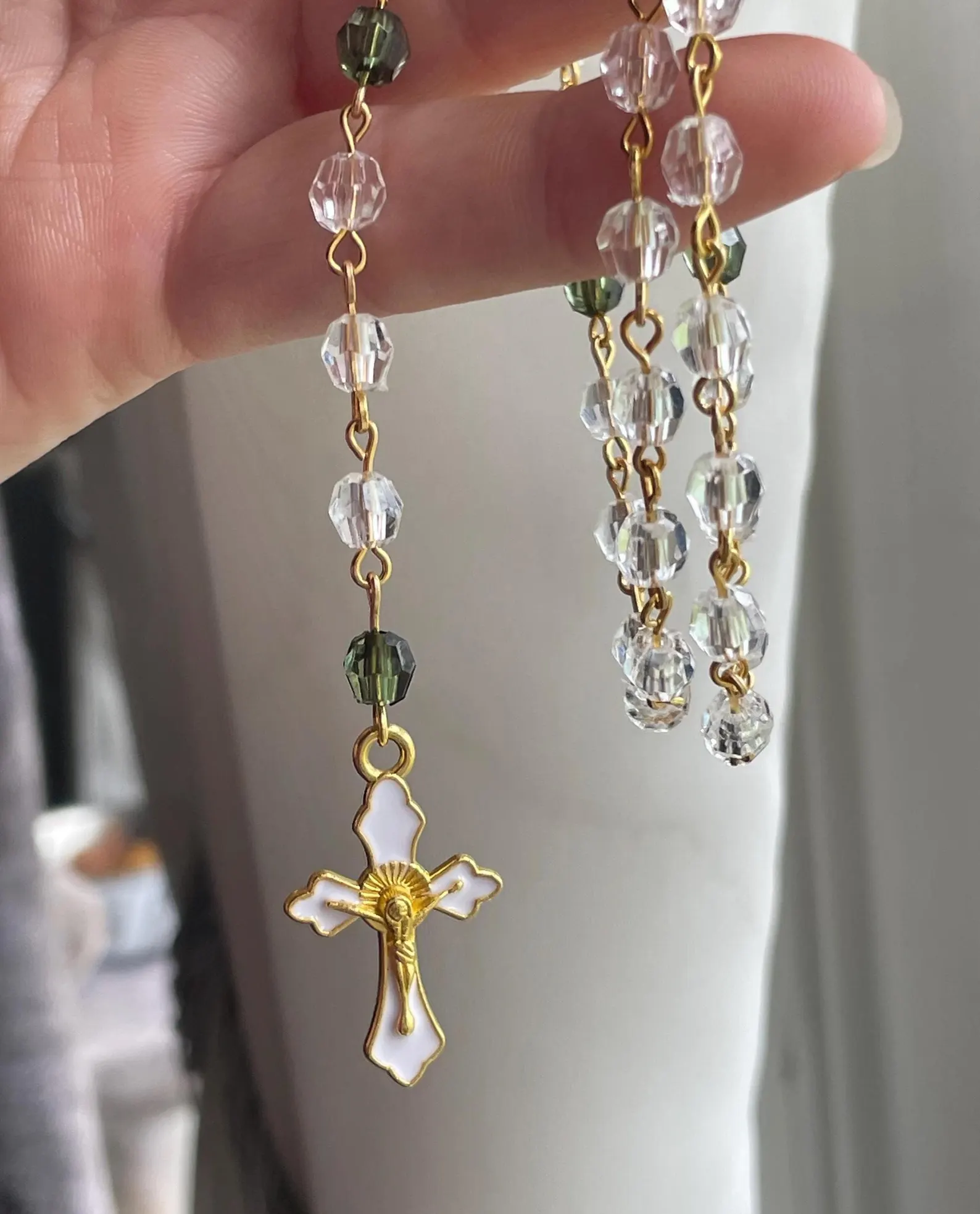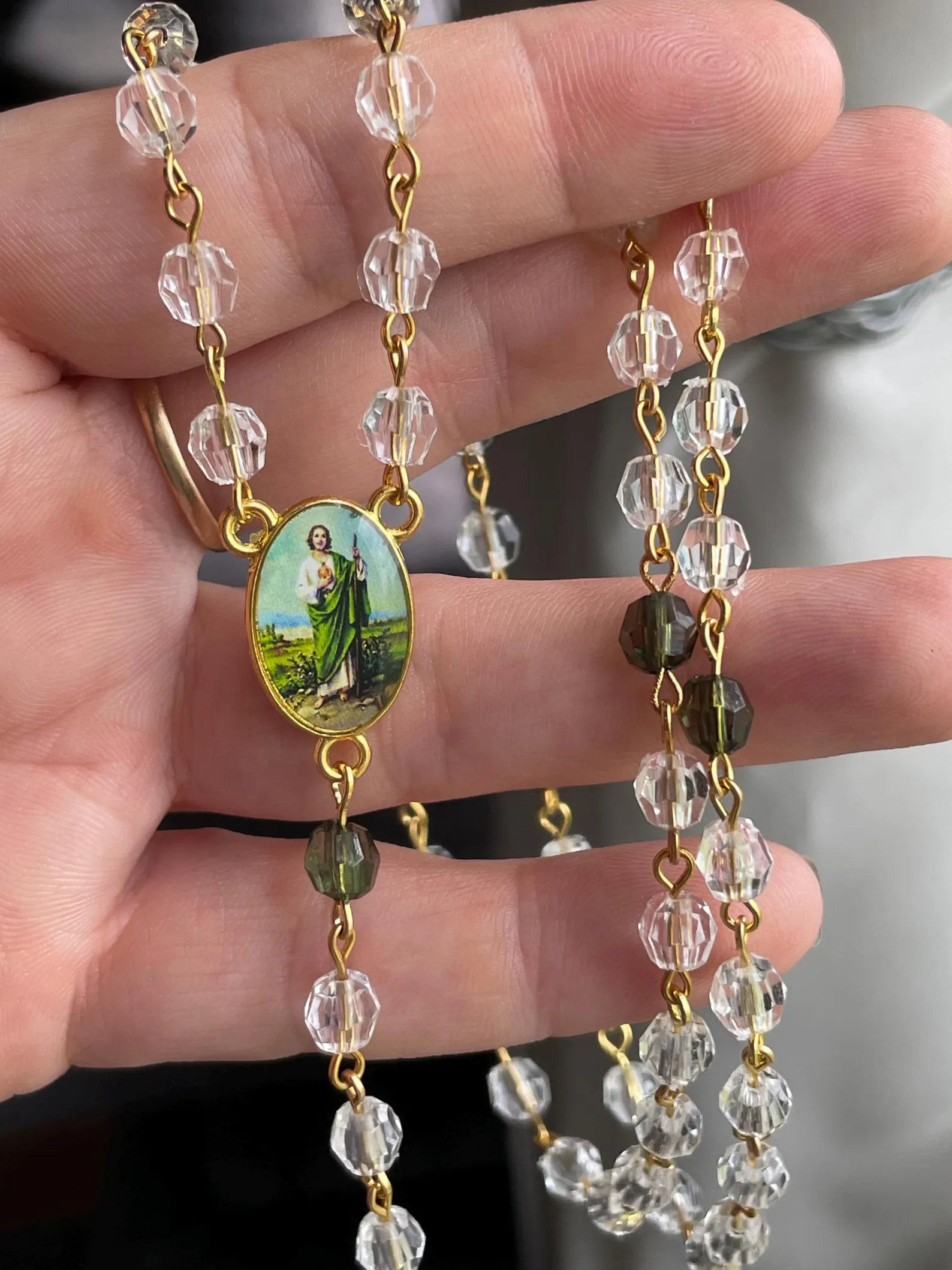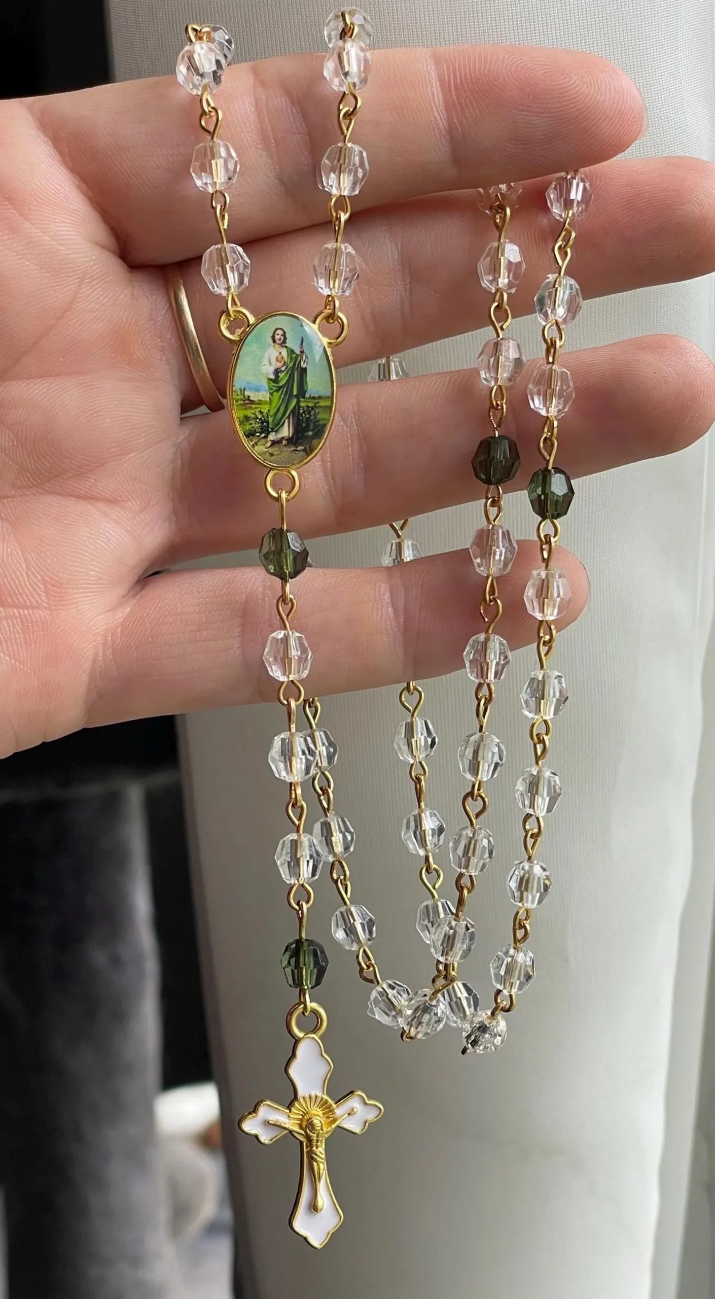 🪽Made from clear and green lightweight acrylic beads, with a colorful enamel crucifix and centerpiece. Affordable, but still made with durable craftsmanship!