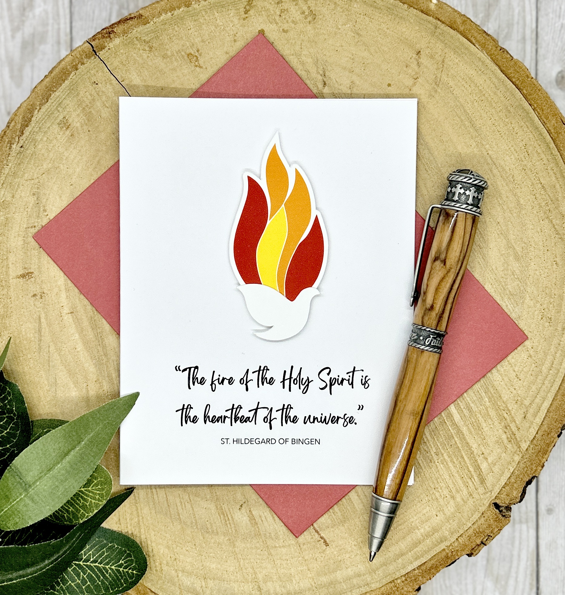 Celebrate the Sacrament of Confirmation with this striking card featuring a radiant dove descending in tongues of fire—symbolizing the Holy Spirit’s powerful presence. Paired with an inspiring quote from St. Hildegard of Bingen, this card beautifully captures the mystery, strength, and joy of this sacrament.