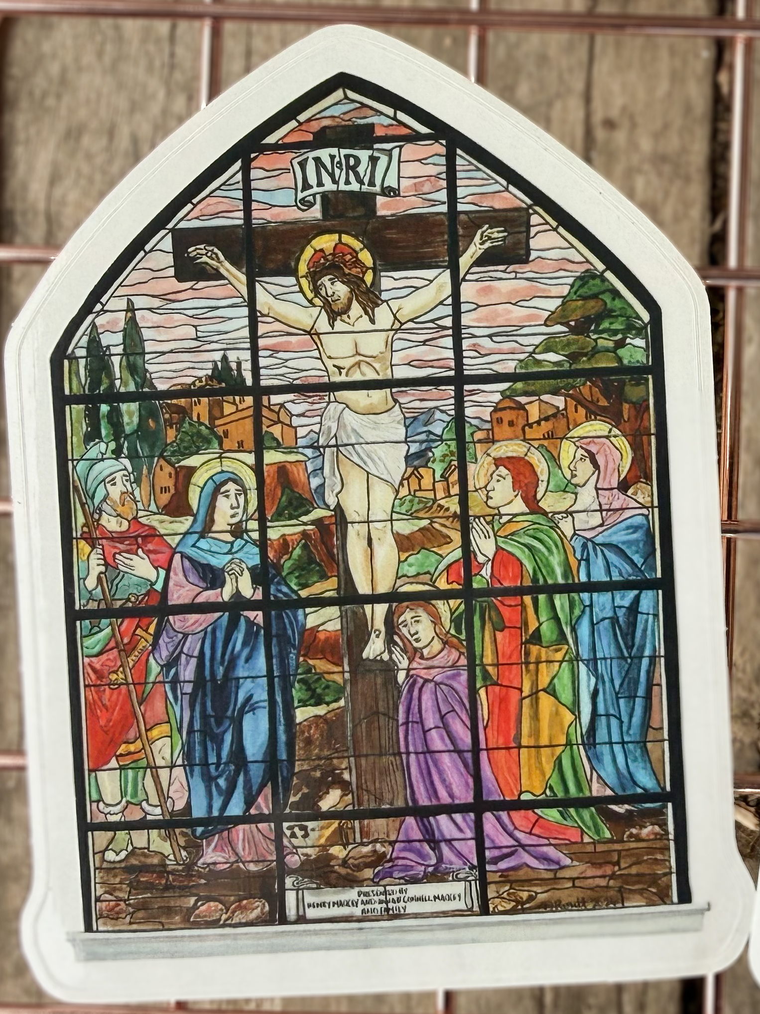 4×3 inch clear plastic sticker depicting a watercolor replica of the Crucifixion stained glass window located in Saint Luke Catholic Church in Nicholasville, Kentucky