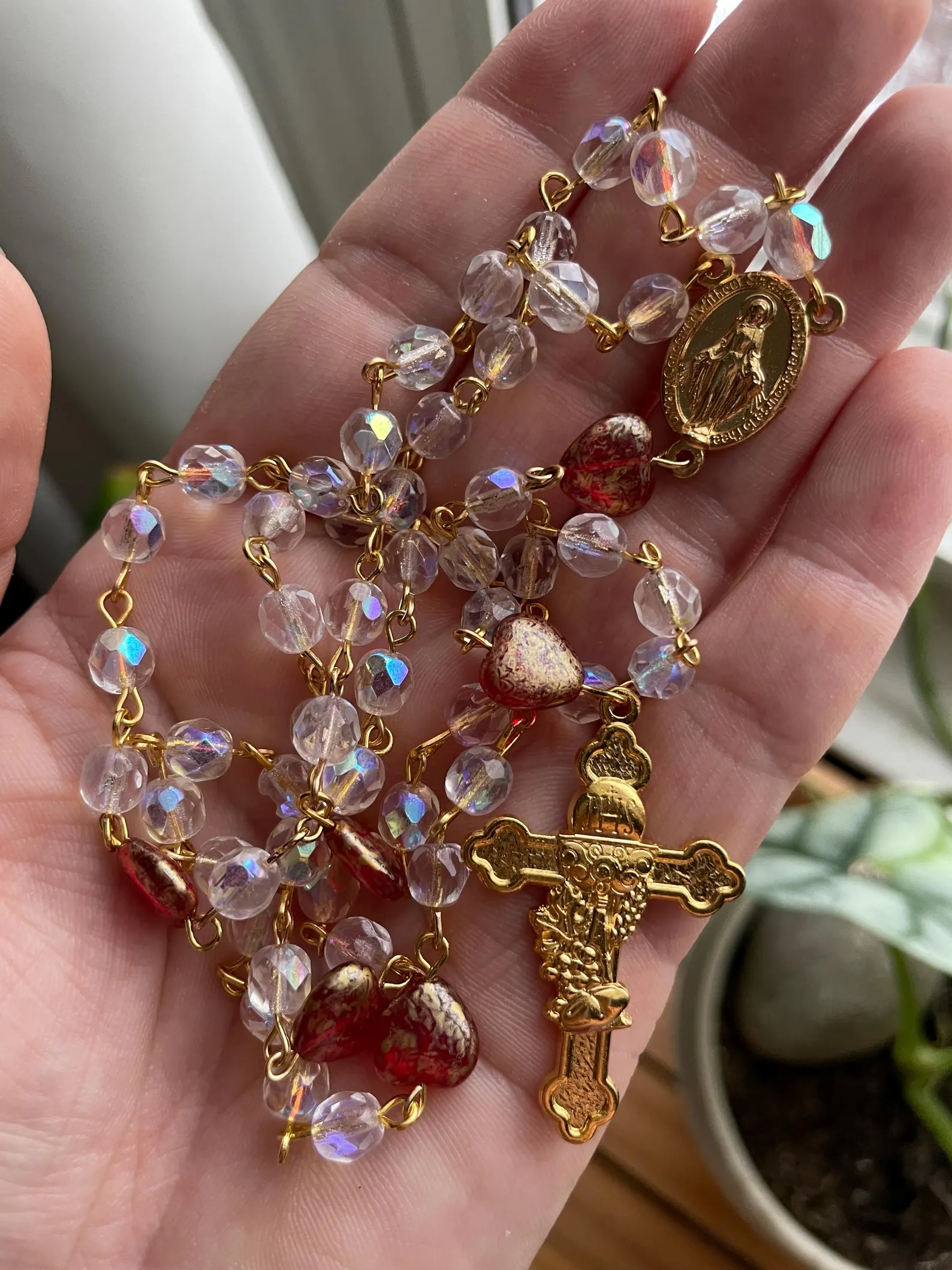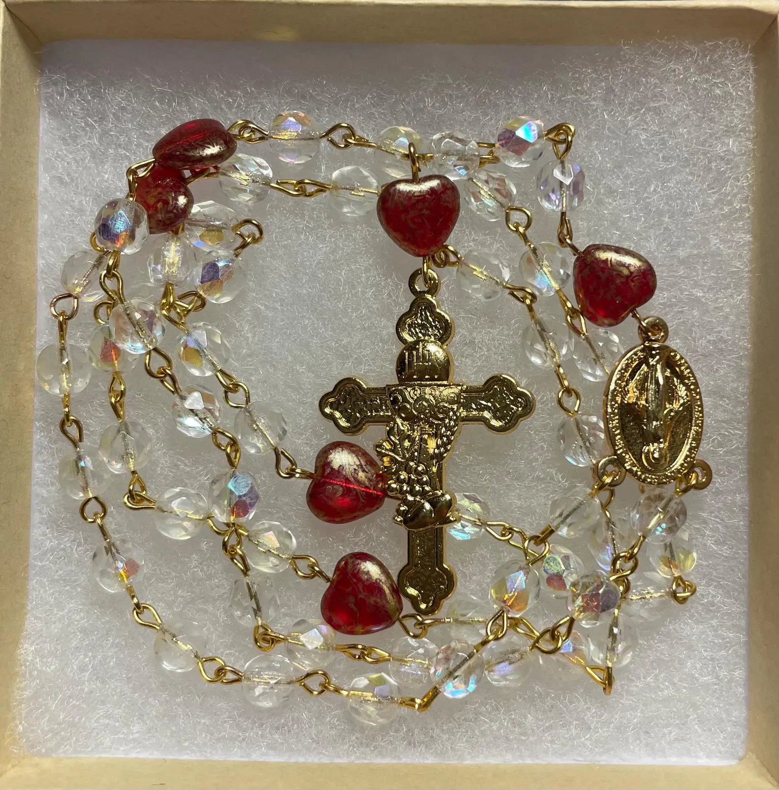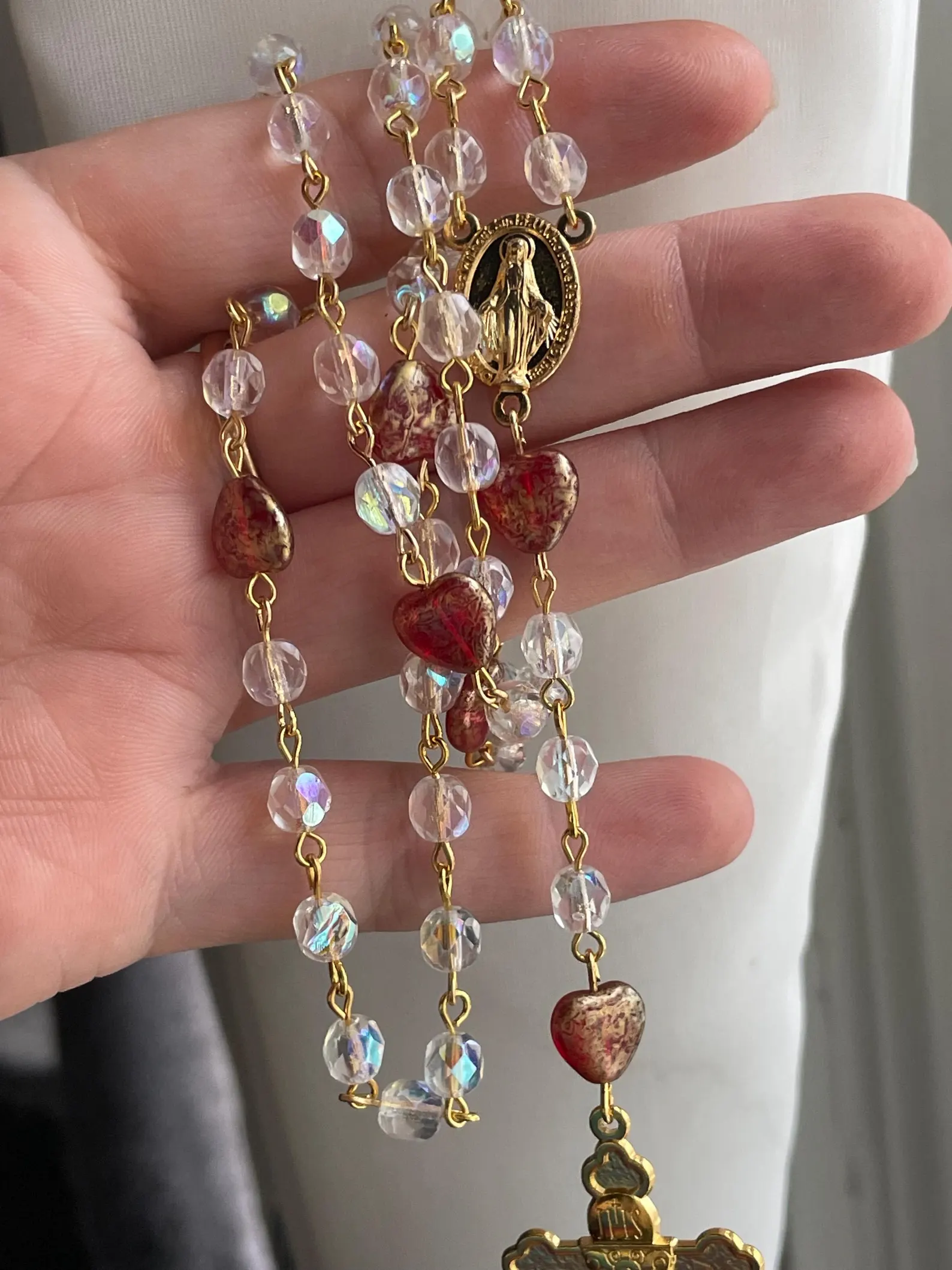 Crystal Clear Czech Glass with Red Hearts Handmade Rosary – St. Barbara