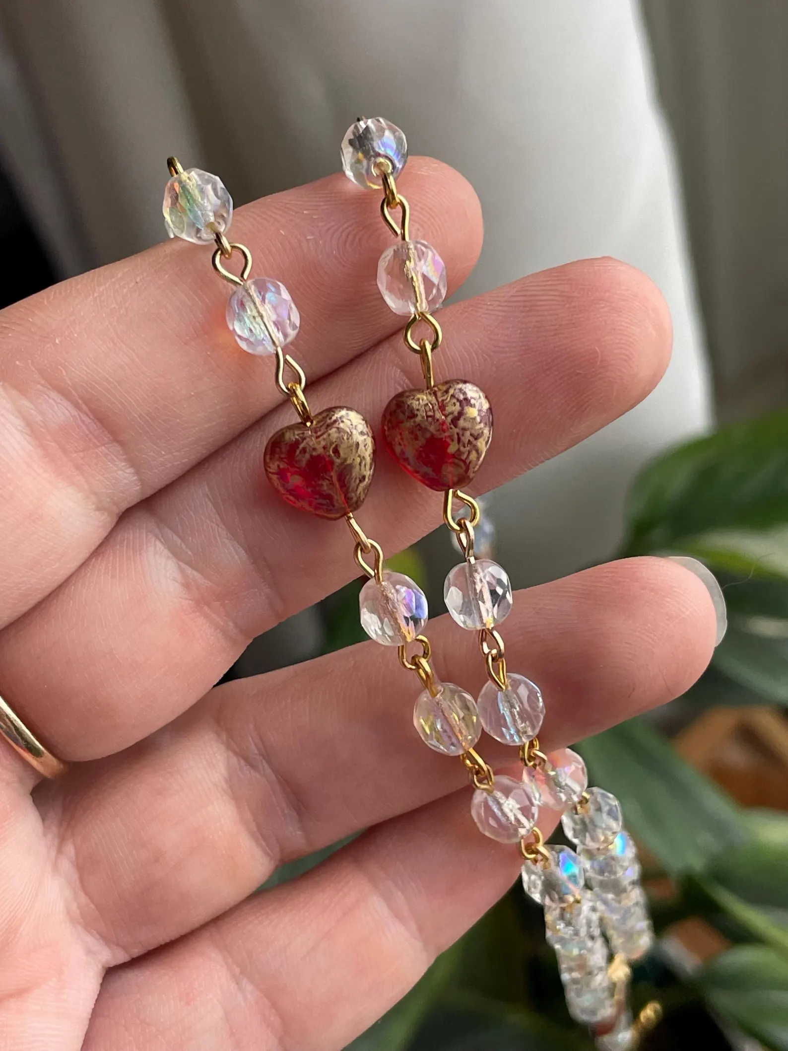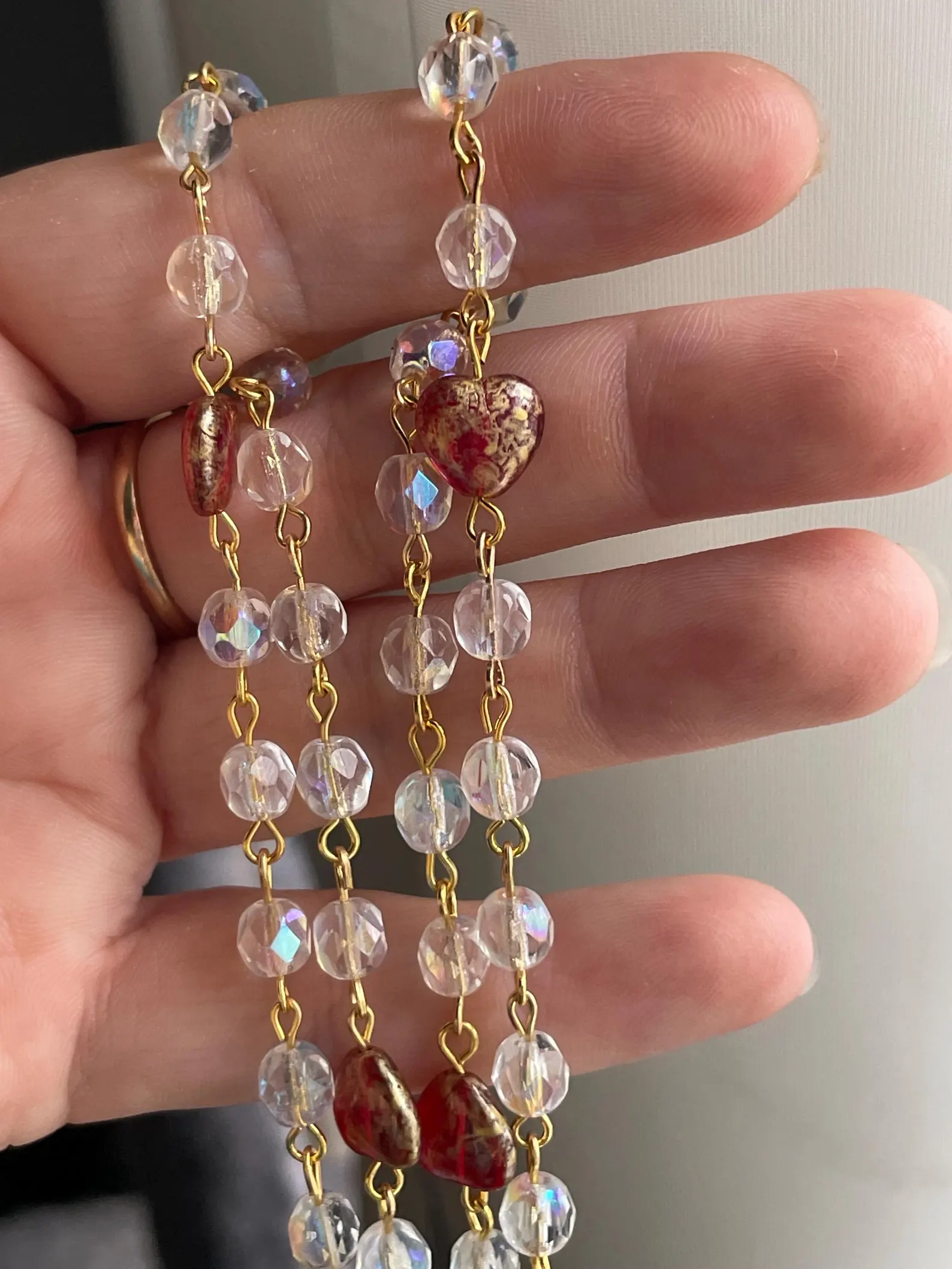 🪽Made from flashy clear Czech glass beads, and adorable gold accented red hearts. The crucifix and connector are a gold plated finish.