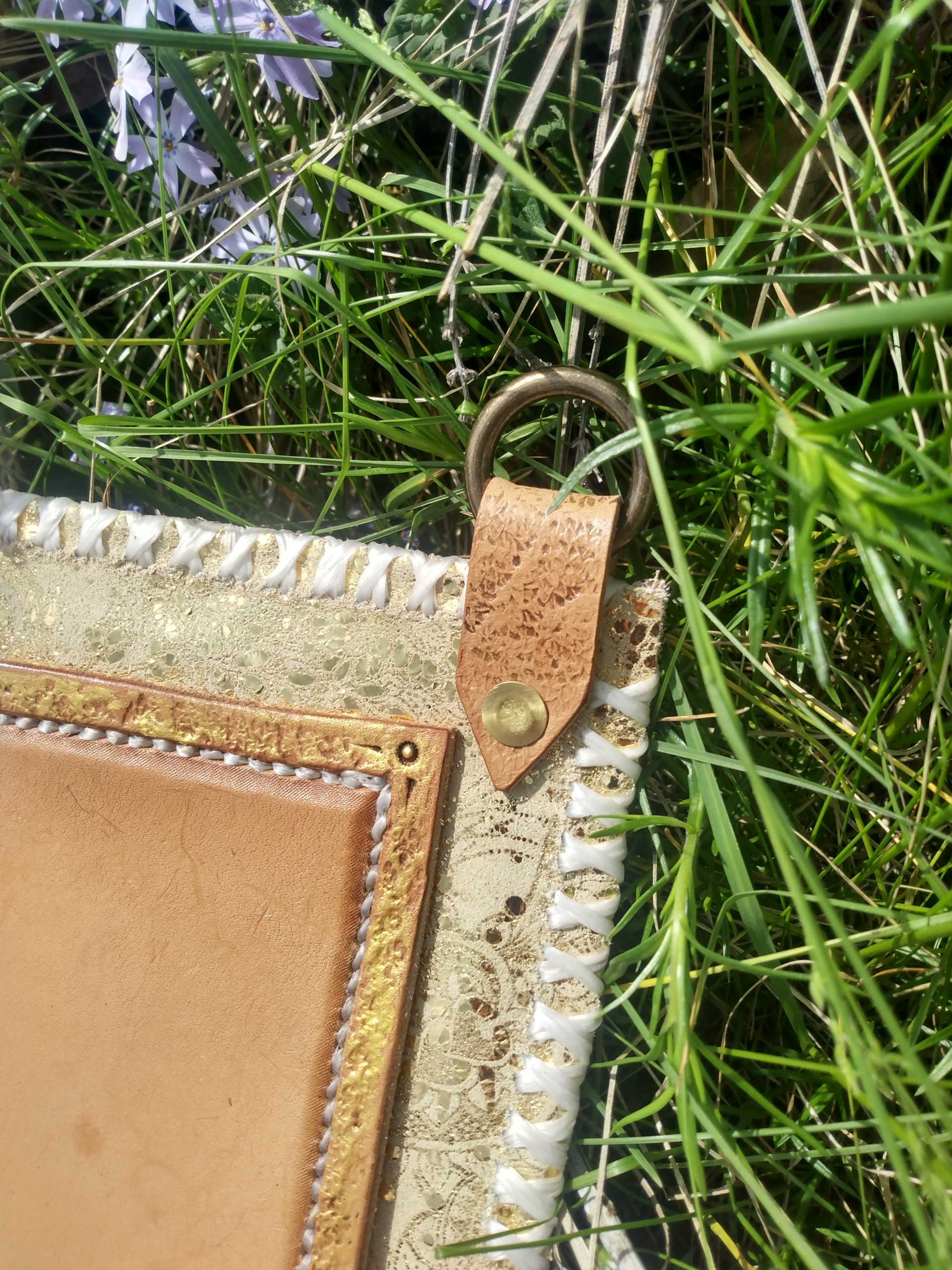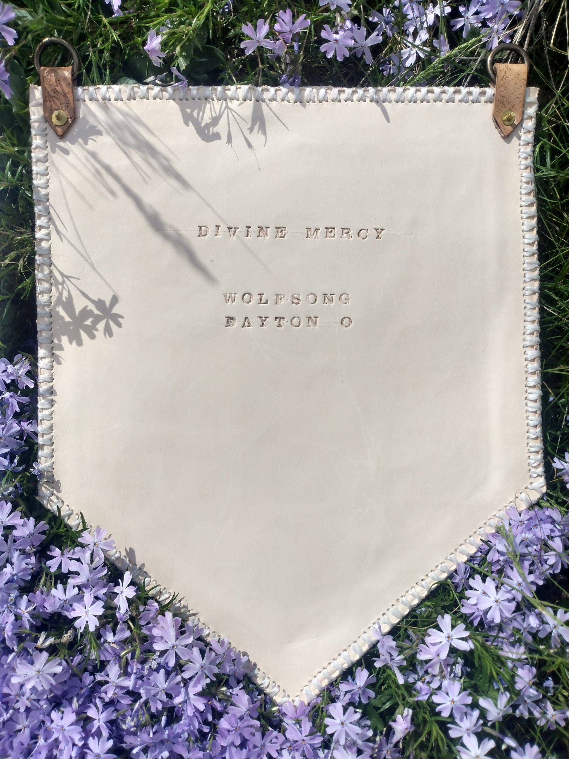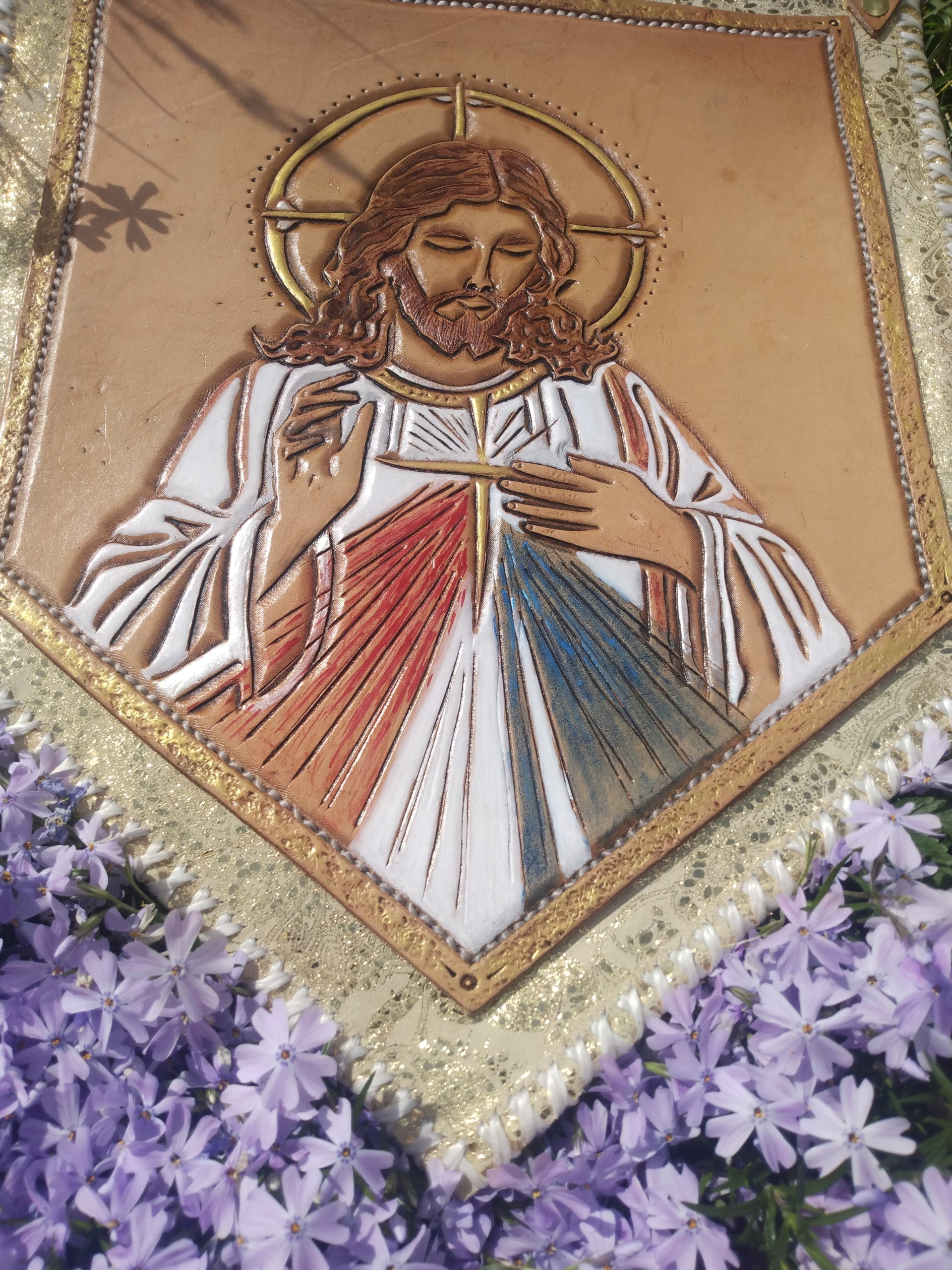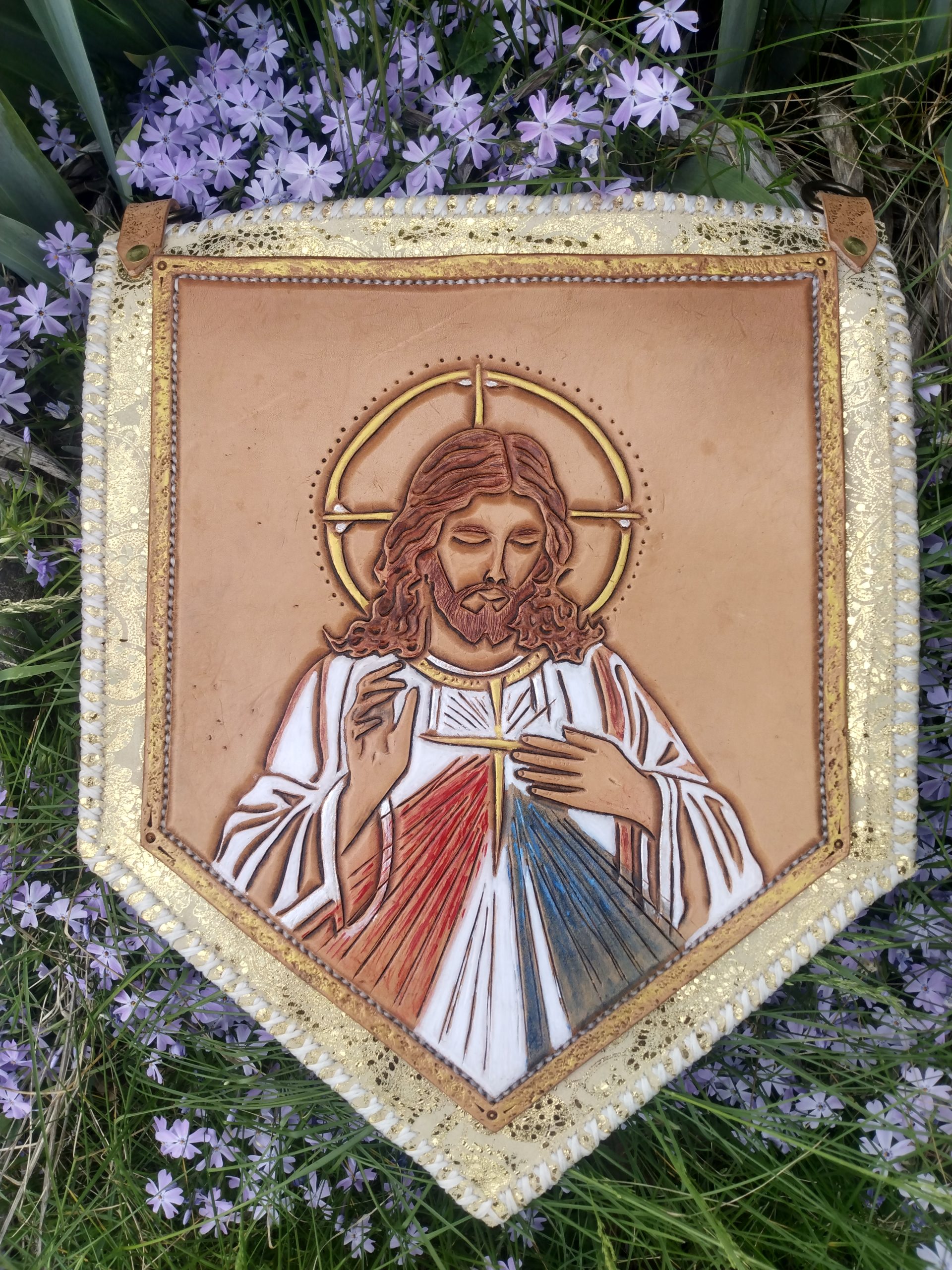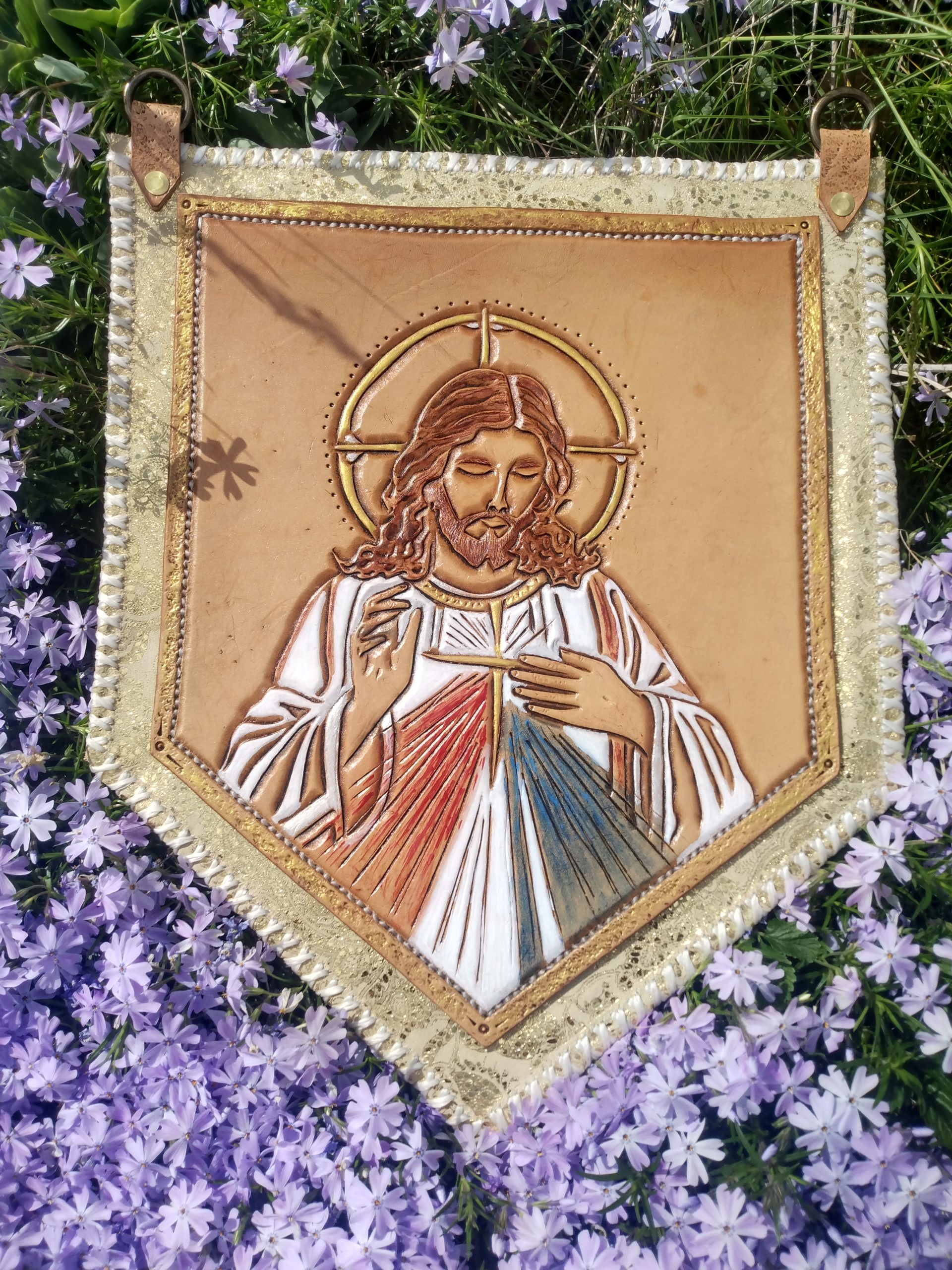 Centerpiece done in beautiful Hermann Oak veg-tan, framed on a field of an amazing, tannery run, embossed and tipped, specialty chrome-tan suede. Traditionally crafted by hand with great passion, pride, and PRAYER! You buy the art, the prayers are free, and your guardian angel knows how to unlock all the prayers and blessings contained within.