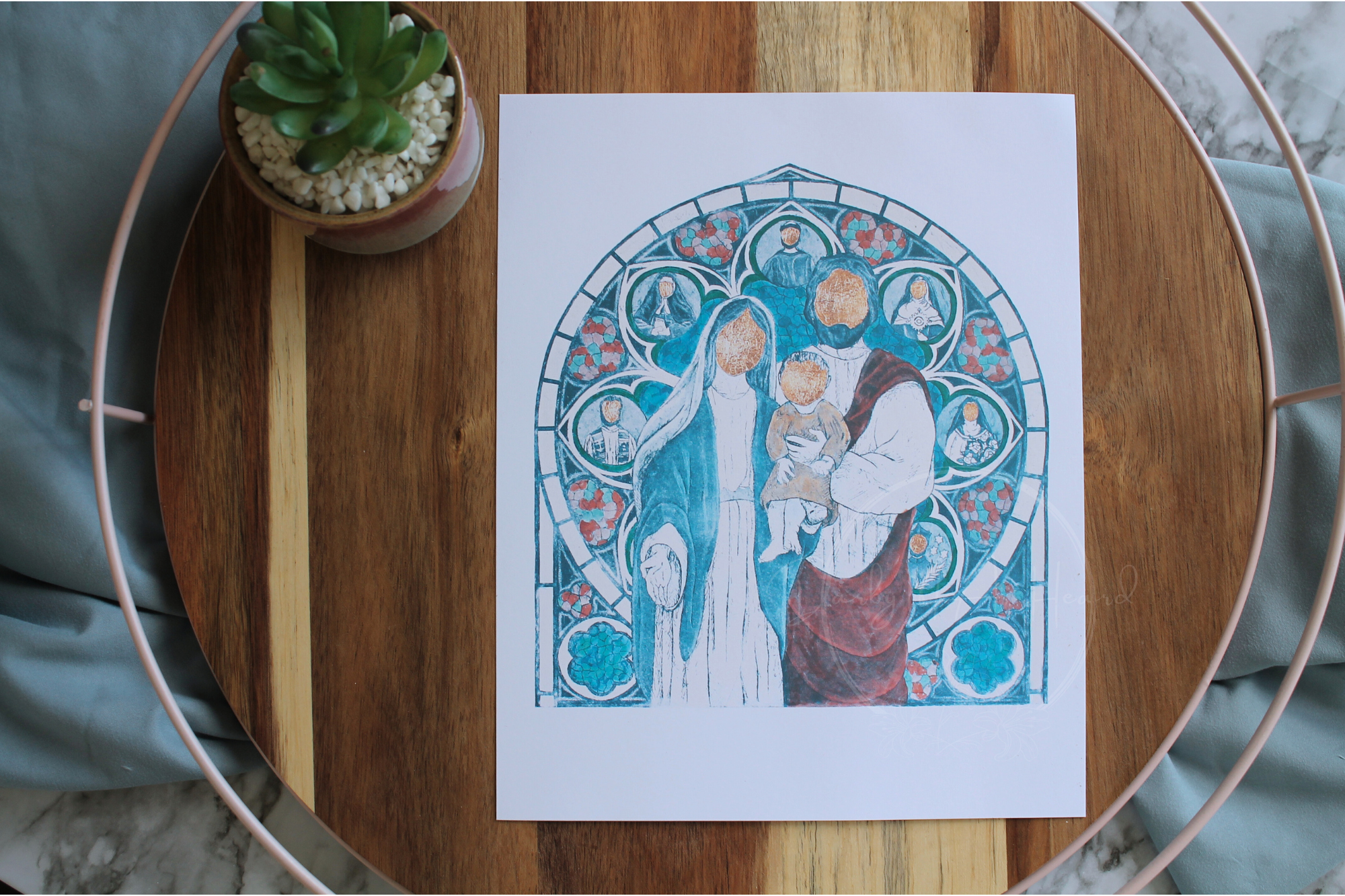 Celebrate the beauty and sanctity of the Holy Family with a reproduction print of Familíae Tuae, featuring Jesus, Mary, and Joseph surrounded by the reverent glow of Gothic stained glass. This devotional piece honors the heart of Catholic family life while inviting prayerful reflection and devotion.