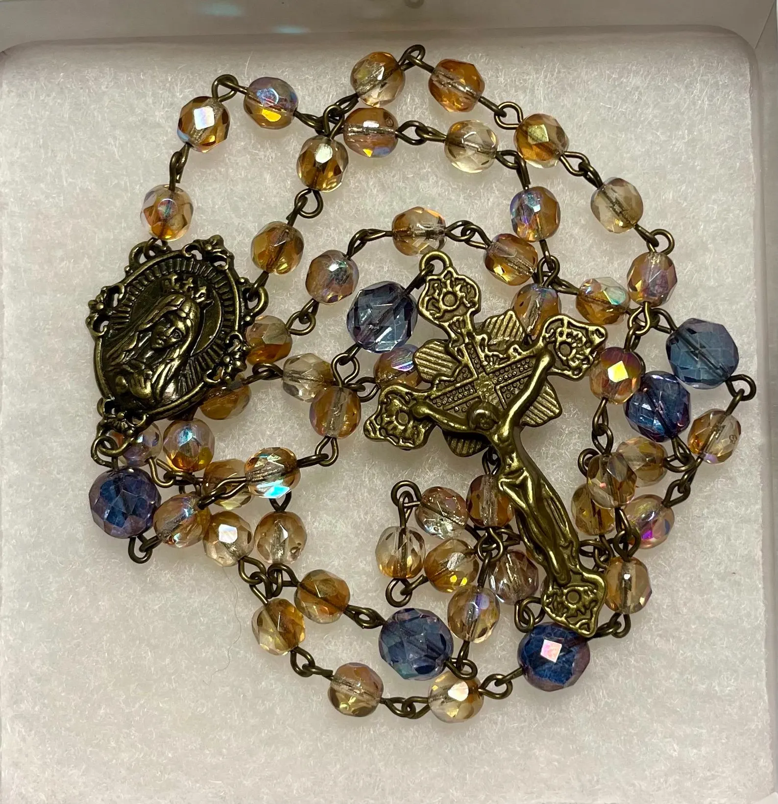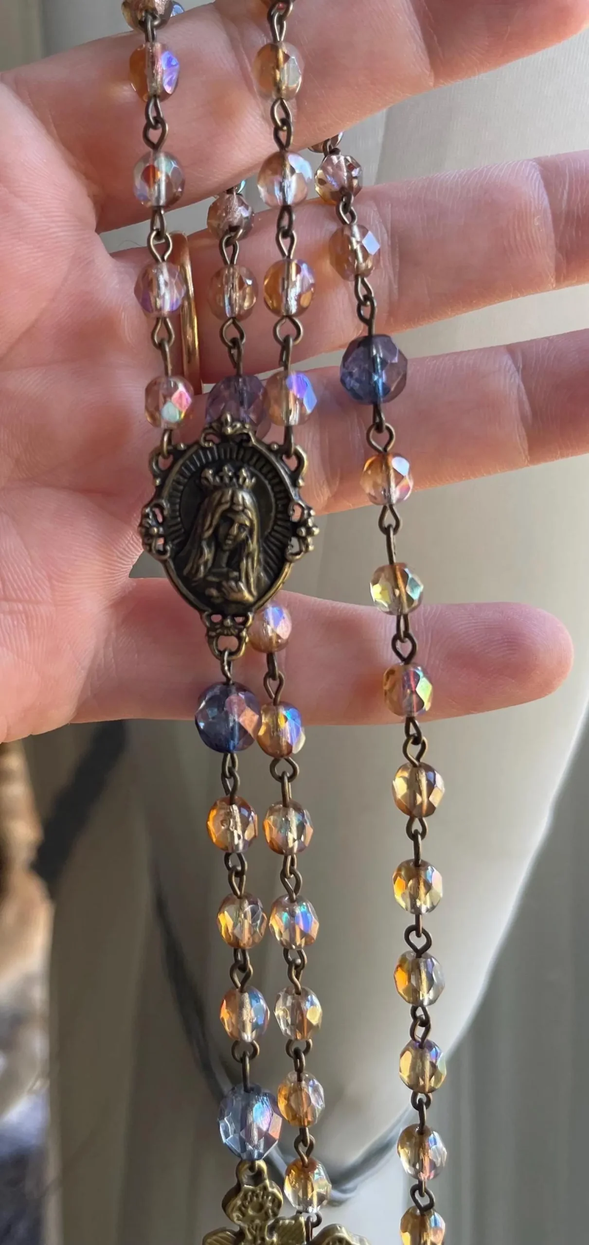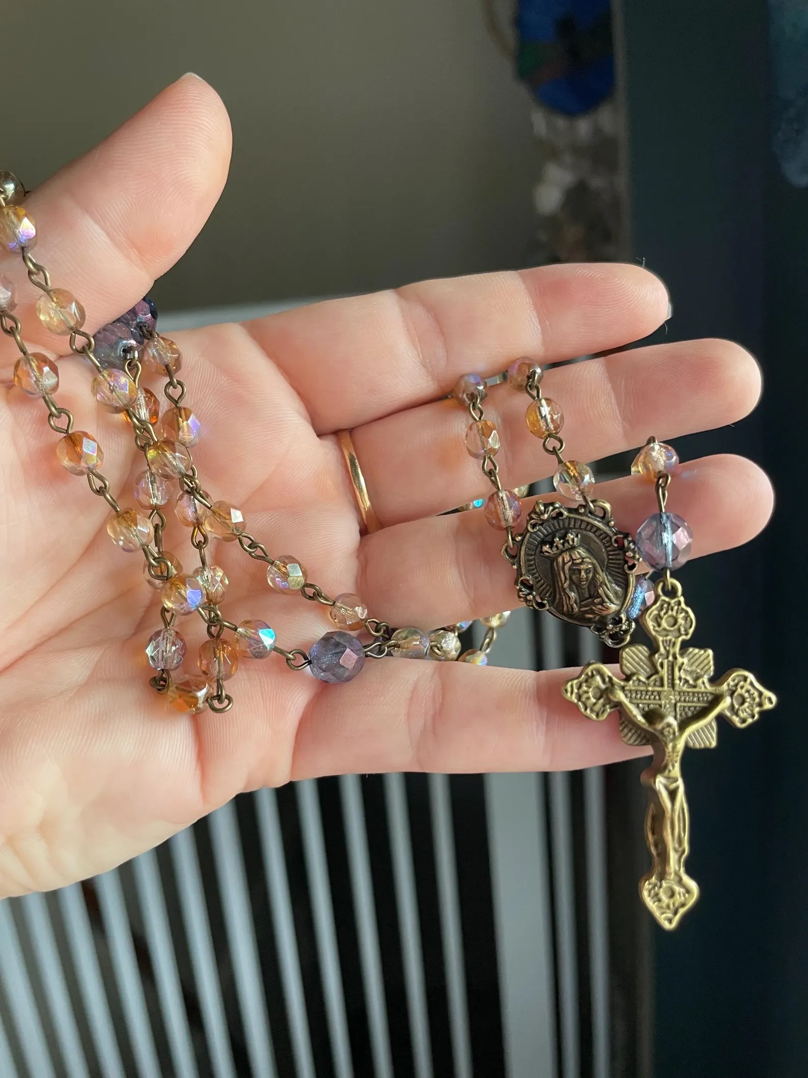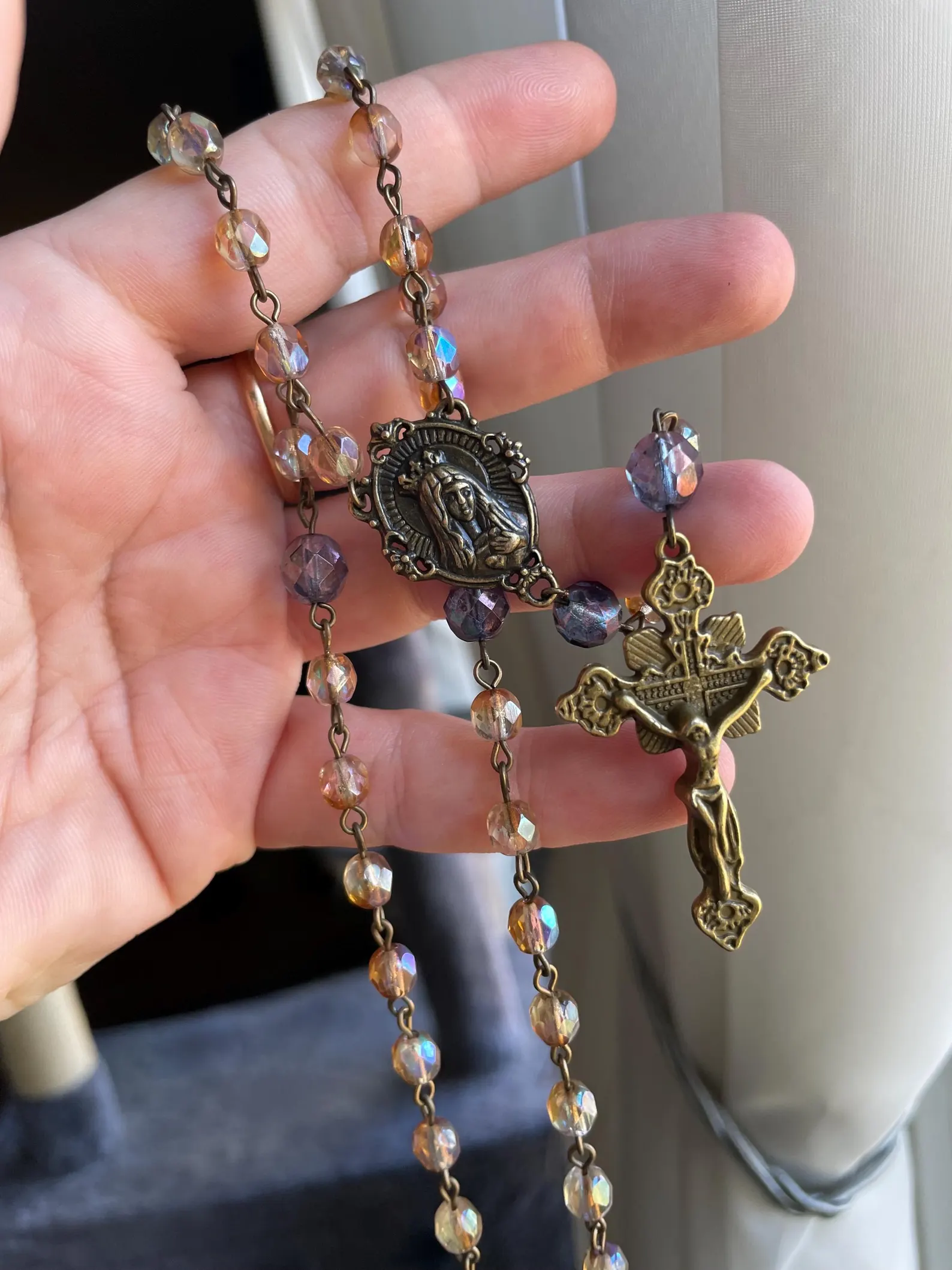 🪽Made from beautiful iridescent gold and purple Czech glass beads. The crucifix and connector are a goldish bronze.