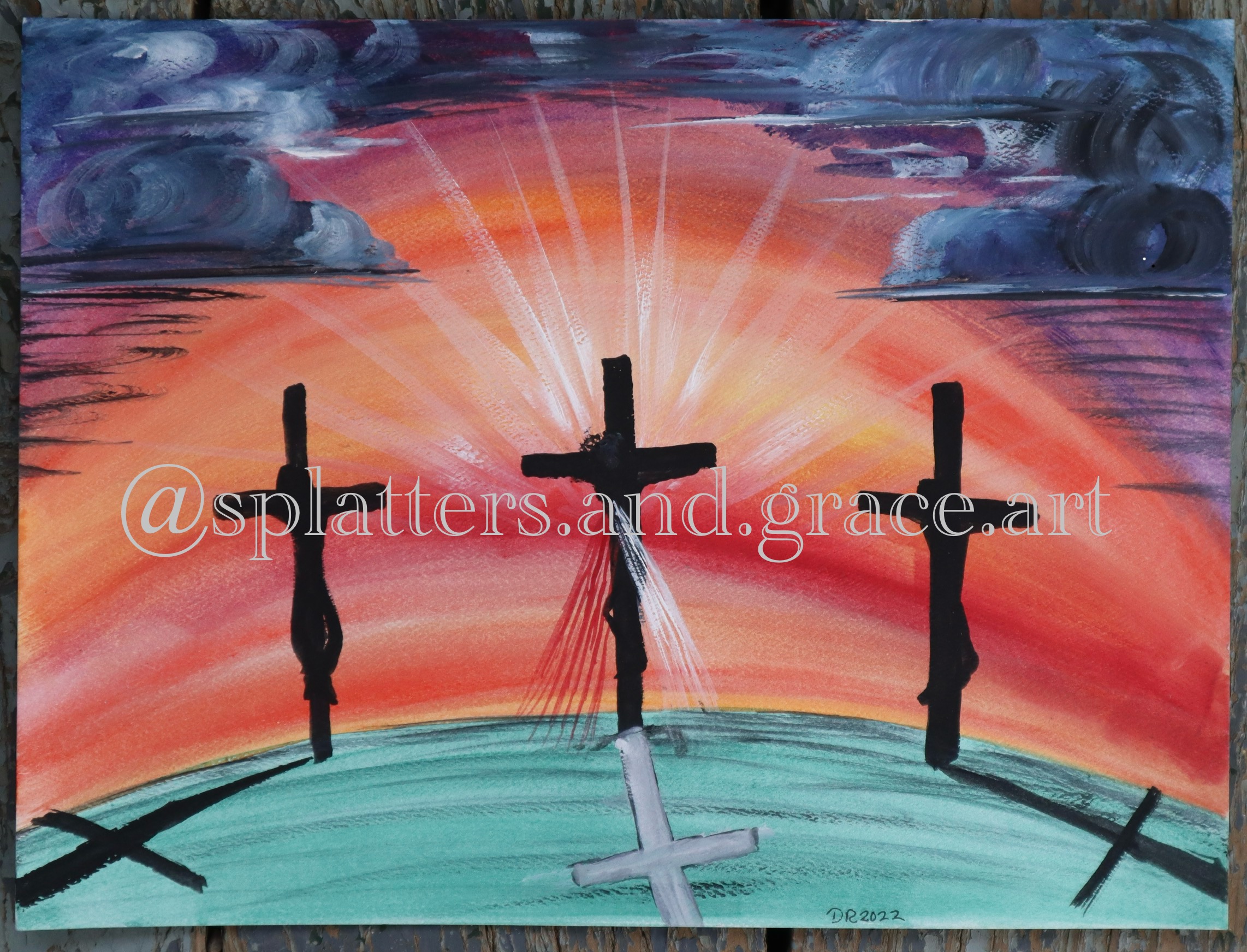 A fine art print of the original watercolor painting of the three crosses silhouetted against a red-orange sky on Good Friday. The center cross shows the rays of Divine Mercy coming from the side of Jesus. Printed on 245g textured water color fine art paper that is made from poly cotton fiber and is acid free and lignen free.