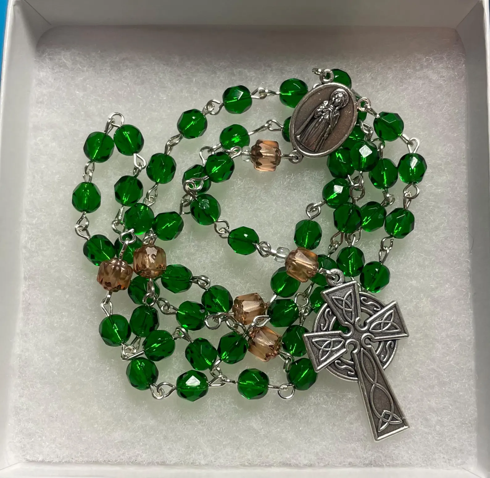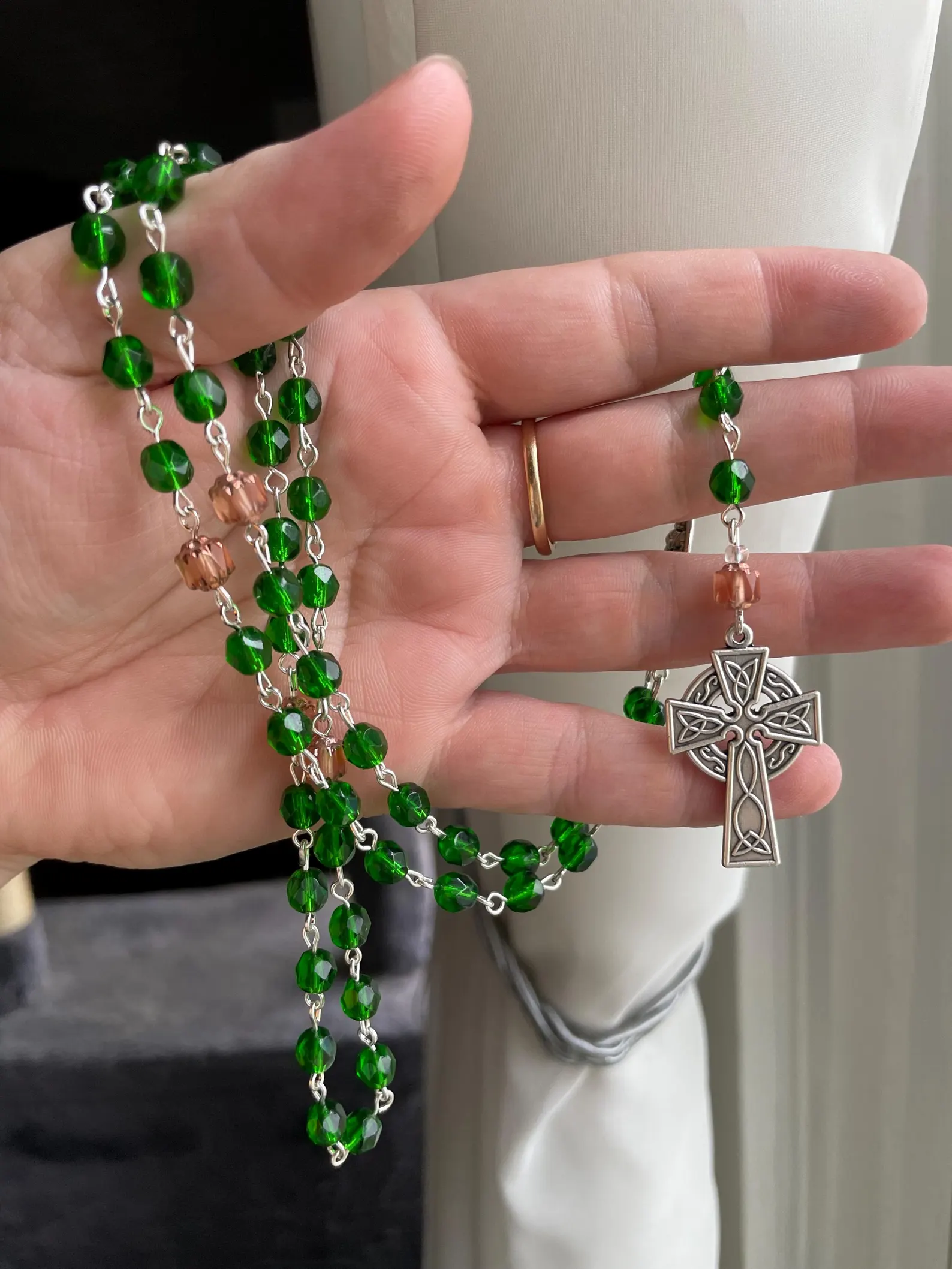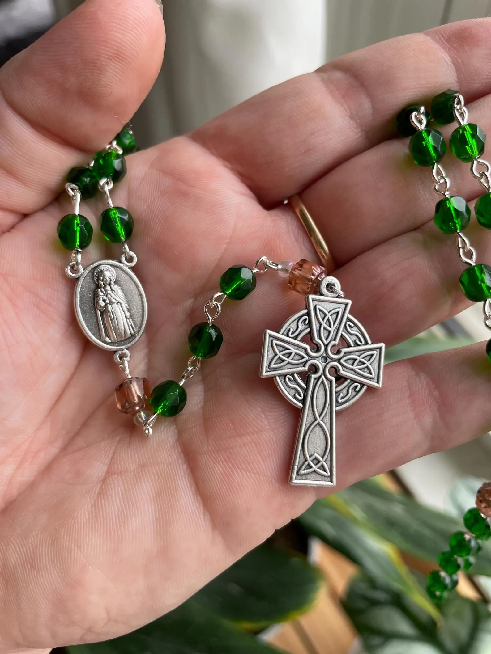 Green and Peach Czech Glass Handmade Rosary – St. Marnock