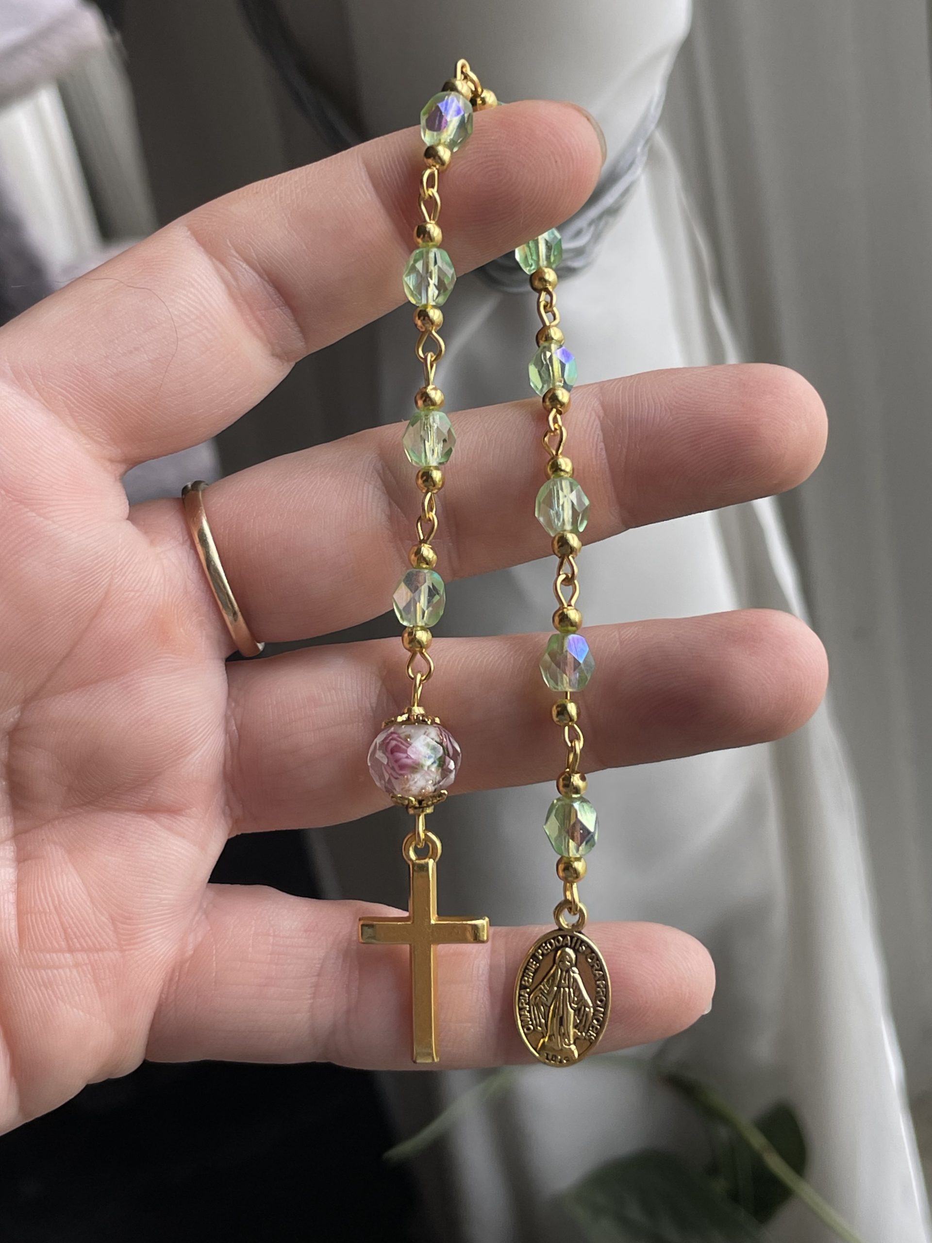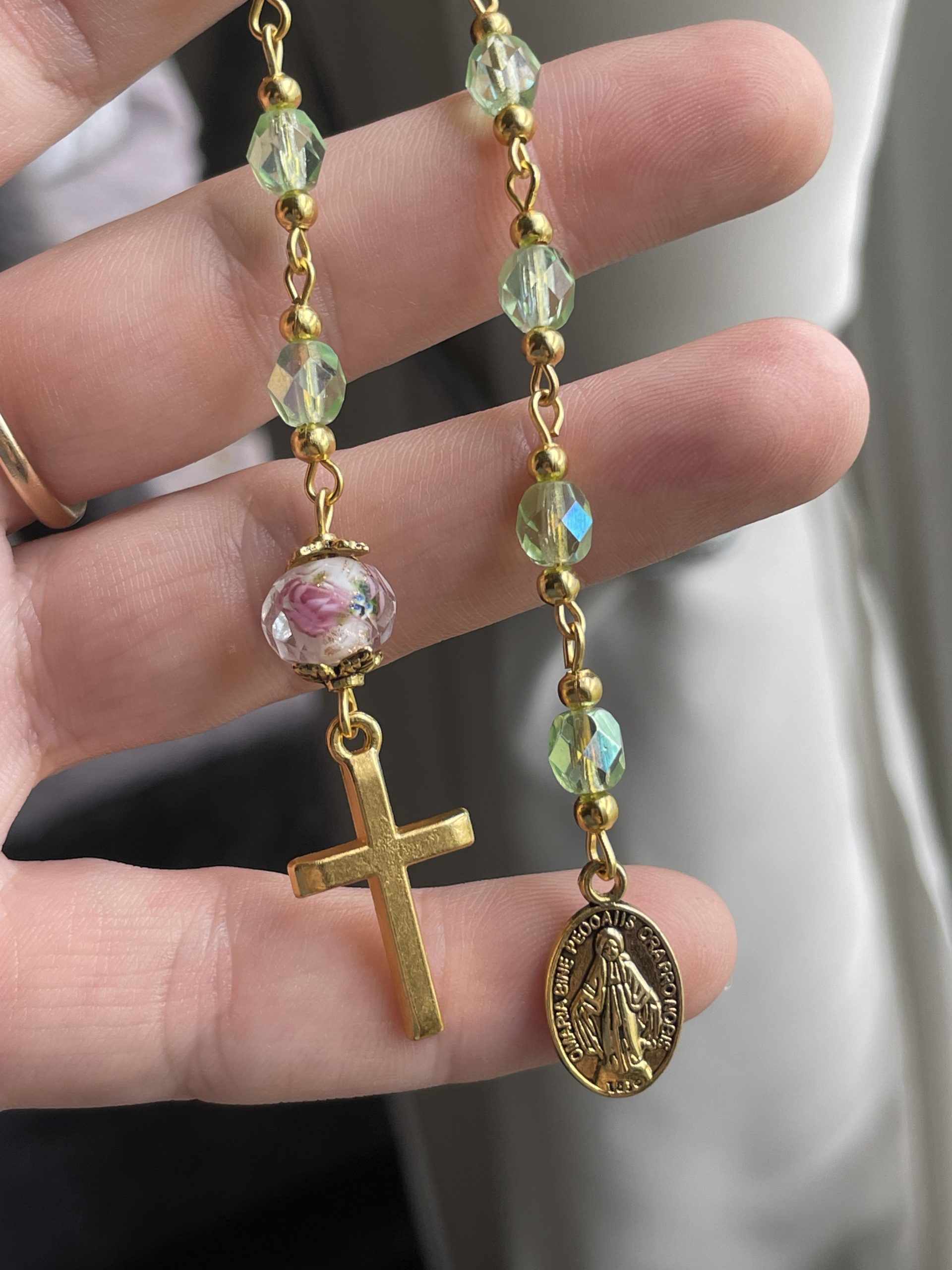 🪽This is a single decade rosary – a bit more compact than traditional rosaries, and perfect for prayer on the go. This decade is made from flashy lime green Czech glass beads, and a floral glass Our Father bead. The crucifix and medal are a brushed gold finish.