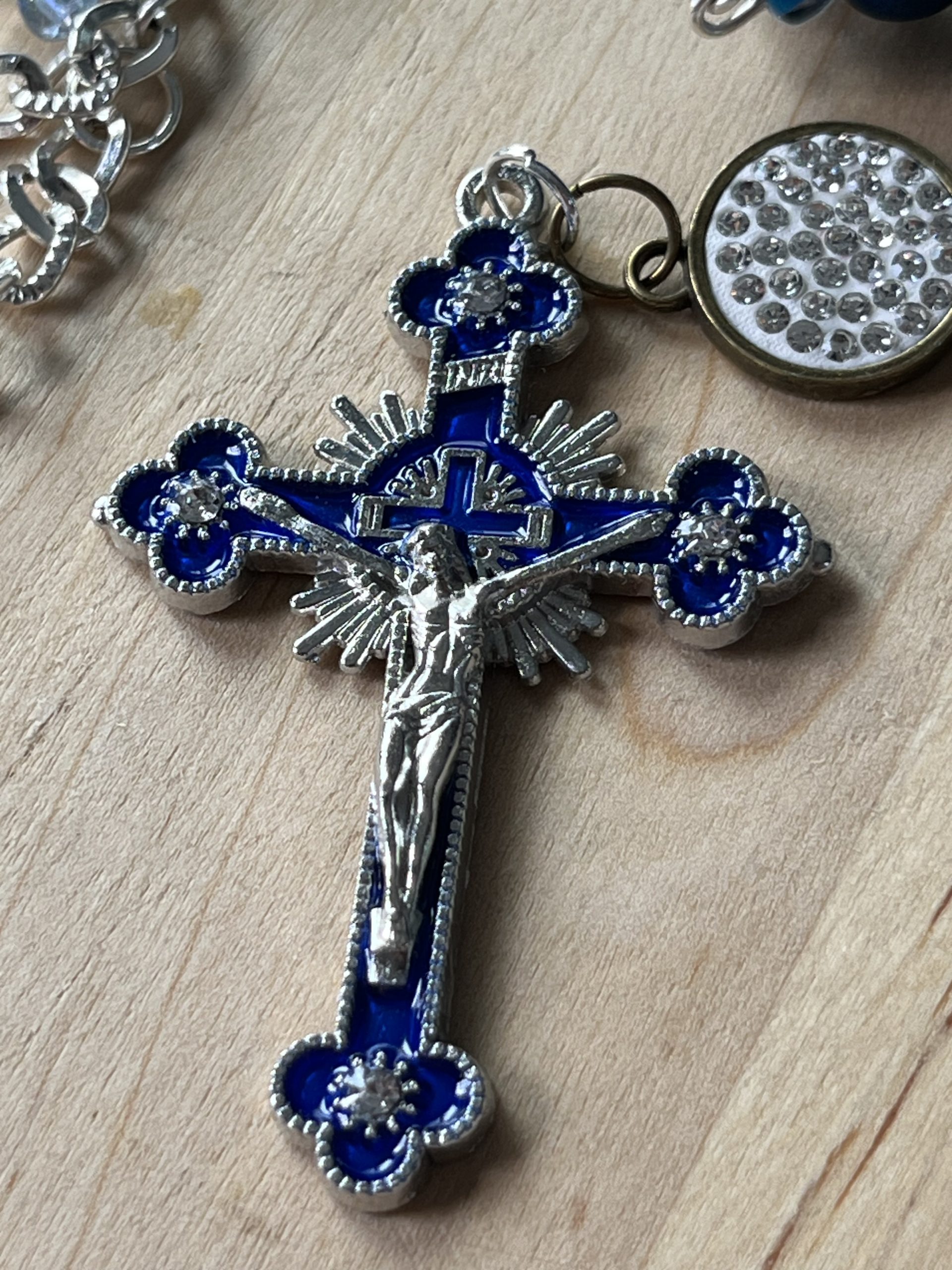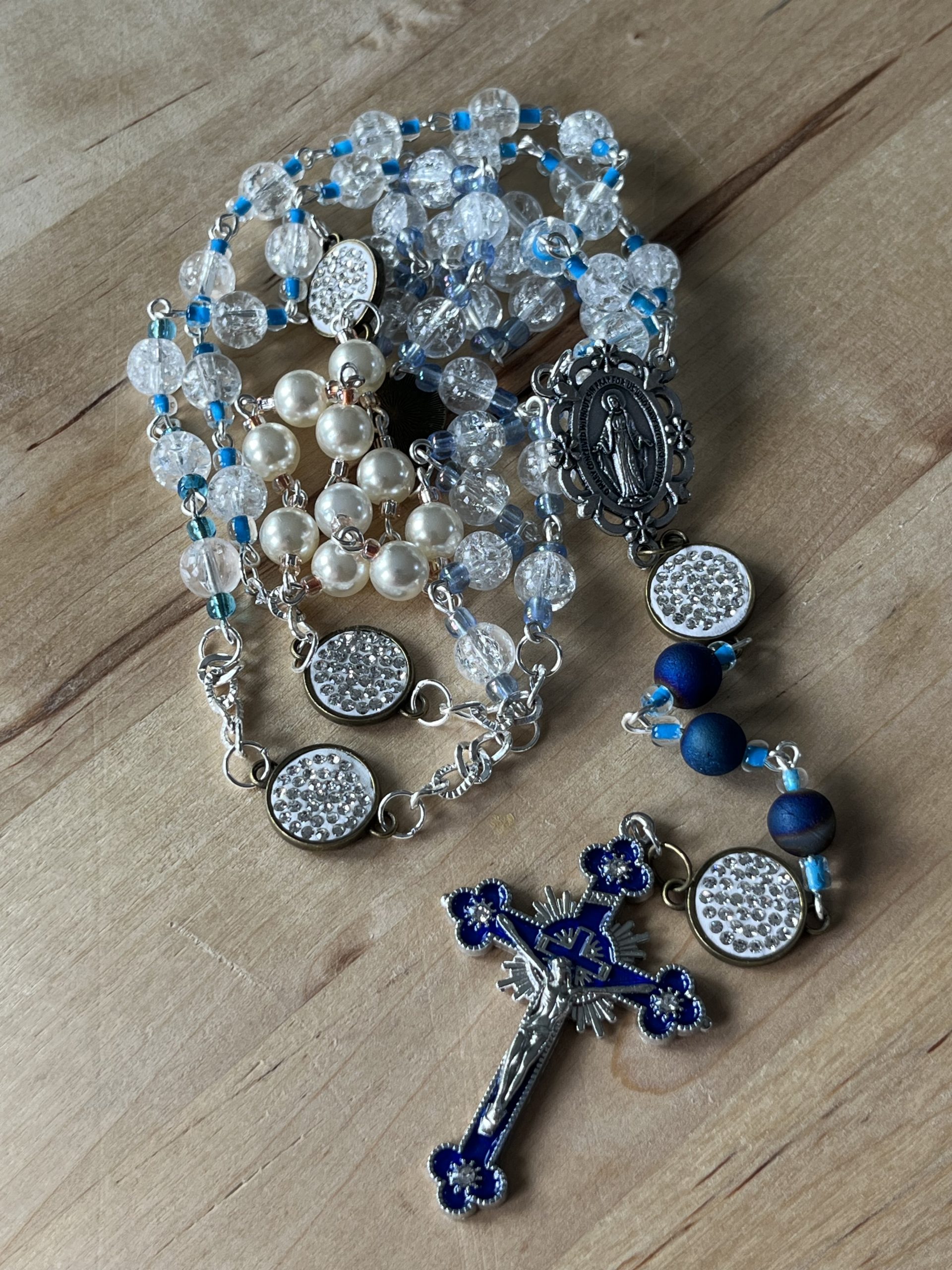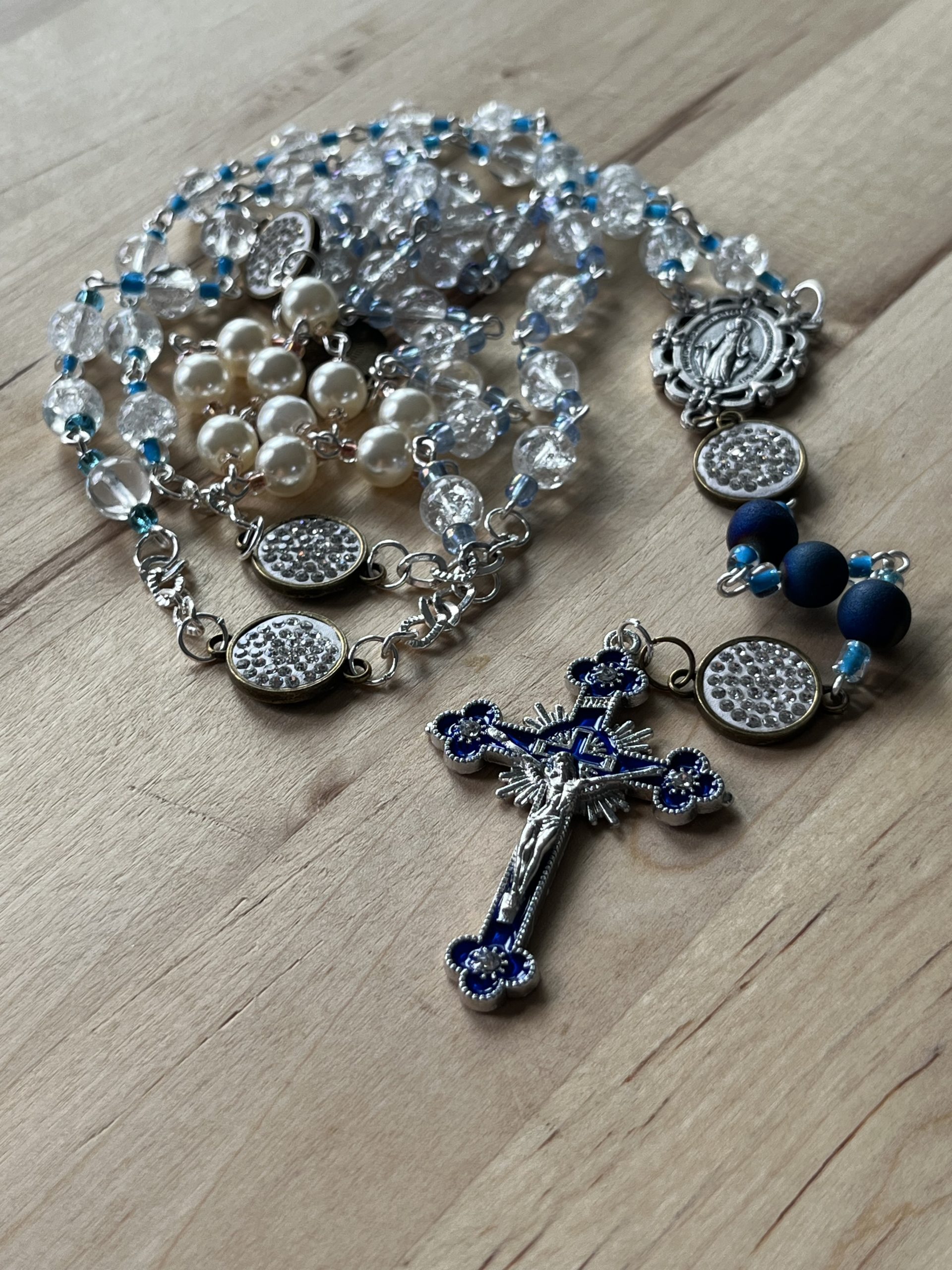 Handmade Glass Crystal Rosary: Blue Accents, Rhinestone Beads, Miraculous Medal