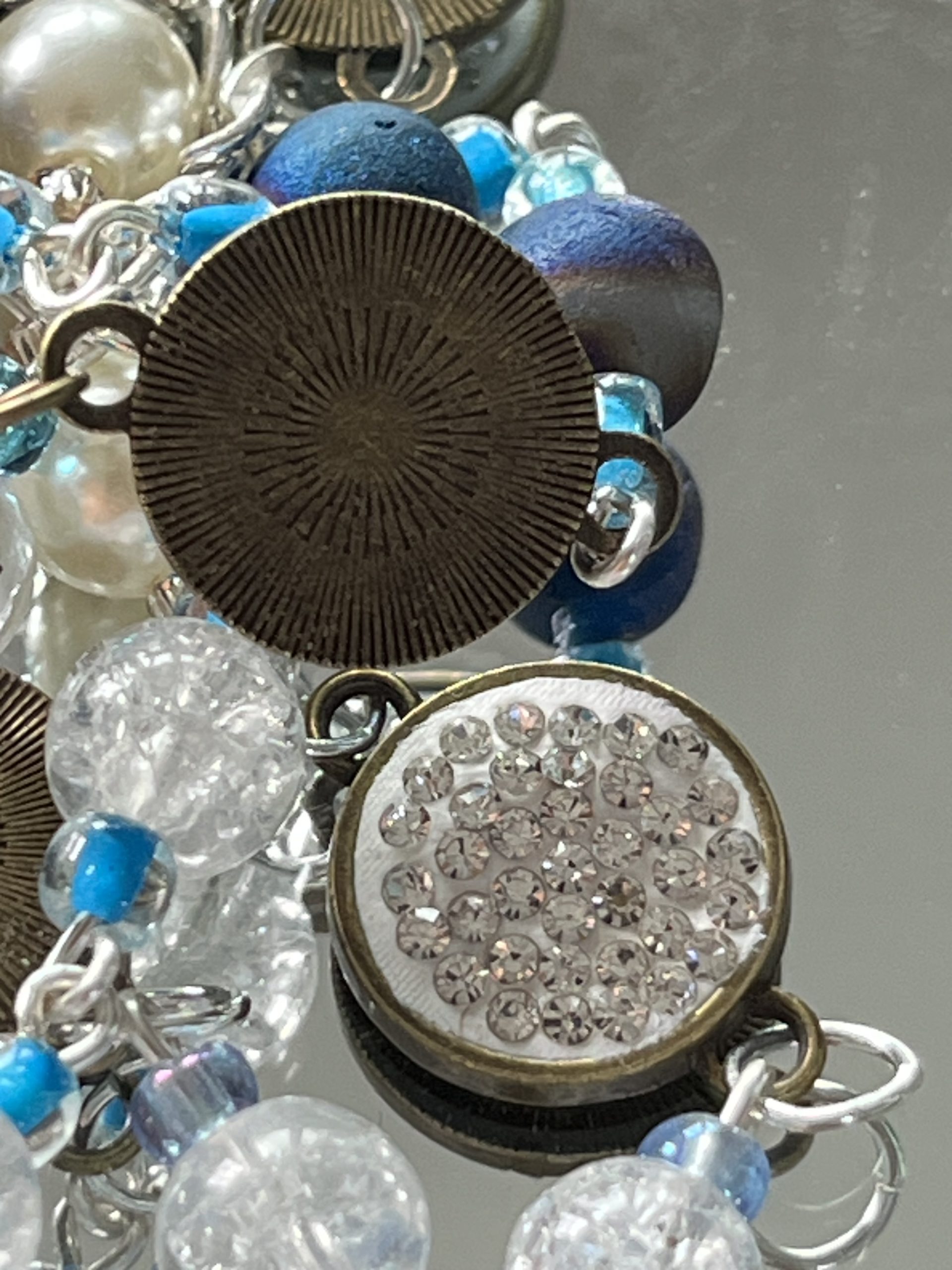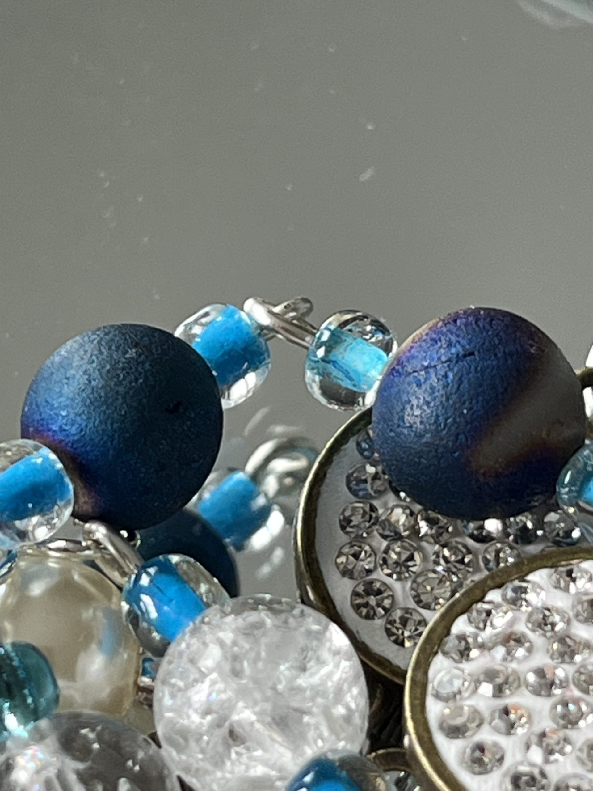 • Clear crackle glass beads paired with shimmering blue spacers