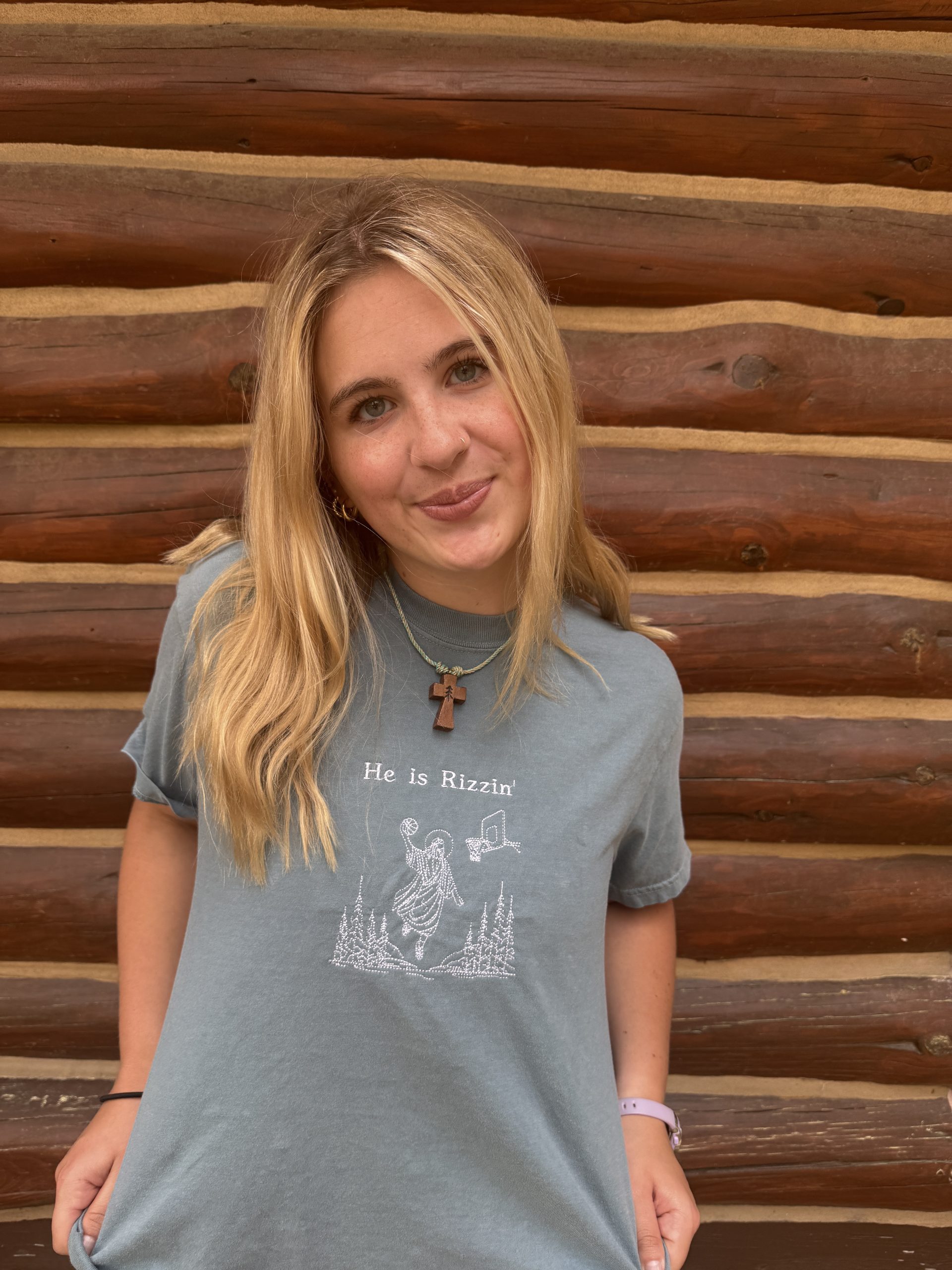 Add some holy humor to your wardrobe with this denim blue Comfort Colors tee, machine embroidered with “He is Rizzin’” and a one-of-a-kind image of Jesus dunking a basketball. Blending faith and fun, this design is a playful nod to the Resurrection—and a reminder that Jesus really has the ultimate Rizz.