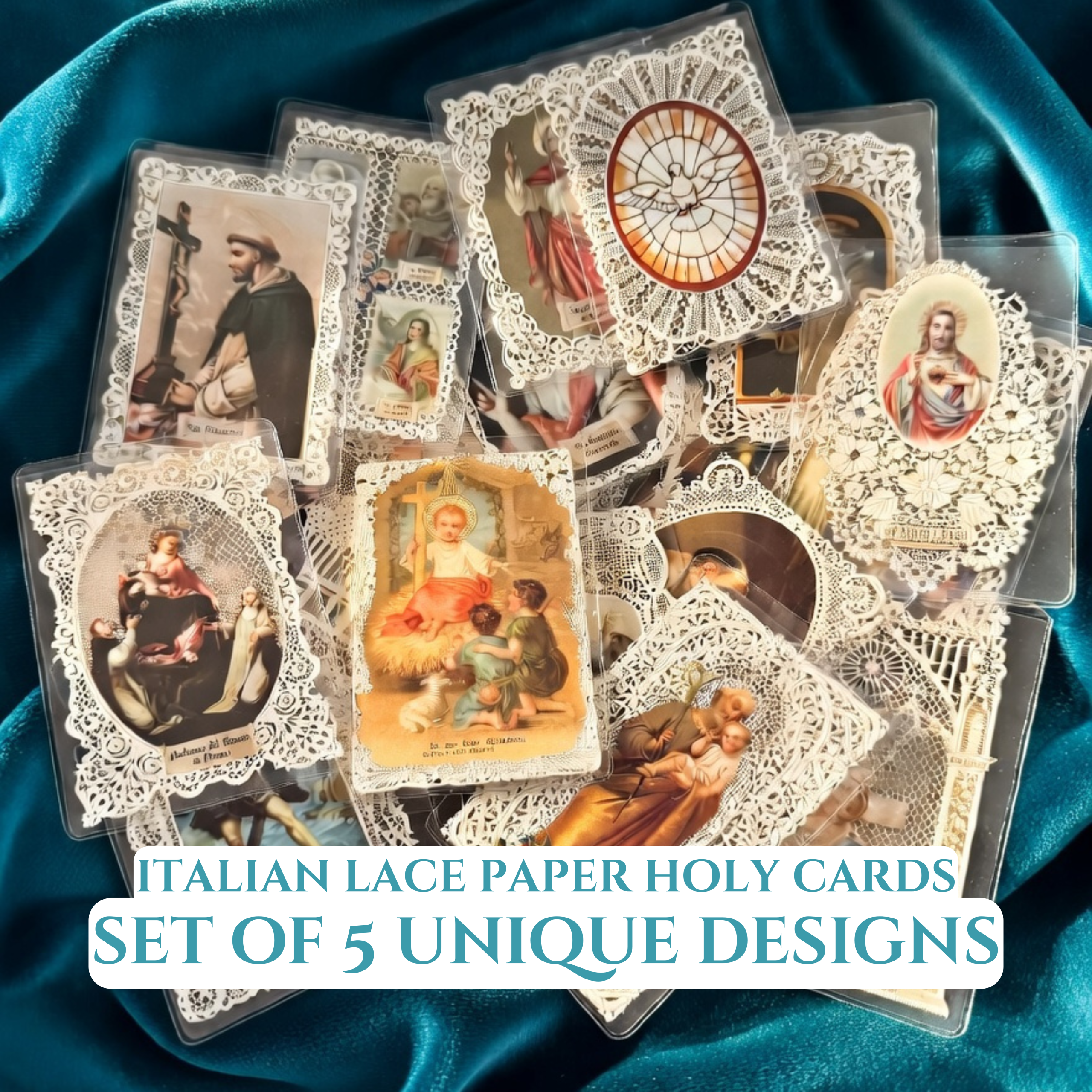 A prayerfully curated set of five premium Italian lace-edge holy cards, selected from our larger collection and thoughtfully assembled for daily Catholic devotion.