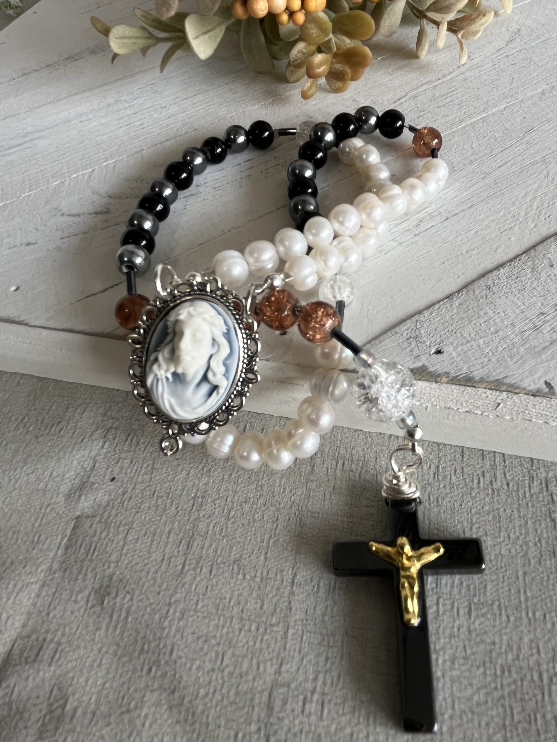 Jesus Thorns Cameo Rosary: Freshwater Pearl & Black Gemstone Prayer Beads