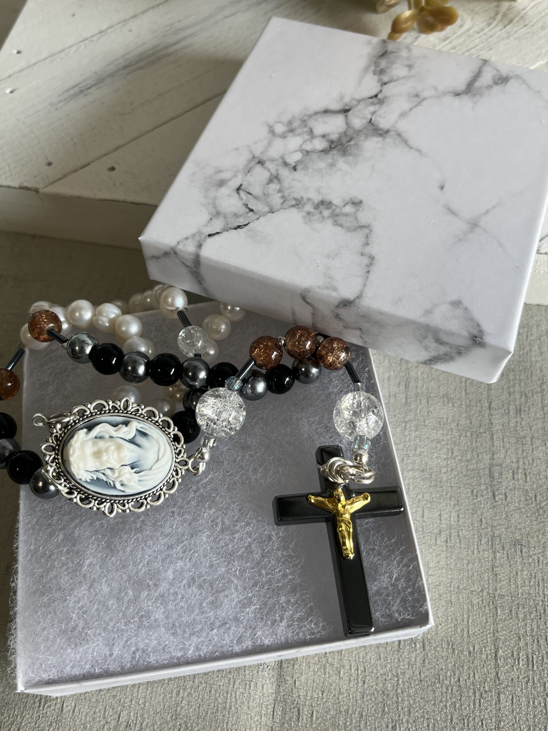 This rosary features a stunning 3D Jesus Thorns Cameo centerpiece and exquisite 8mm freshwater pearls, paired with black agate gemstones and dark grey acrylic beads.