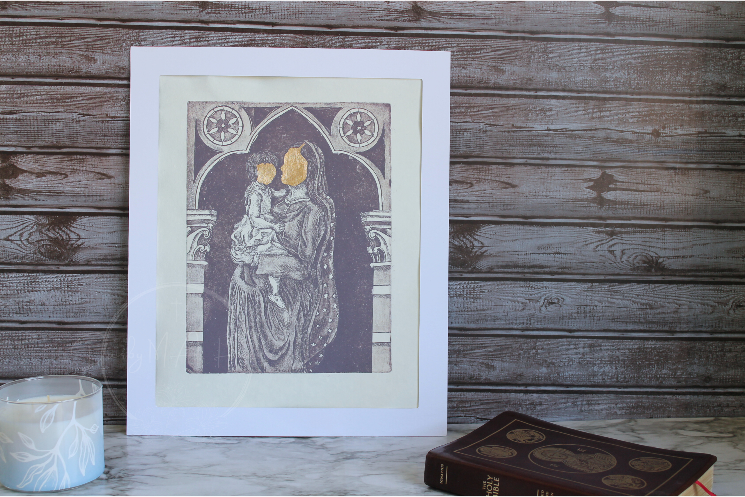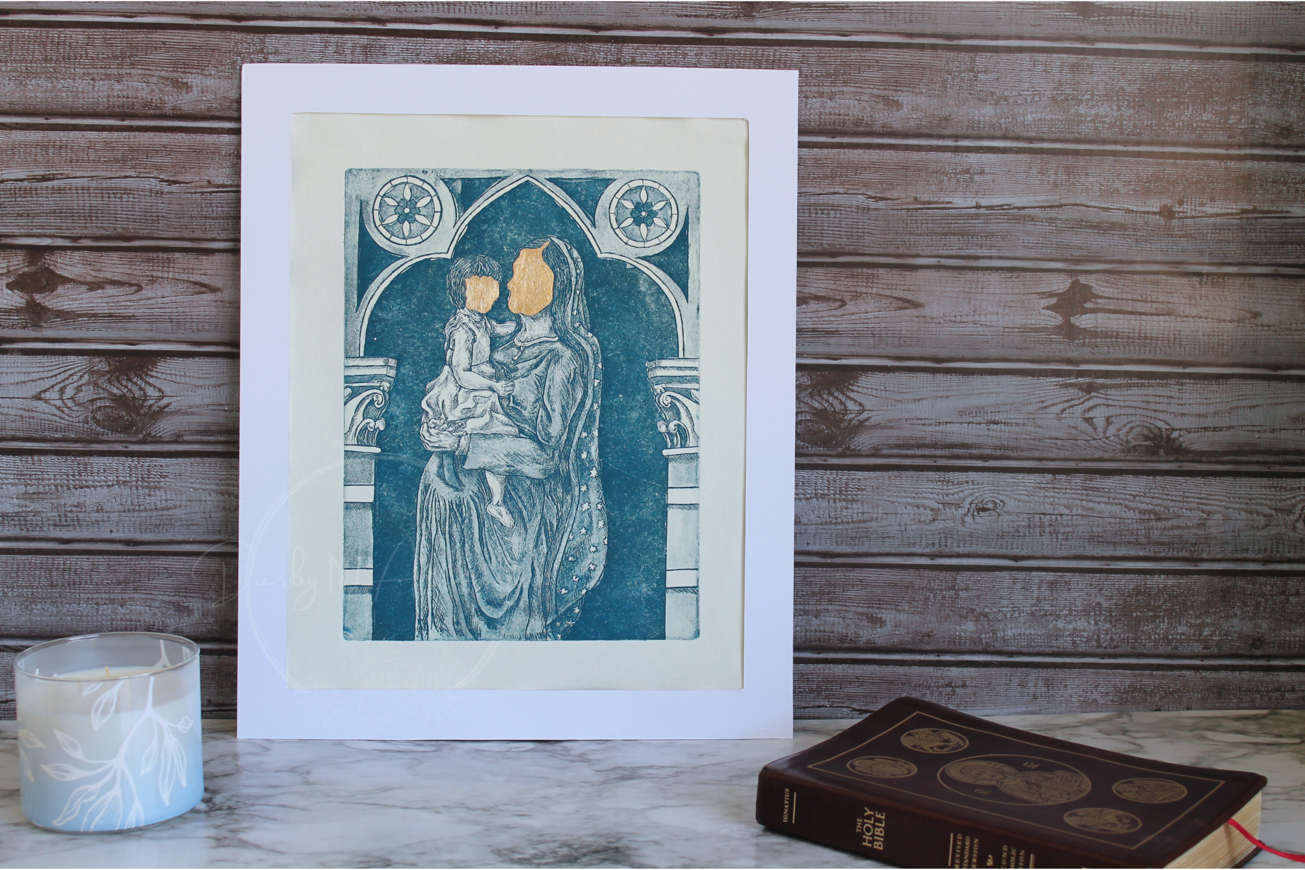 Each 13″x15″ print is crafted on deckled-edge paper, giving it a timeless, handcrafted feel. The face of Our Lady and the child is highlighted with delicate gold gilding, adding a luminous, reverent glow. Choose from three stunning color options—blue, red, or grey—allowing you to select the tone that best complements your space or collection.