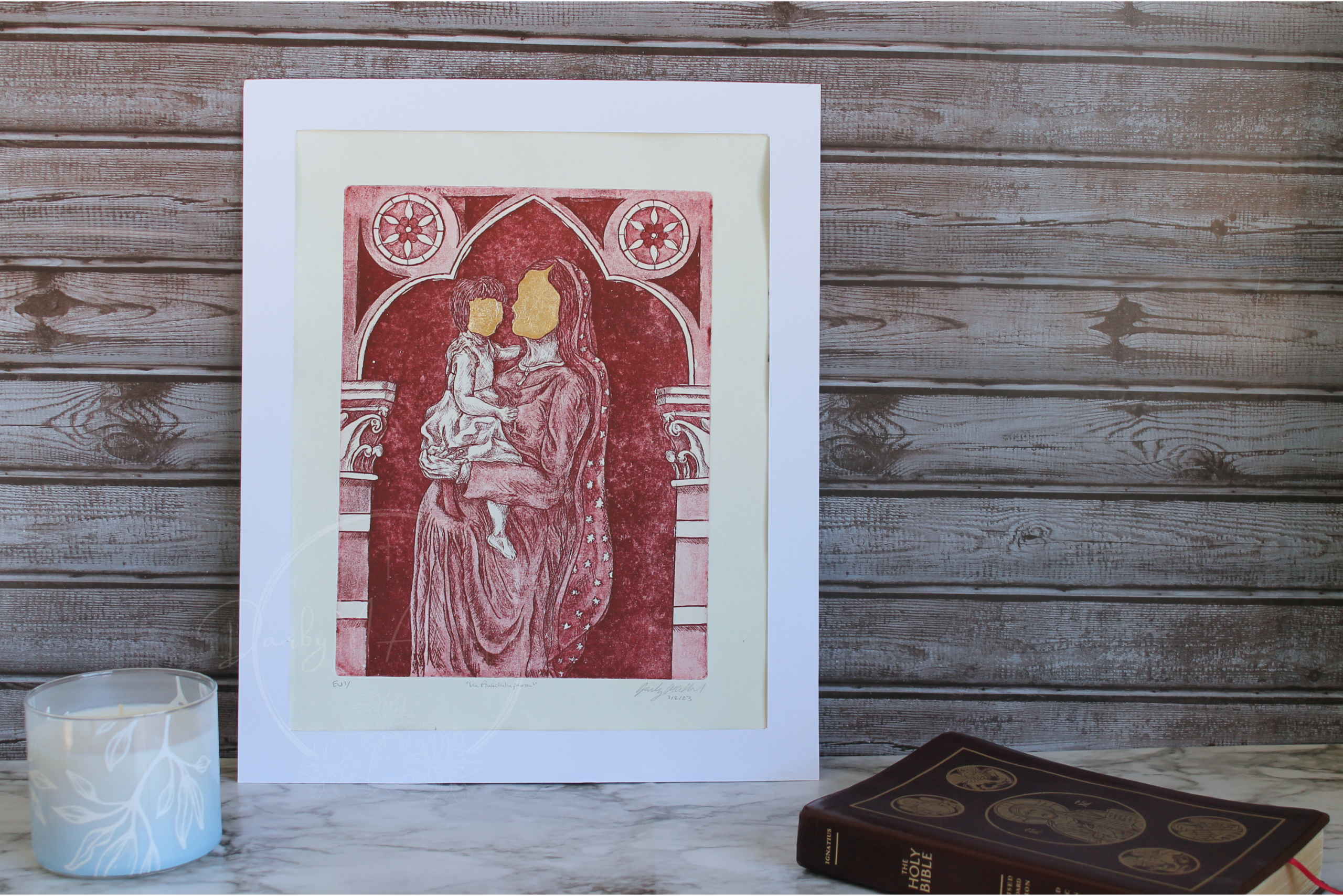 Celebrate devotion and artistry with La Guadalupana (Our Lady of Guadalupe), an exquisite intaglio art print that reimagines Our Lady of Guadalupe as both mother and comforter. This unique depiction shows the Blessed Virgin pregnant with Jesus while tenderly holding a small child, blending sacred symbolism with intimate, human warmth.