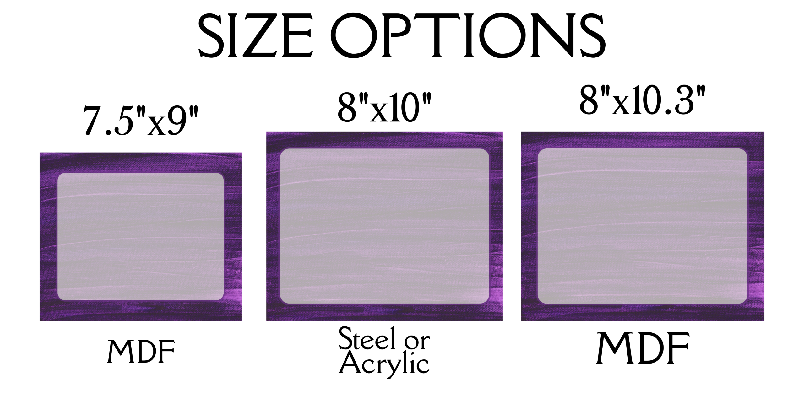 Board options (all are approximately 1/8″ thick, dimensions may differ slightly due to heat press shrinkage):