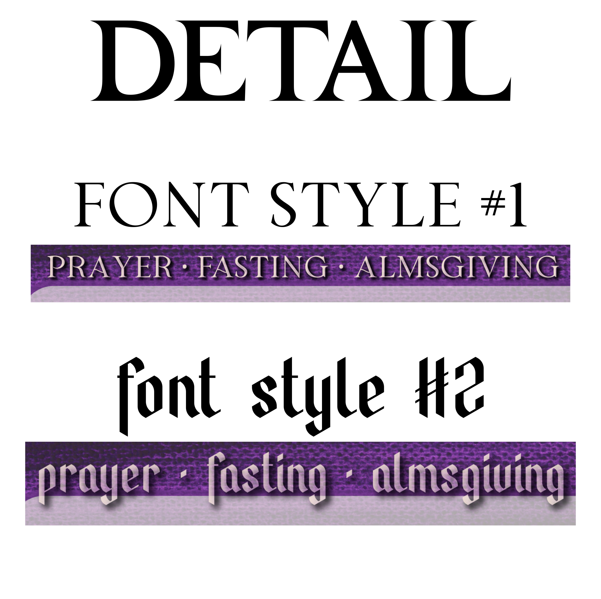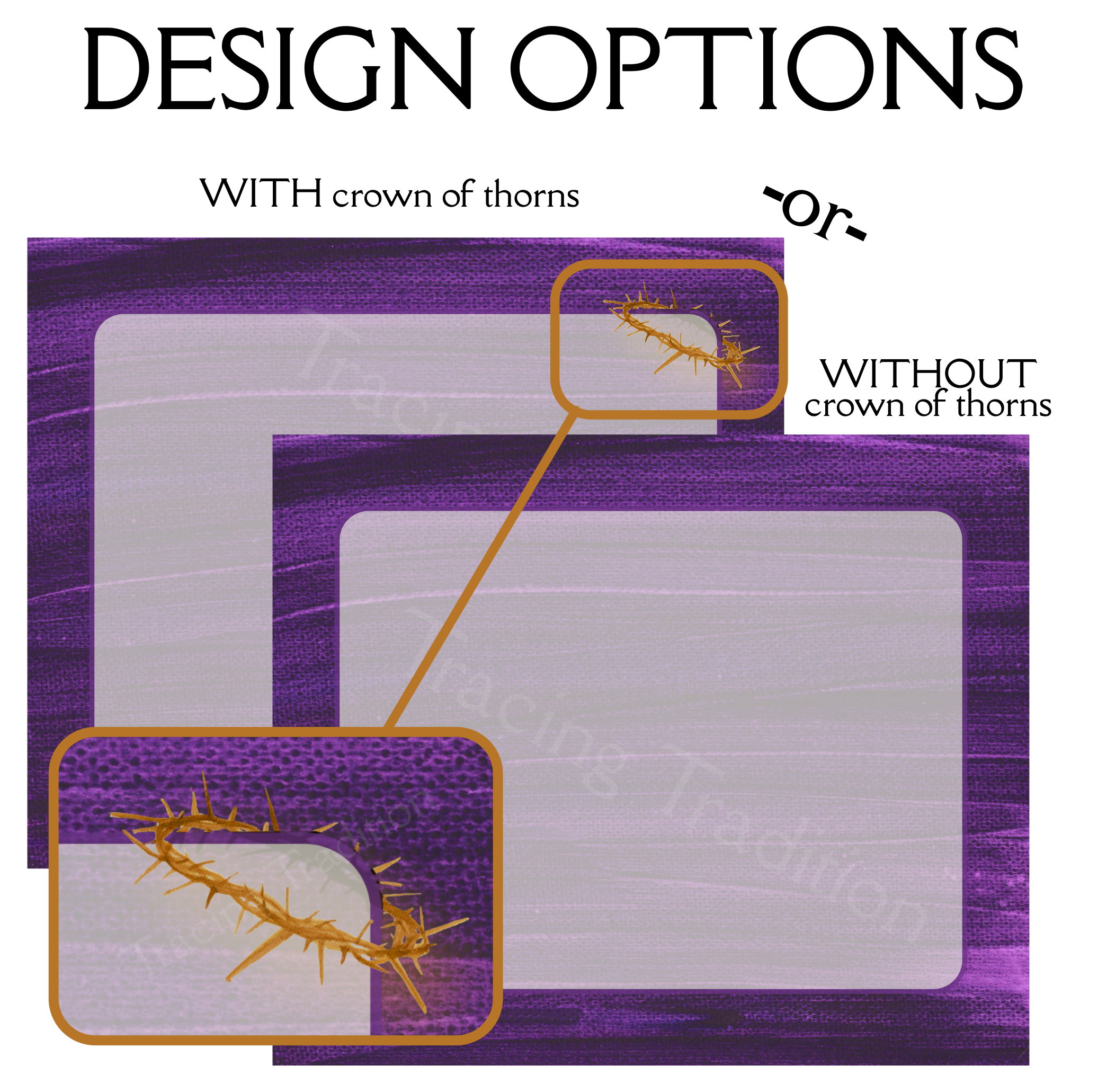 You have these main design options: two font options (one in an elegant, simple all-capital font, and the other a more calligraphic-style) and the inclusion or exclusion of a hand-drawn watercolor crown of thorns “hanging” on the upper write corner of the writing area. A pragmatic resource you can use Lenten season after Lenten season for years to come.