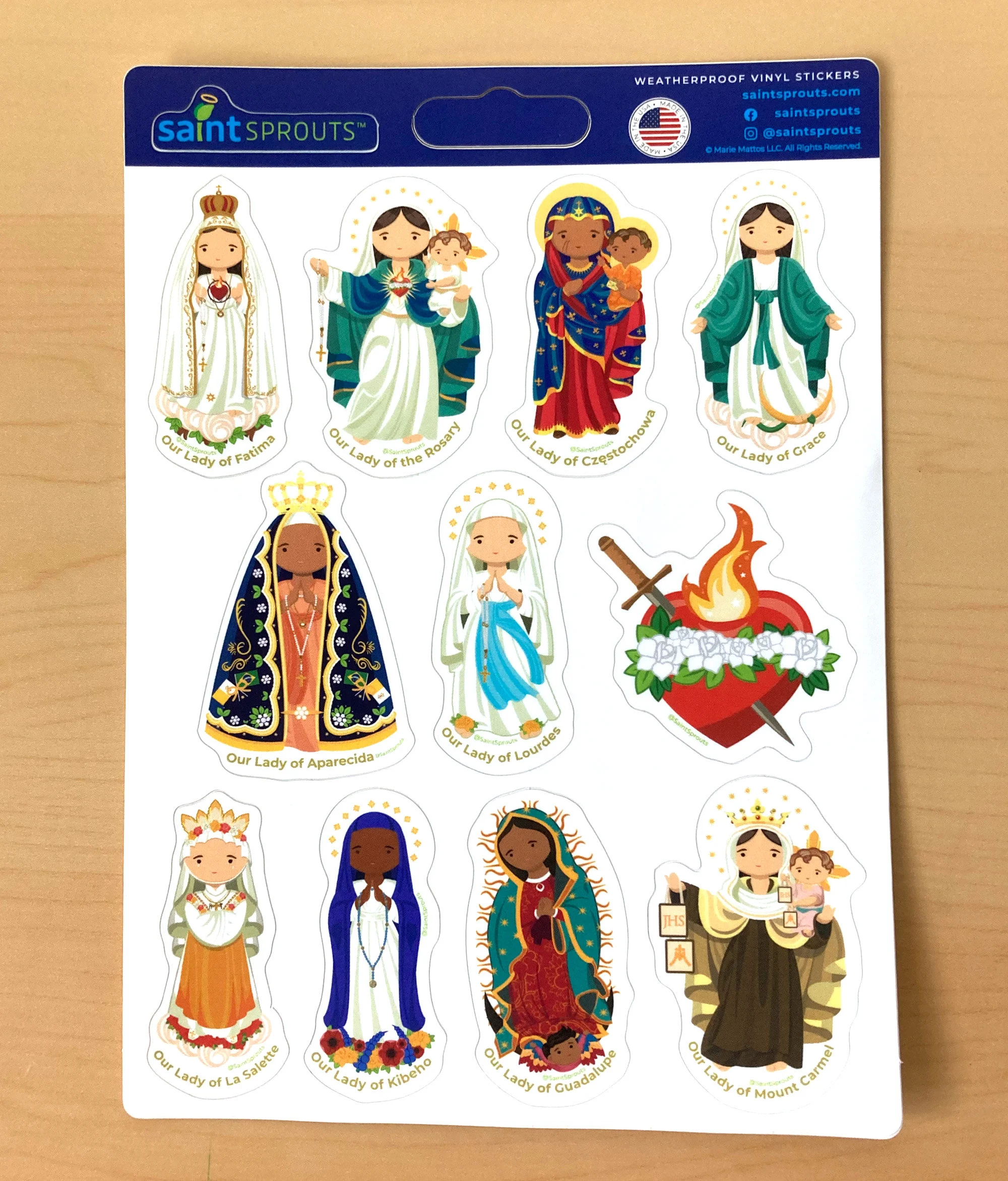 Bring Marian devotion into daily life with this beautiful sticker sheet featuring 11 beloved apparitions. Perfect for water bottles, laptops, journals, and planners—each illustration inspires prayer and reflection.
