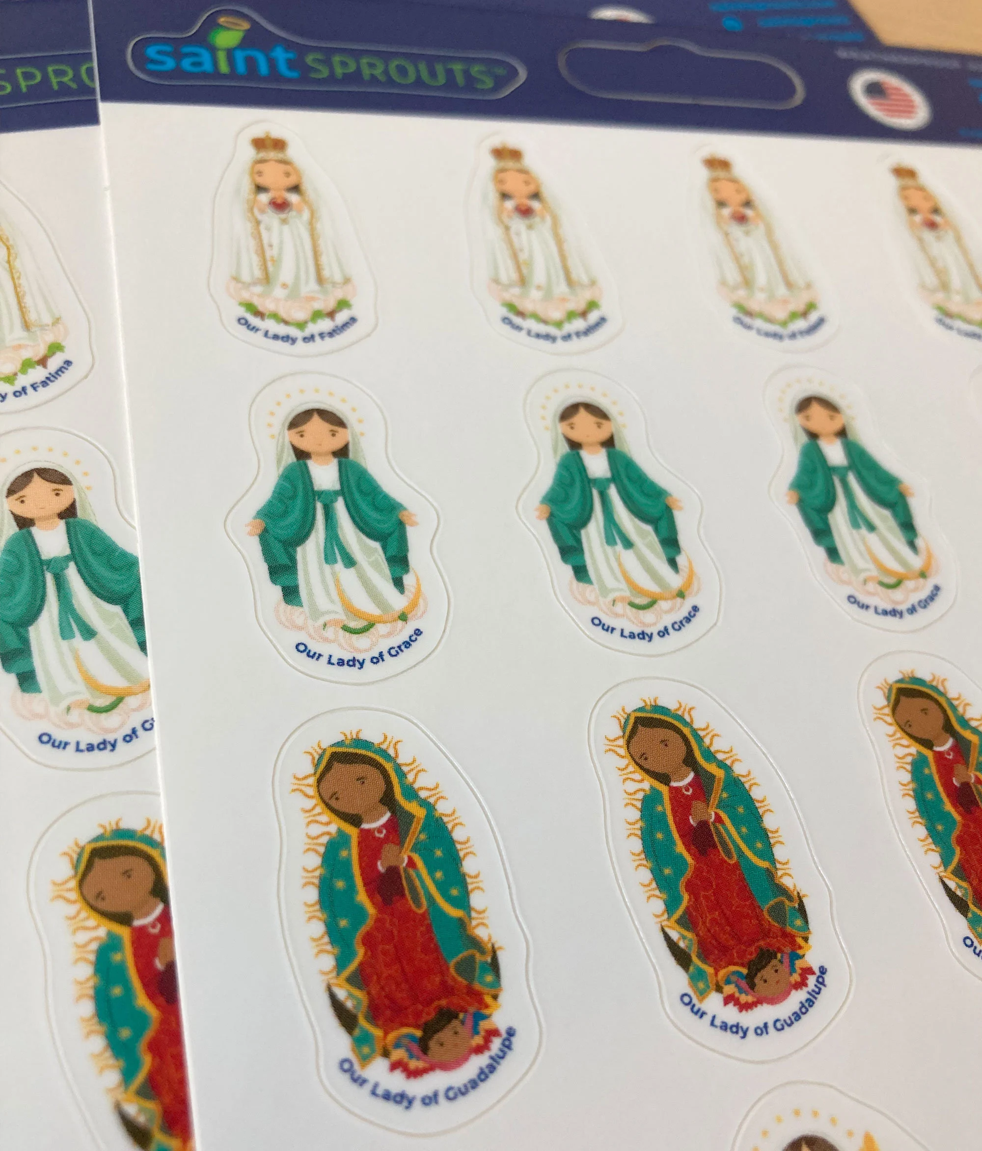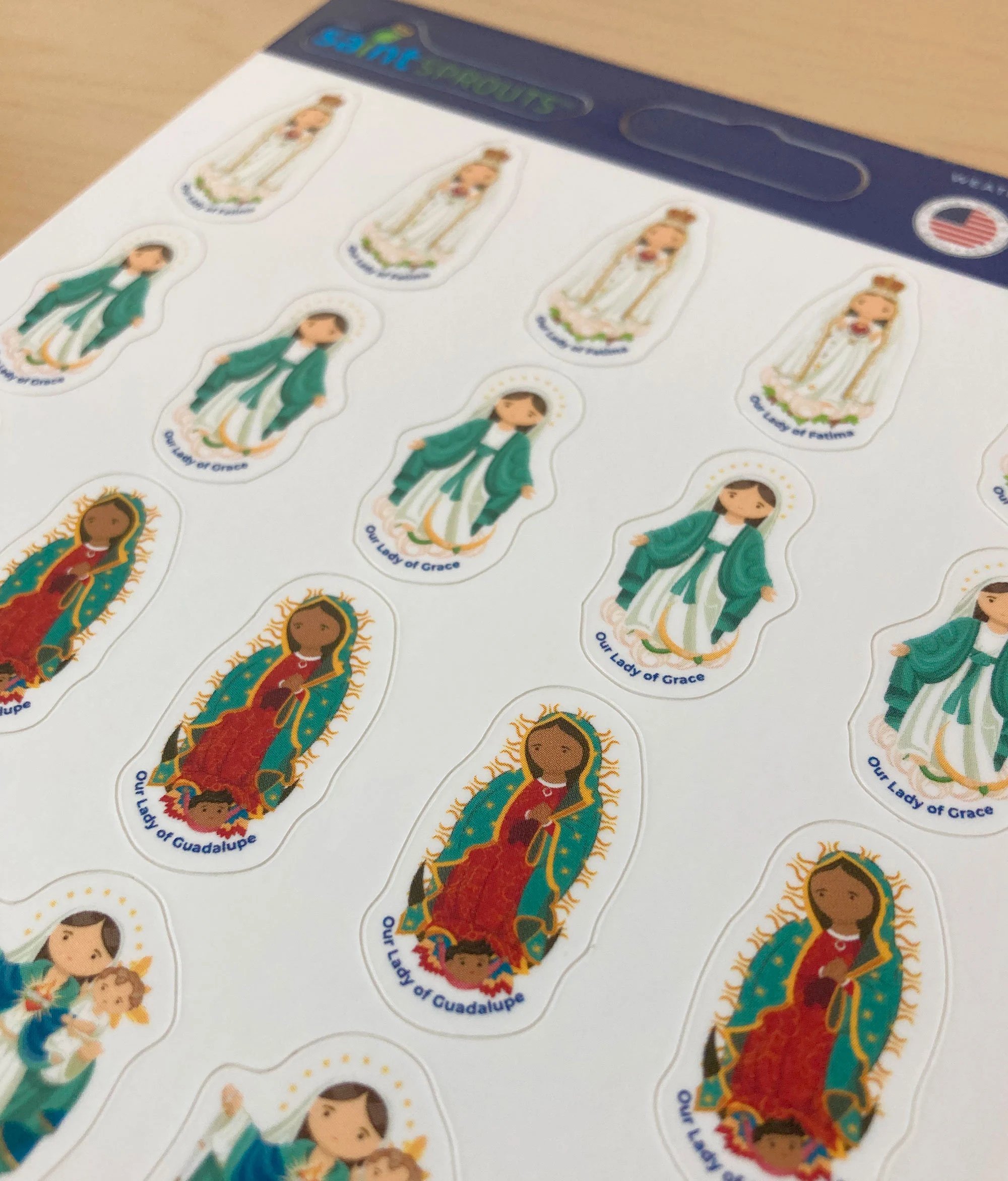 Beautifully curated Marian sticker sheet featuring five beloved apparitions with five stickers each—perfect for sharing or decorating journals, planners, water bottles, and more. A creative way to welcome Our Lady into daily life.