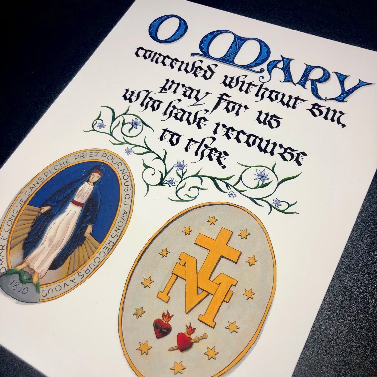 “Miraculous” is my own rendition of the Miraculous Medal. The front and back images of the medal are shown in full color, with vibrant blues and gold. On the left (front), Our Lady stands proud – stomping on the serpent, golden rays dazzling outward from her hands, surrounded by the French text “O MARIE CONCUE SANS PECHE PRIEZ POUR NOUS QUI AVONS RECOURS A VOUS”; the English translation hangs above “O Mary, conceived without sin, pray for us who have recourse to thee.” On the right, the back side of the Miraculous Medal – an intertwined Cross and ‘M’, with the Sacred Heart of Jesus and Immaculate Heart of Mary, surrounded by 12 stars. The text and image are accompanied by a vine of white lilies, symbolizing the purity of Our Lady’s Immaculate Conception.