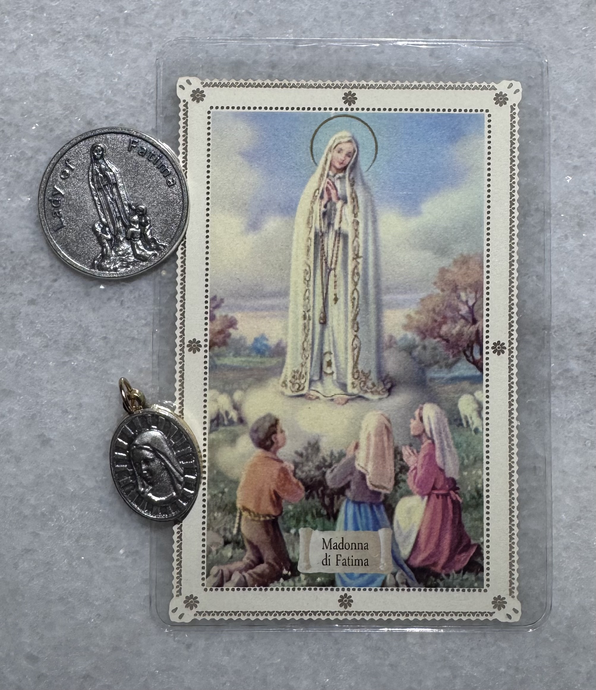 Silver-tone Coin • Fatima Earth Medal • Lace Holy Card