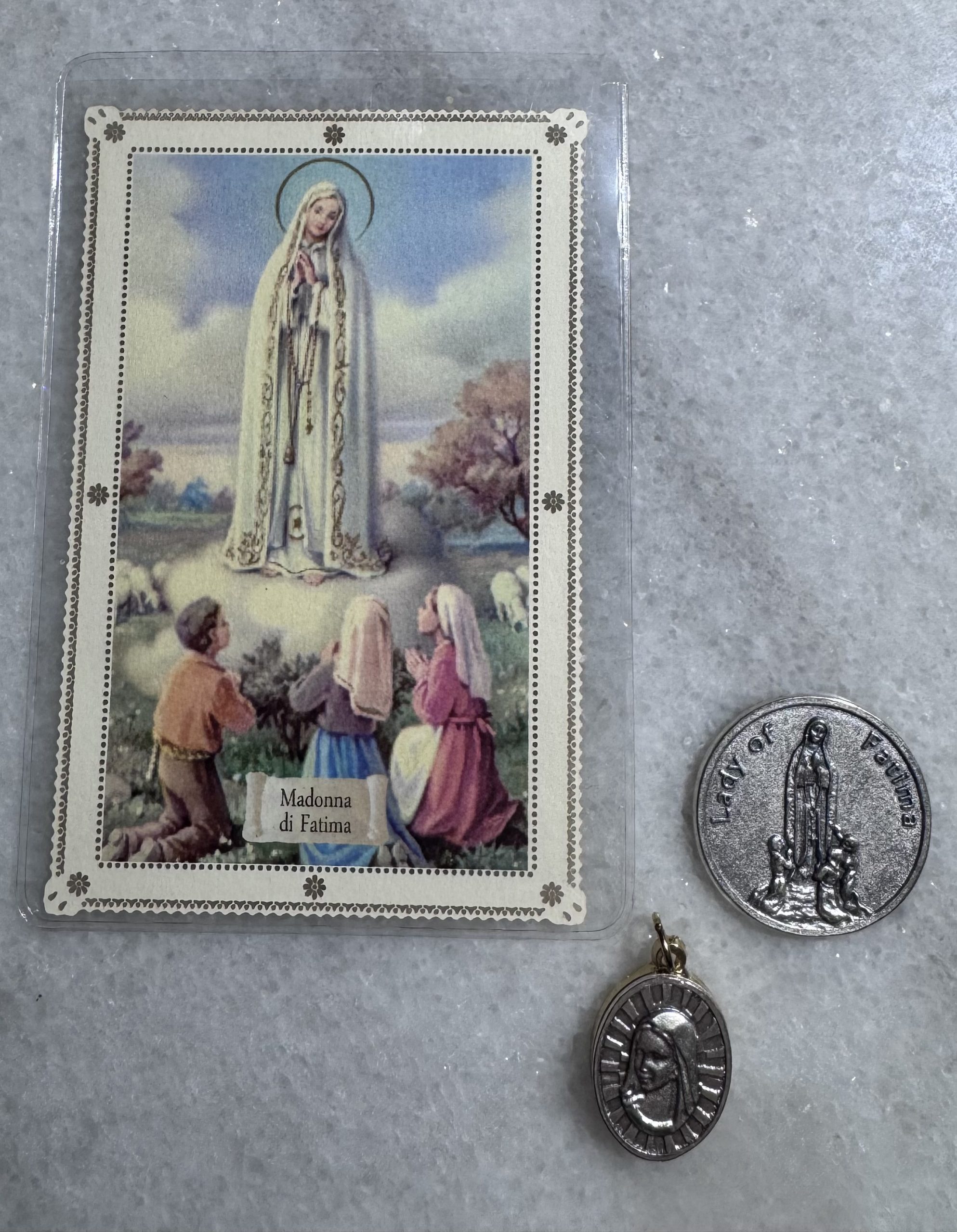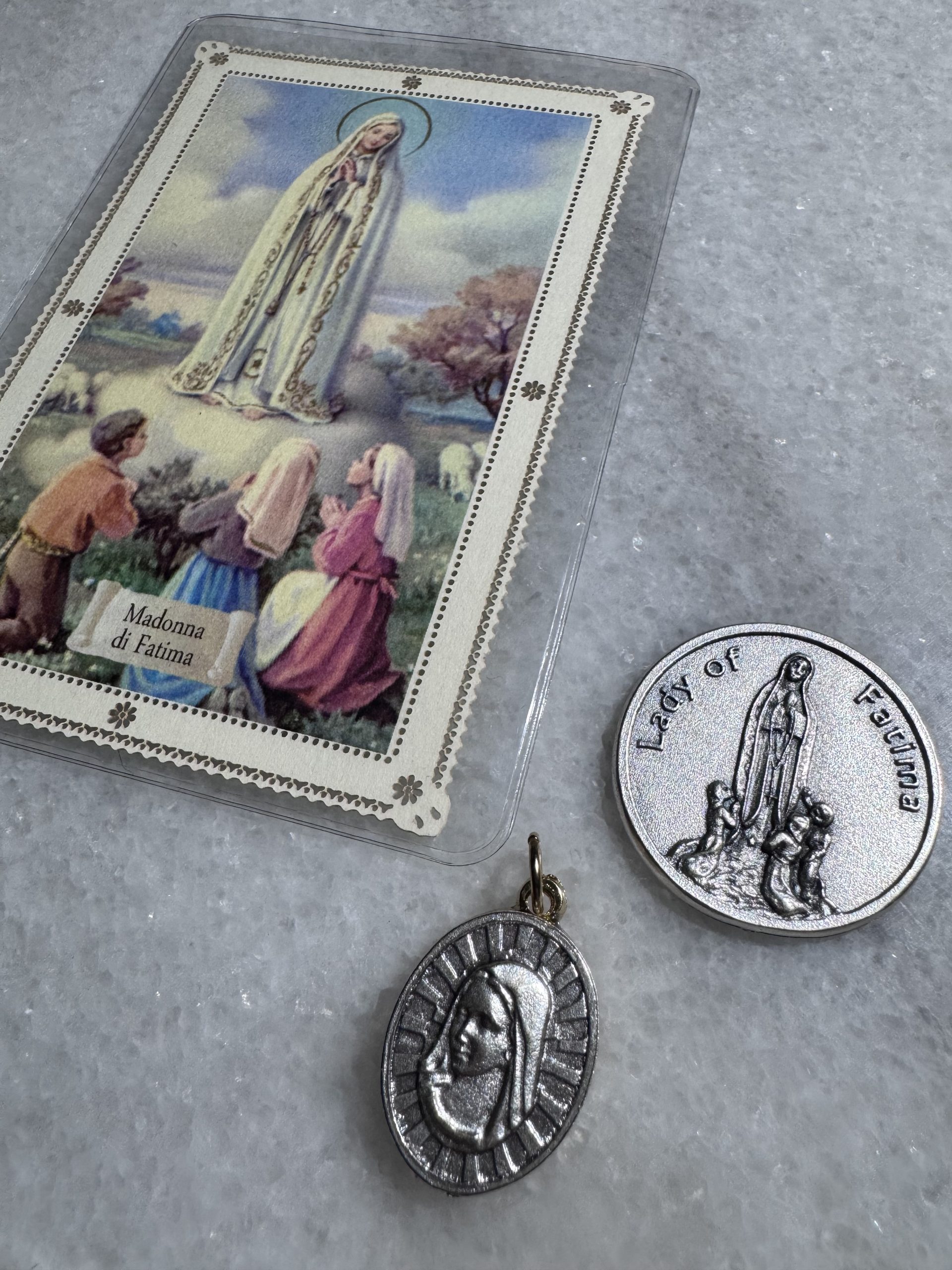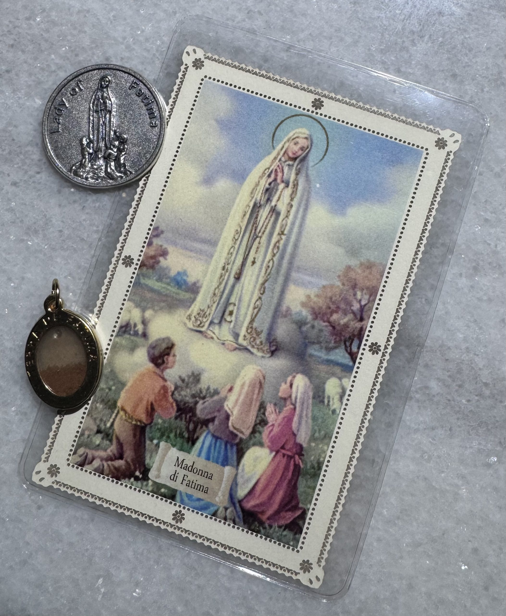 • 1.25″ silver-tone Our Lady of Fatima pocket coin (prayer engraved on reverse)