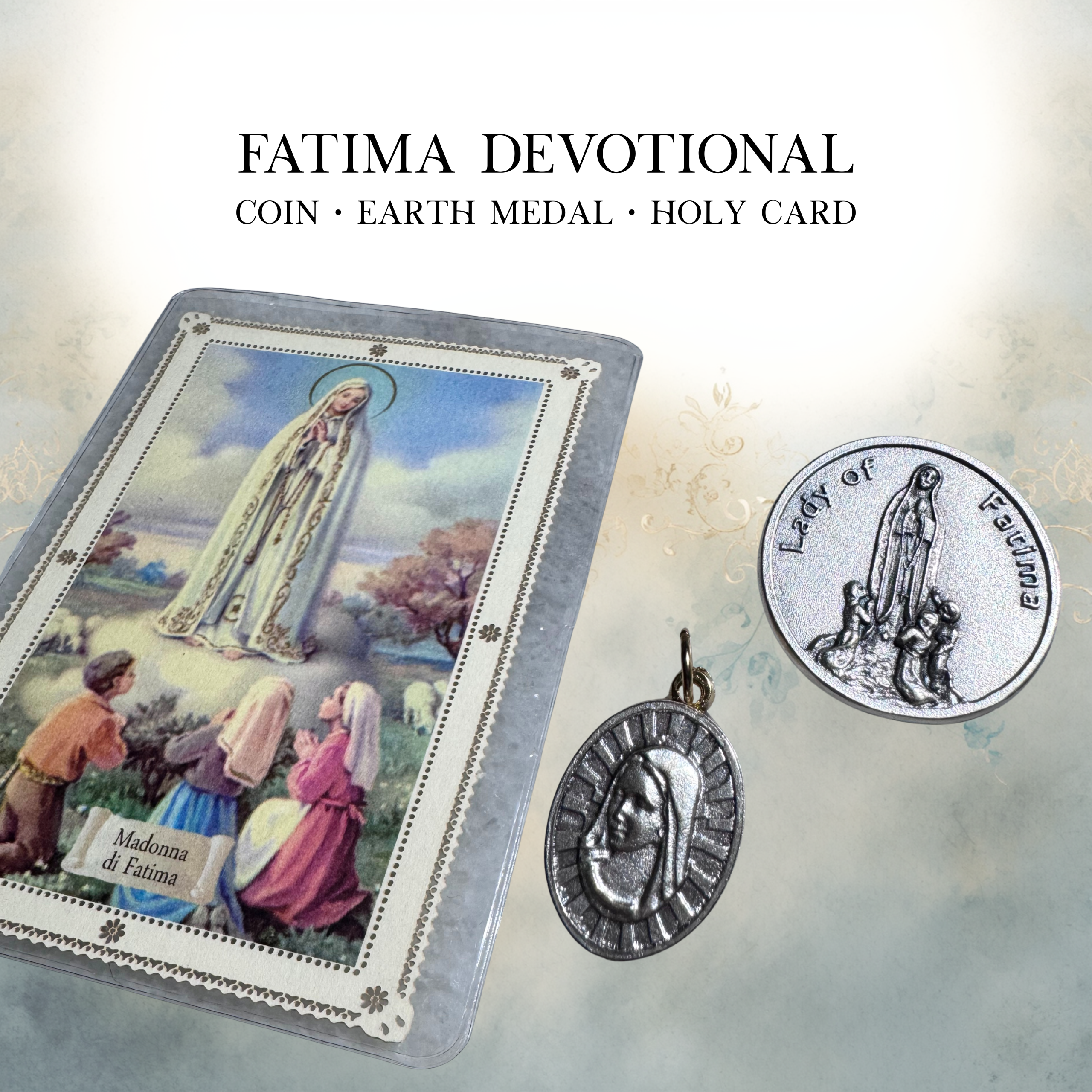 This Italian Our Lady of Fatima pocket devotional set brings together three meaningful elements honoring the 1917 apparitions in Fatima, Portugal. Featuring a silver-tone pocket coin engraved with the Fatima prayer, a devotional medal containing earth from Fatima, and an ornate Italian lace holy card, this set is thoughtfully curated for those devoted to Our Lady’s message of repentance, prayer, and the Holy Rosary.