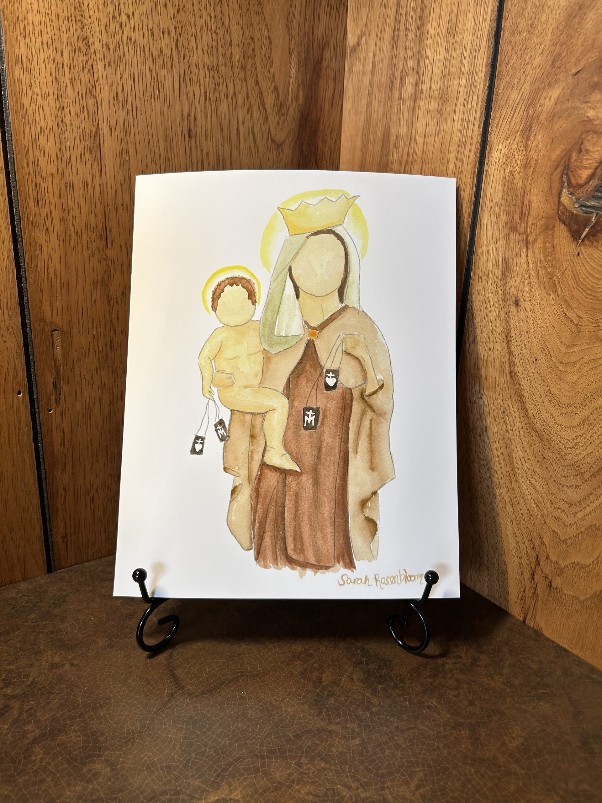 Museum-quality print of a hand-painted watercolor of Our Lady of Mount Carmel printed on thick matte paper.