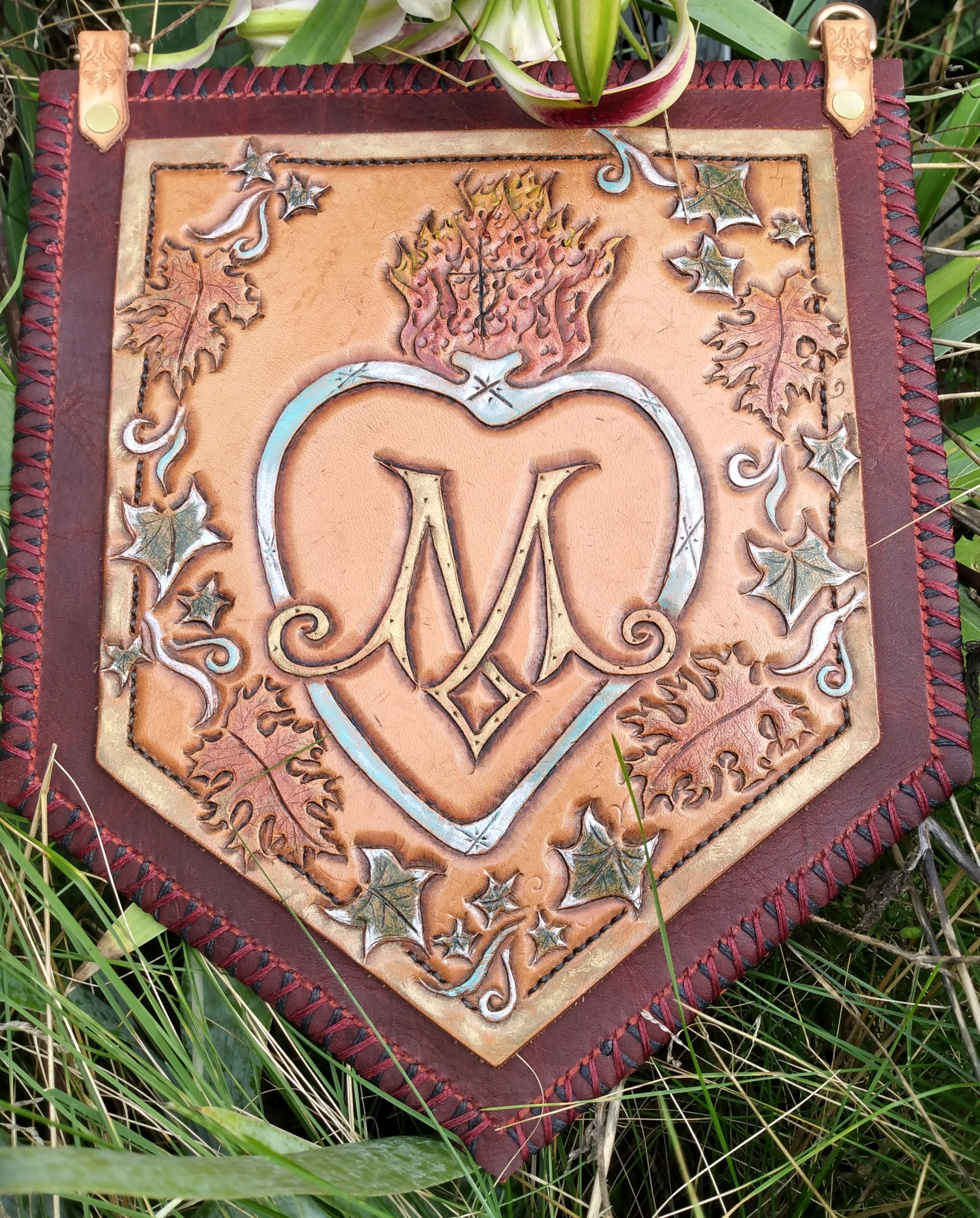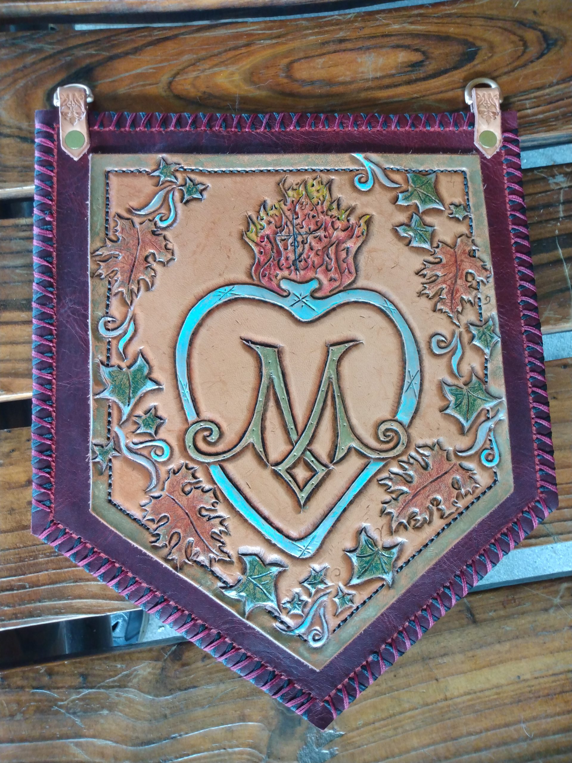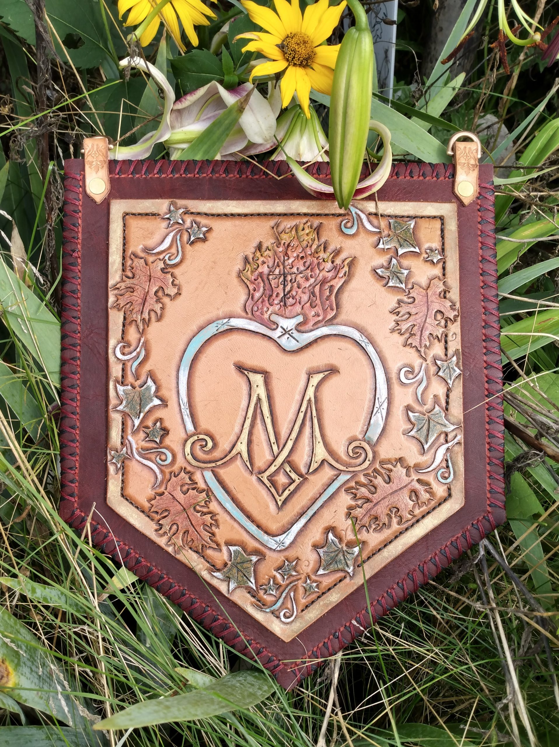 Centerpiece done in beautiful Hermann Oak veg-tan, framed on a field of gorgeous burgundy oil-tan. Traditionally crafted: Carved, tooled, stitched, and finished by hand with great pride, passion, and PRAYER!