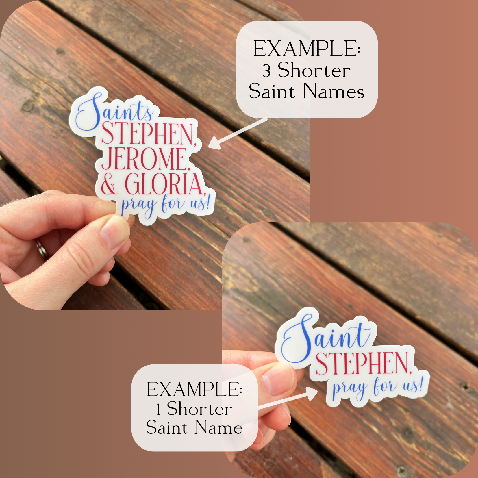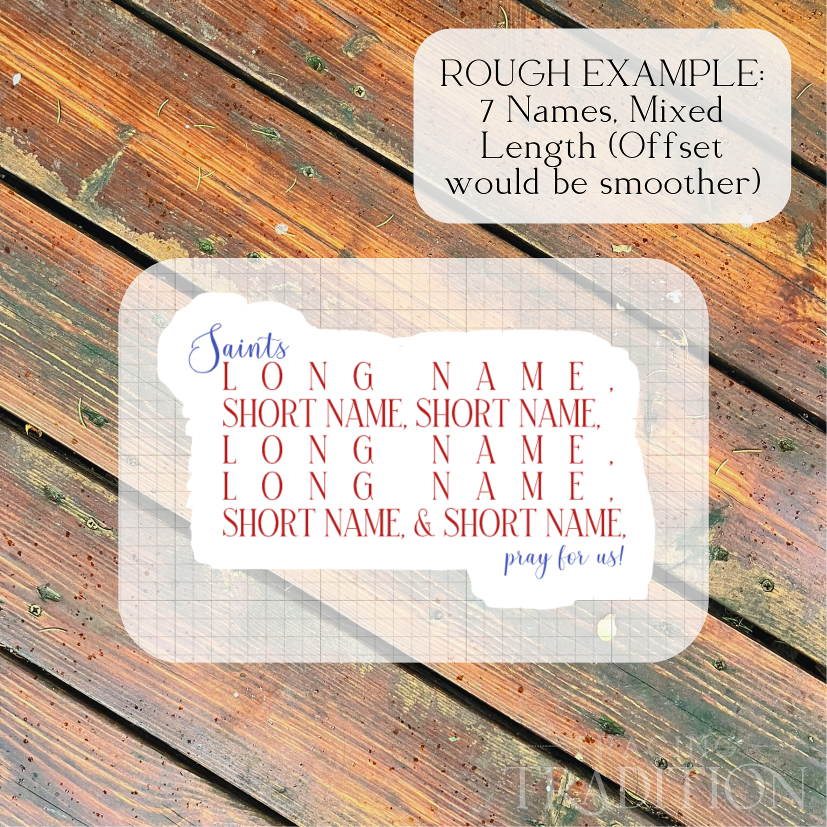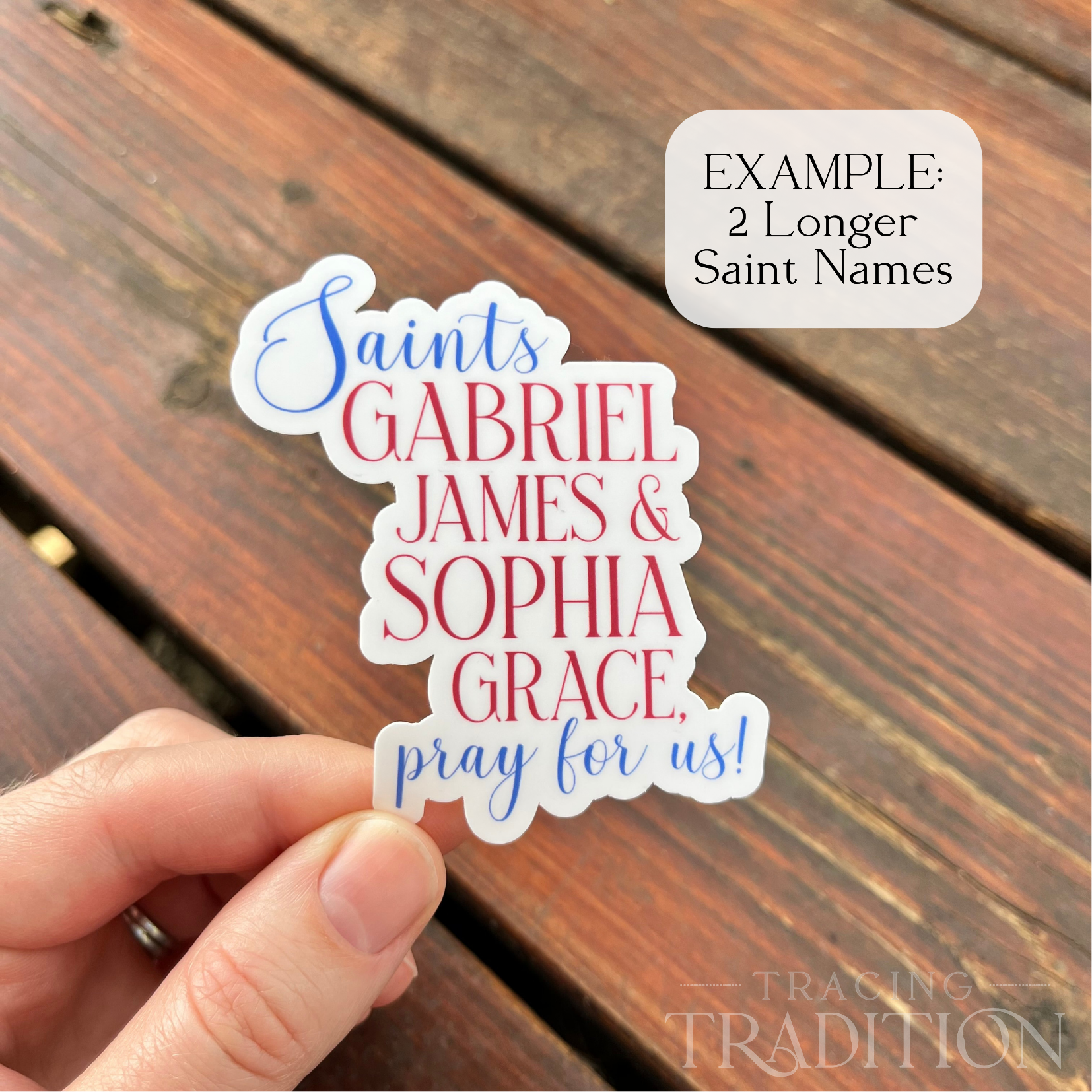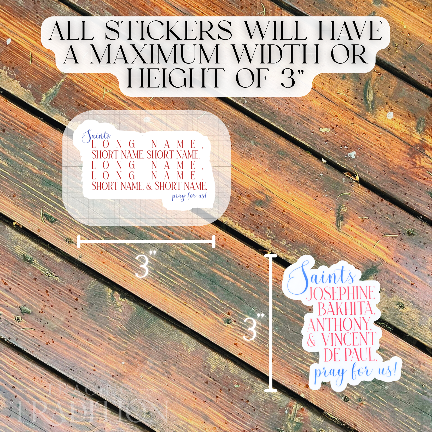 Notes: Design customization (name placement, alignment, etc.) is up to the discretion of the maker. Pricing includes personalization (choosing names), but not custom design services. If ordering, you must e-mail me (emily.dieter@tracingtradition.com) with your Saint name(s) and order number within 24 hours of order placement. Please let me know if you need them in a particular order, or if I may reorder them to optimize the design and name placement.