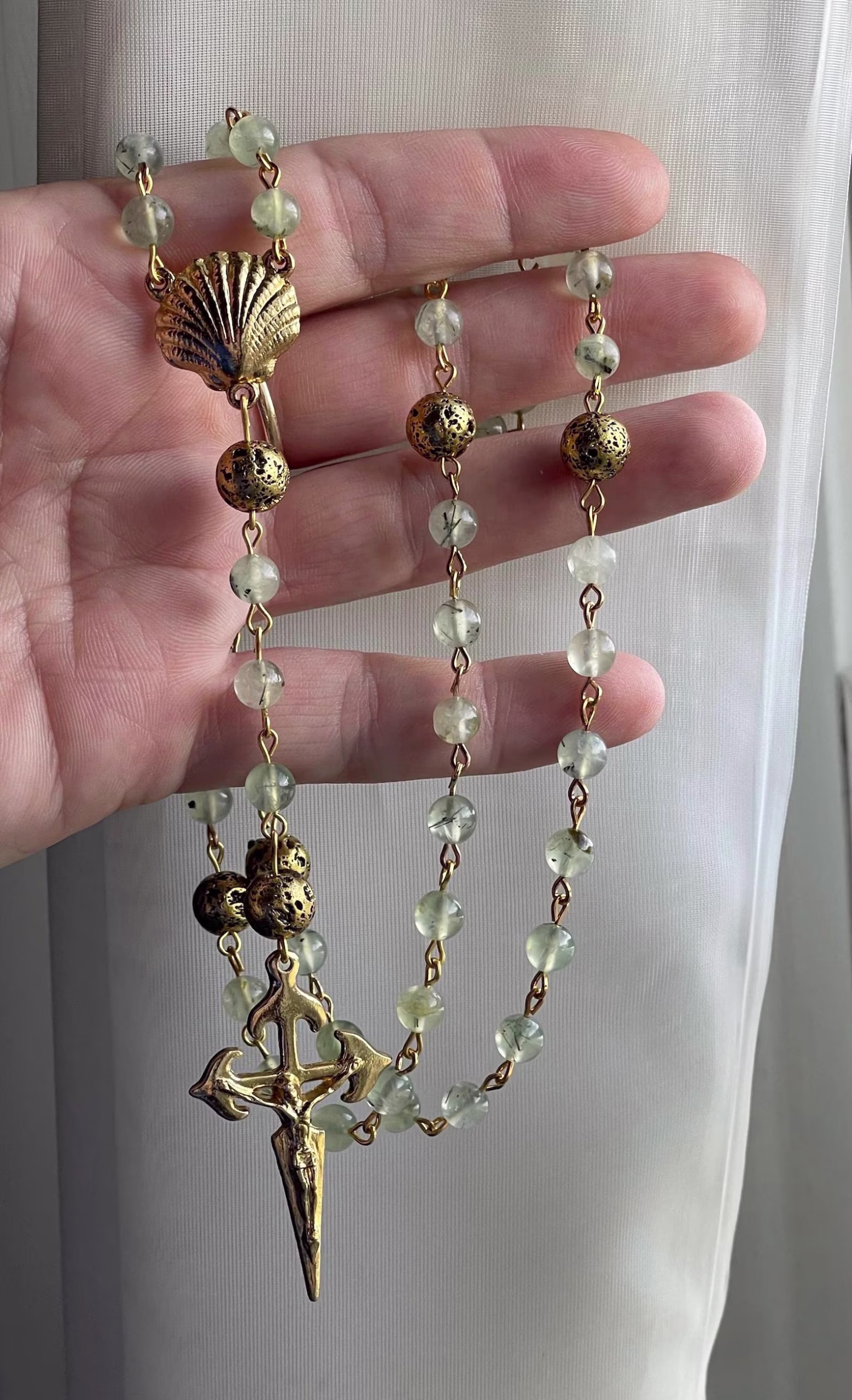 🪽Made from genuine Prehnite gemstone beads, and gold coated lava beads. The crucifix and connector are a gold plated finish.