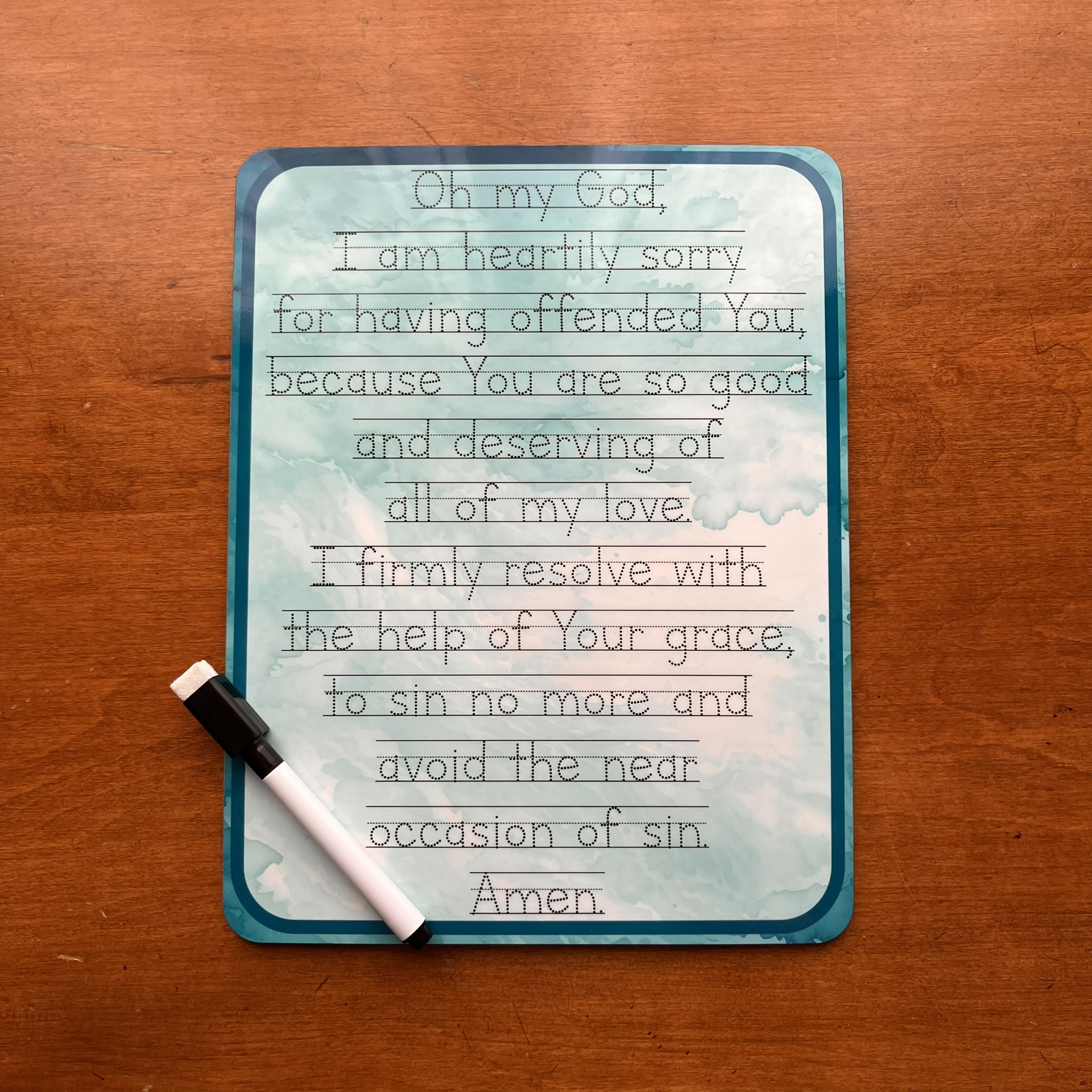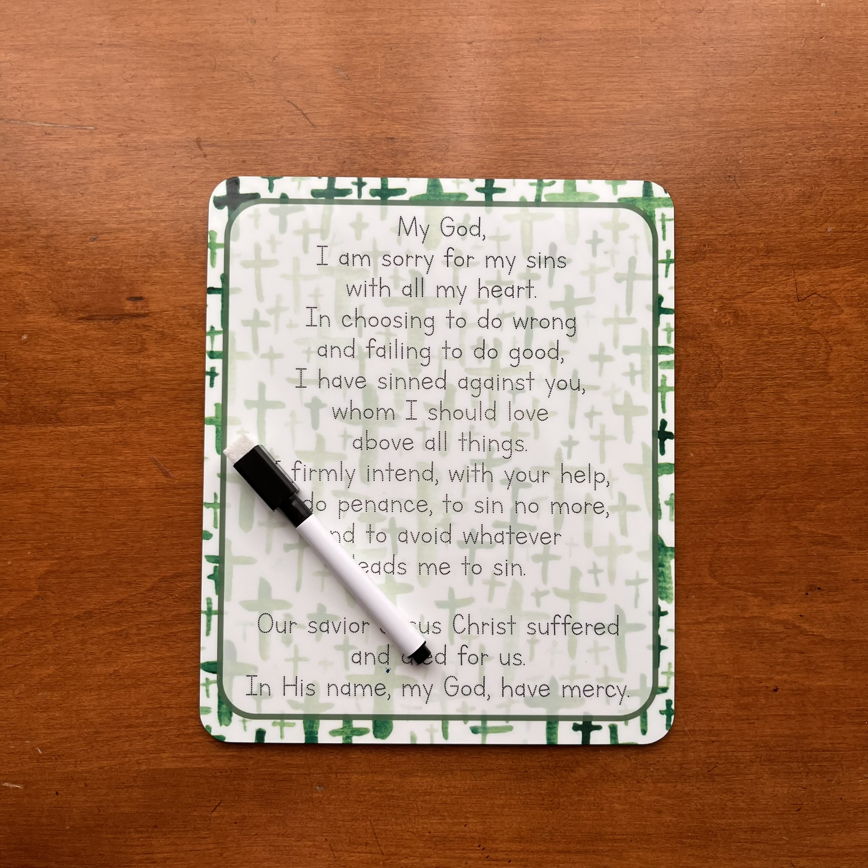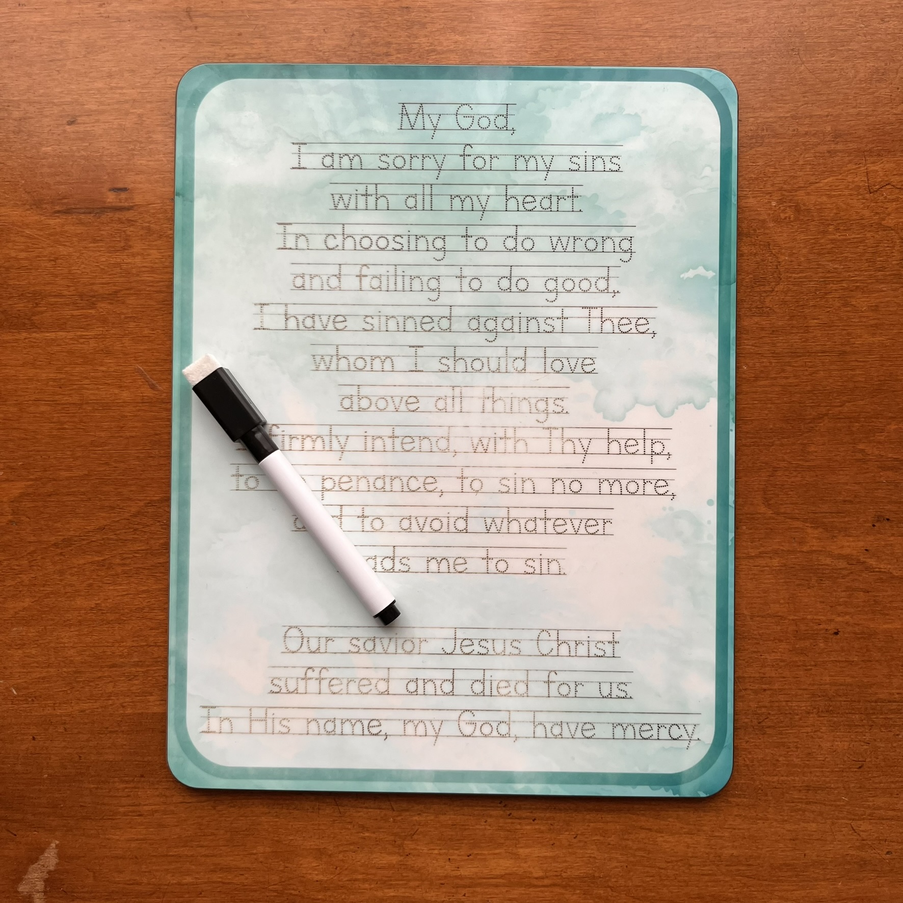 Choose from a Confiteor prayer (the I Confess from Mass) or a few Act of Contrition prayer premade dry-erase boards (whiteboards) in several materials/sizes. Perfect for children to practice handwriting while learning these beautiful prayers used at Mass and during the Sacrament of Reconciliation (also helpful for a daily examen).