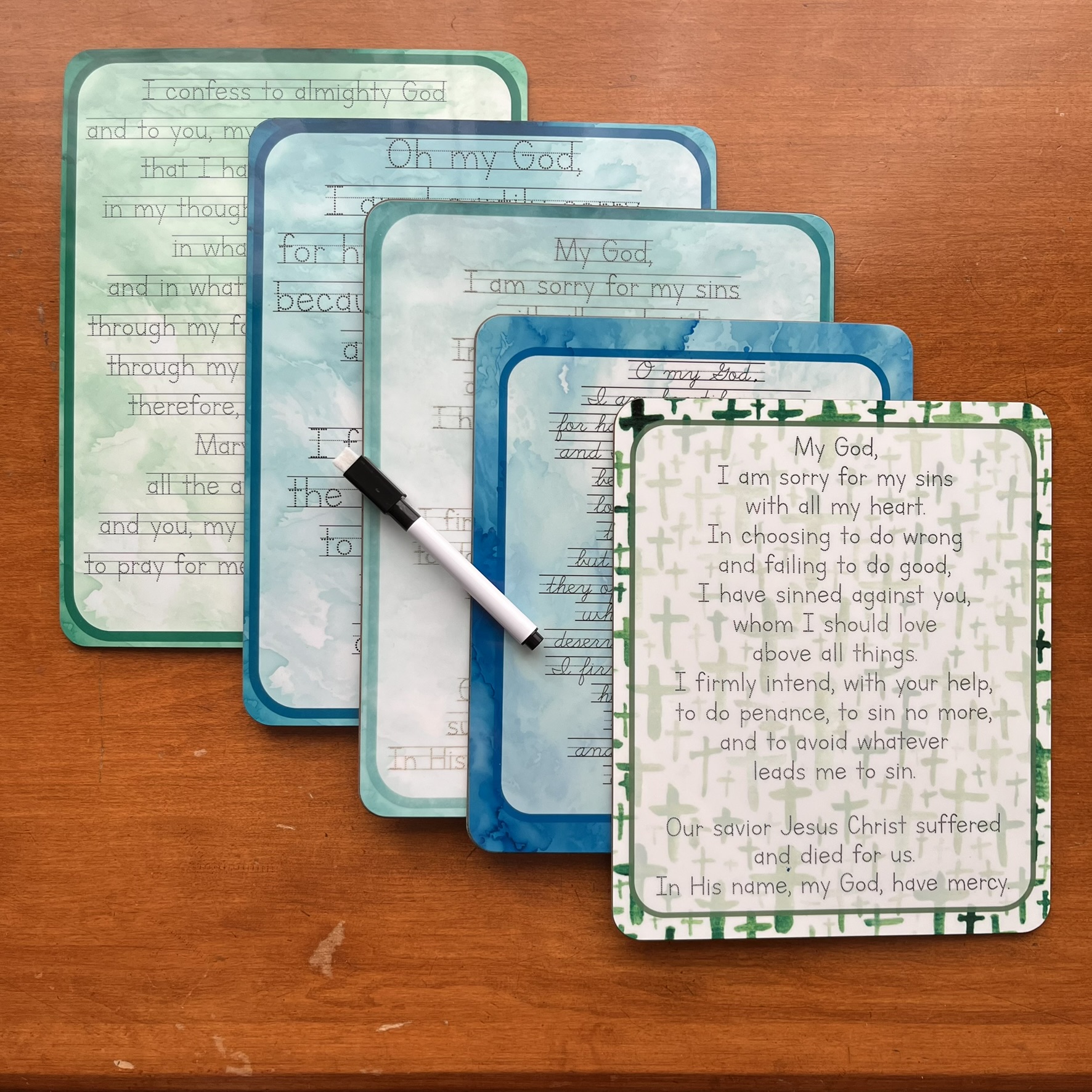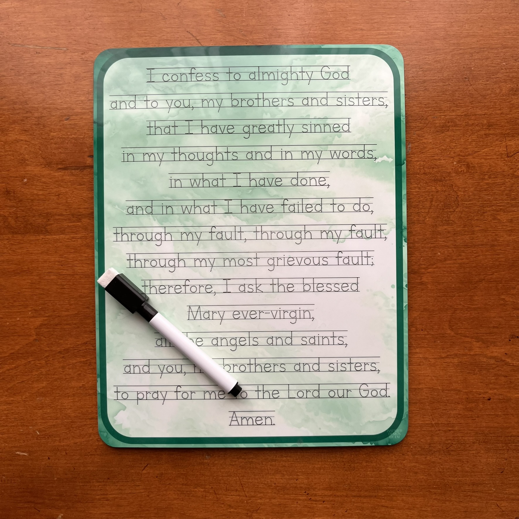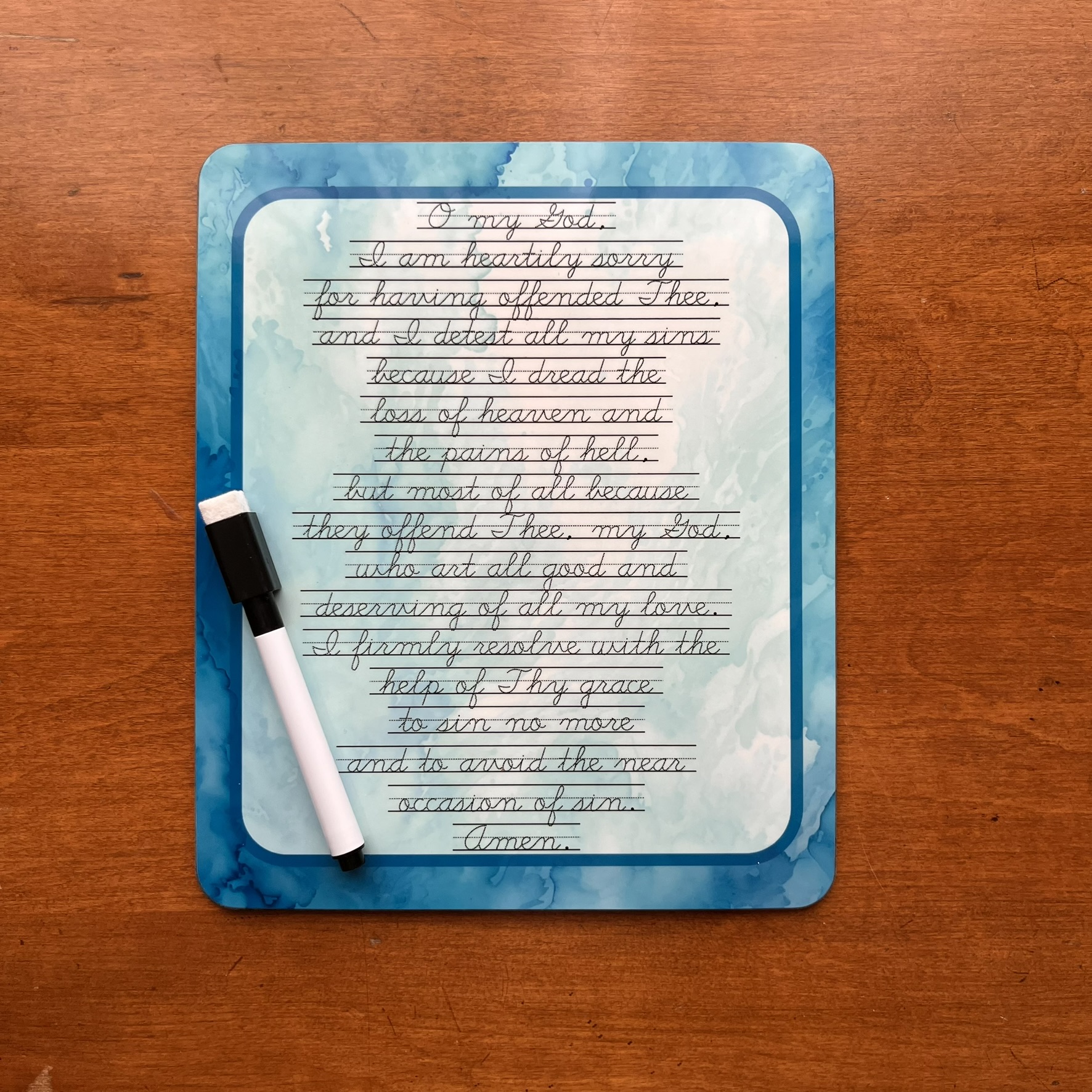 Choose from a Confiteor prayer (the I Confess from Mass) or a few Act of Contrition prayer premade dry-erase boards (whiteboards) in several materials/sizes. Perfect for children to practice handwriting while learning these beautiful prayers used at Mass and during the Sacrament of Reconciliation (also helpful for a daily examen).