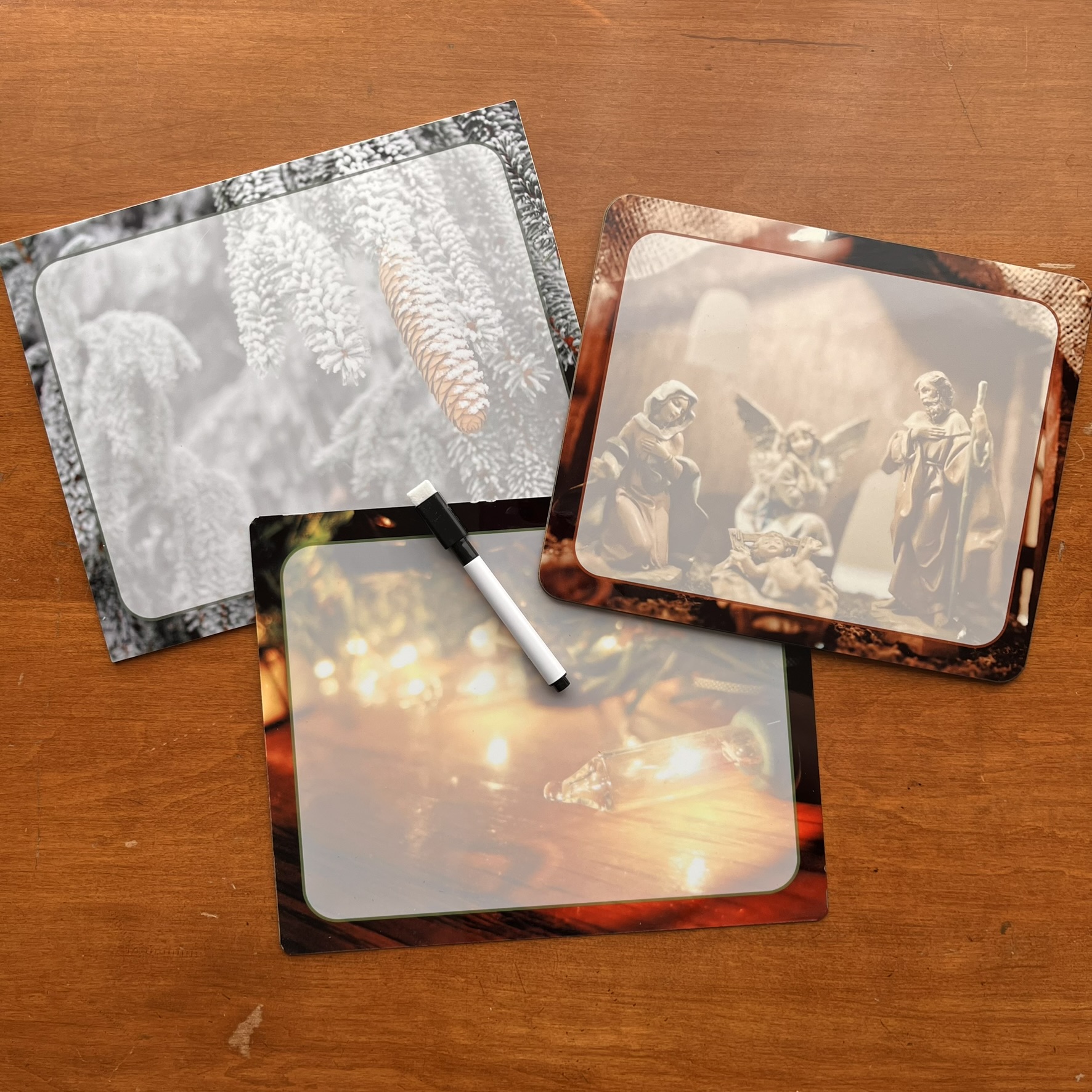 Choose from a few scenic background blank dry-erase boards in several materials/sizes. Feature real photographs from Minnesota. Blank center appropriate for multiple uses! Add a shopping list, to-do list, prayer intentions, meal plans, notes to loved ones, saint quotes, and more!
