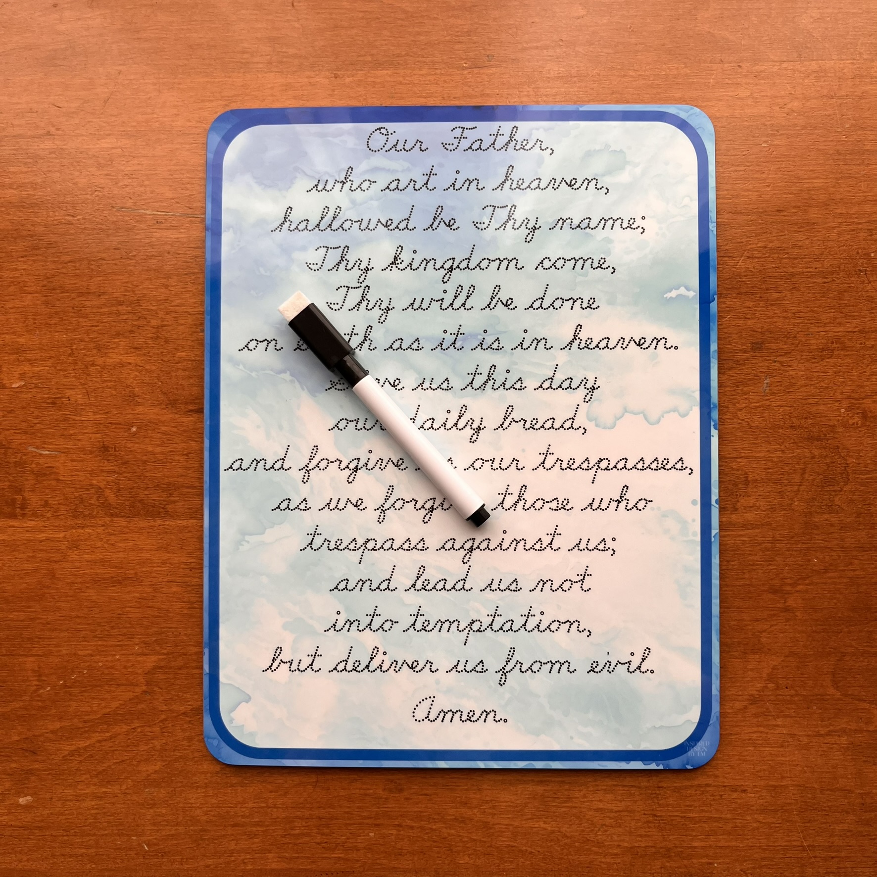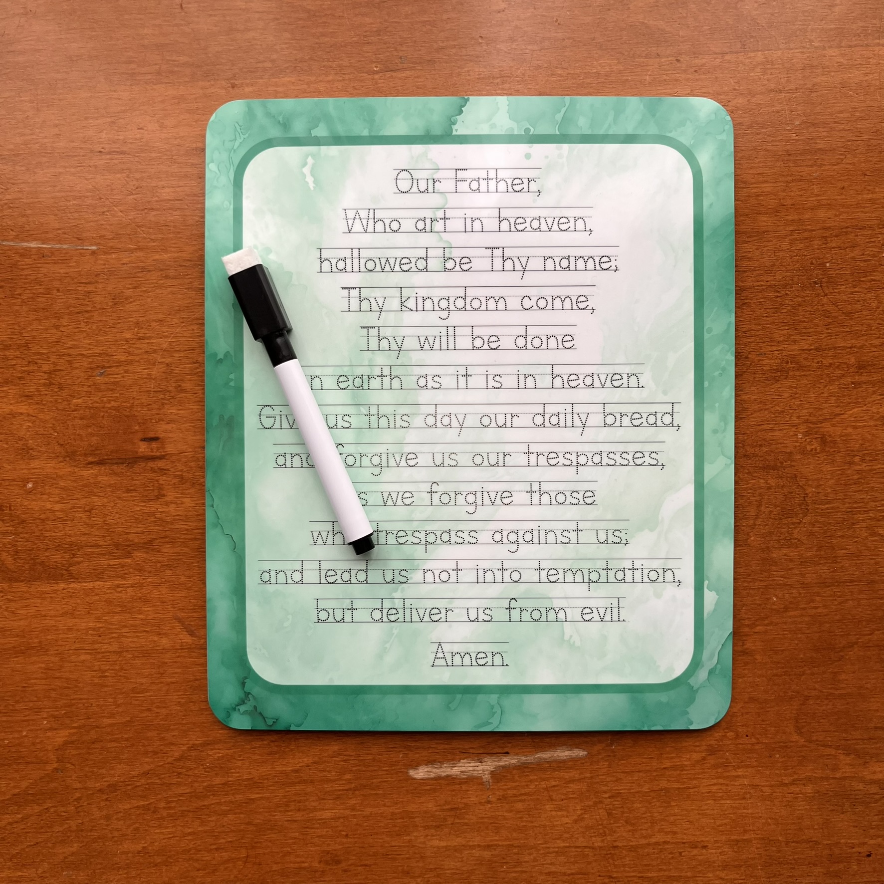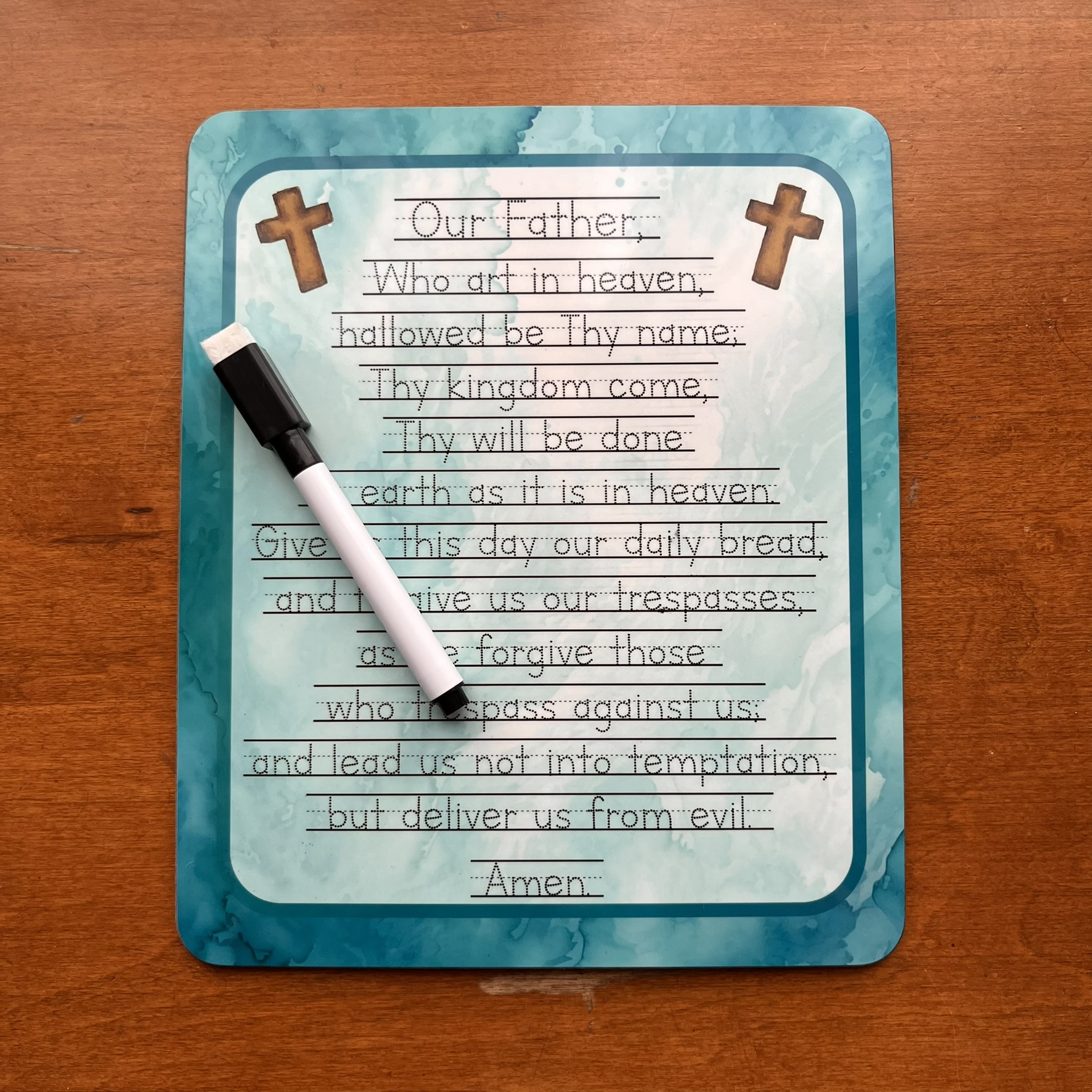 Choose from a few color styles of the ever-popular Our Father prayer on these premade dry-erase boards (whiteboards) in several materials/sizes. Perfect for children to practice handwriting while learning beautiful prayers.