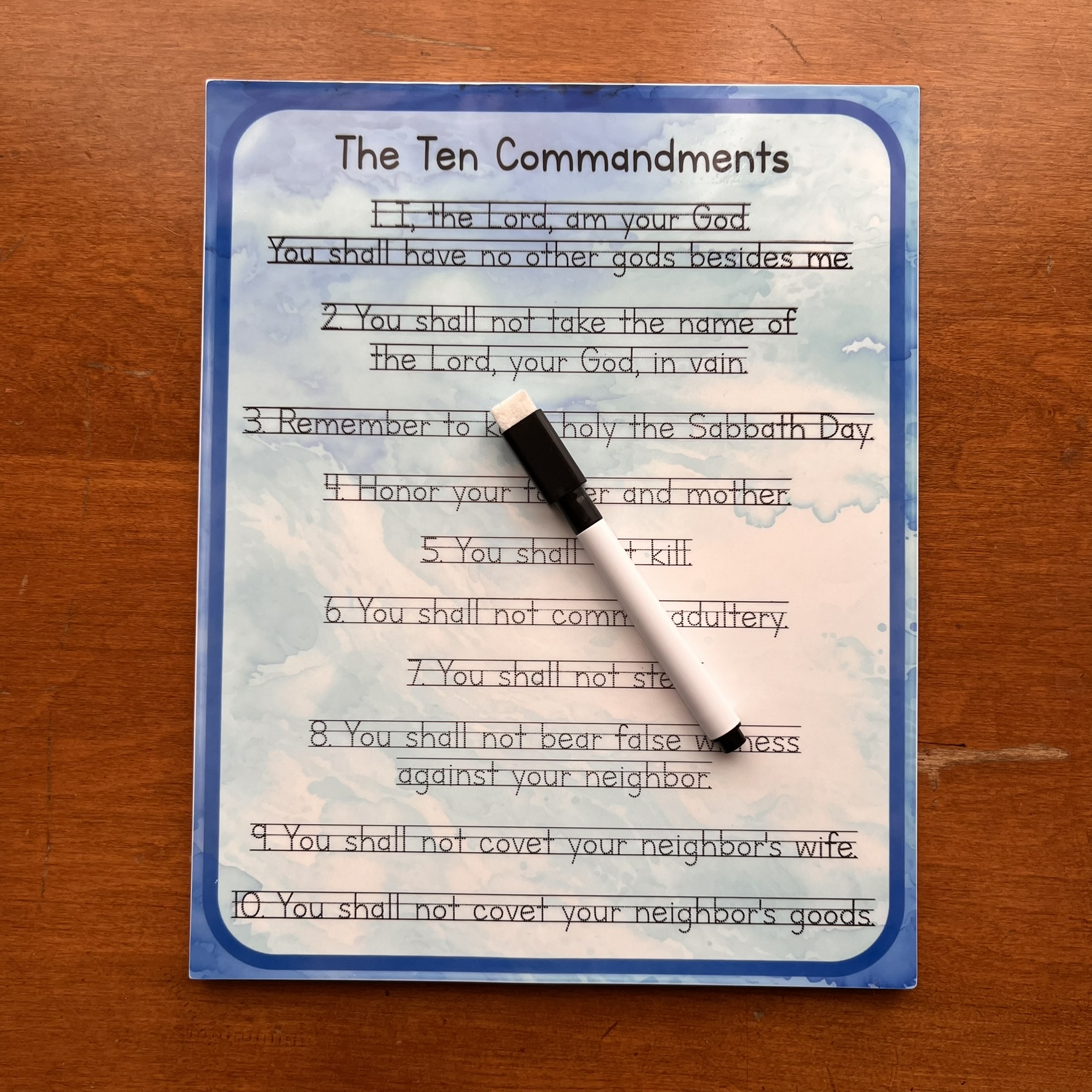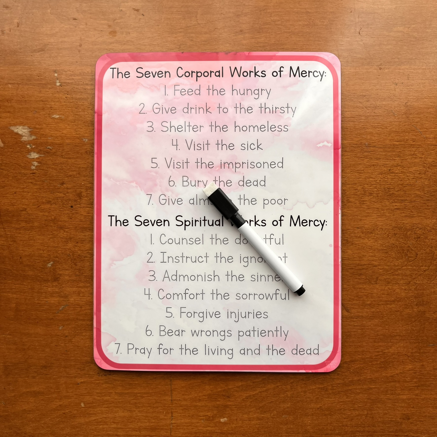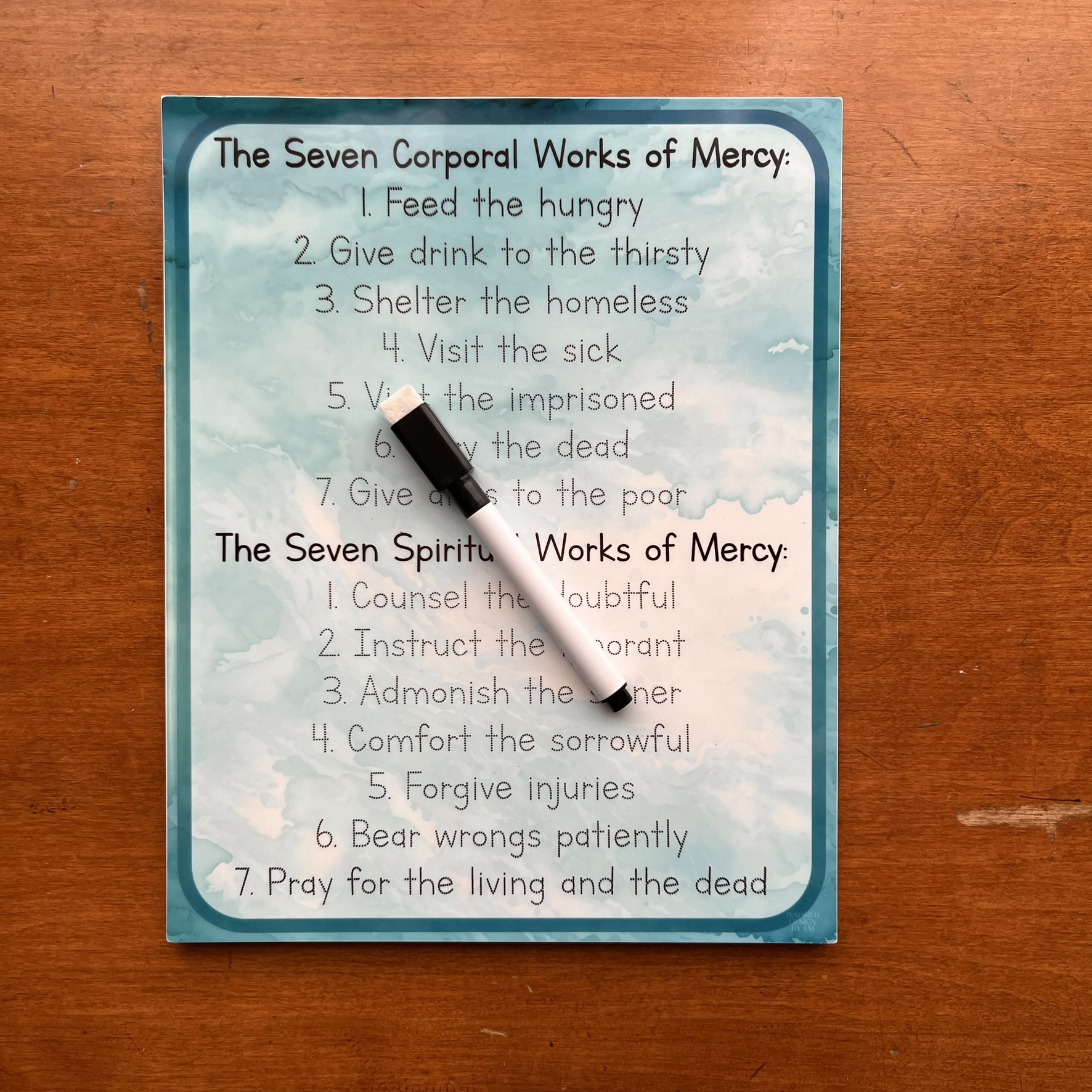 Choose from either the Spiritual + Corporal Works of Mercy or Ten Commandments premade discounted dry-erase boards (whiteboards) in several materials/sizes. Perfect for children to practice handwriting while learning beautiful prayers.