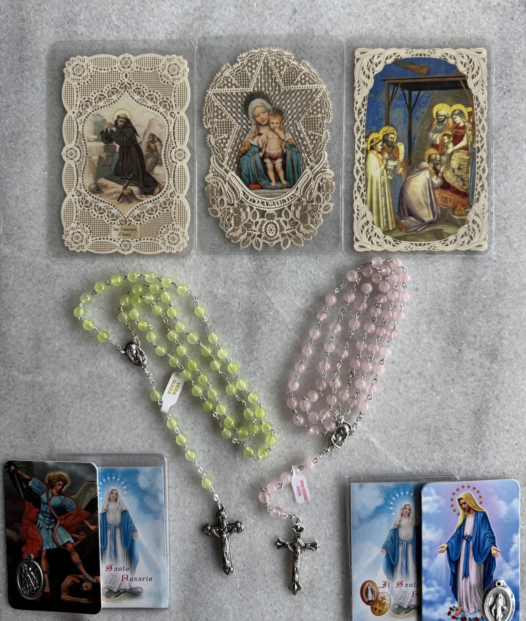 Our shop is known for its high-quality Italian holy cards, which are thoughtfully included in most of our rosary boxes and devotional gift sets.