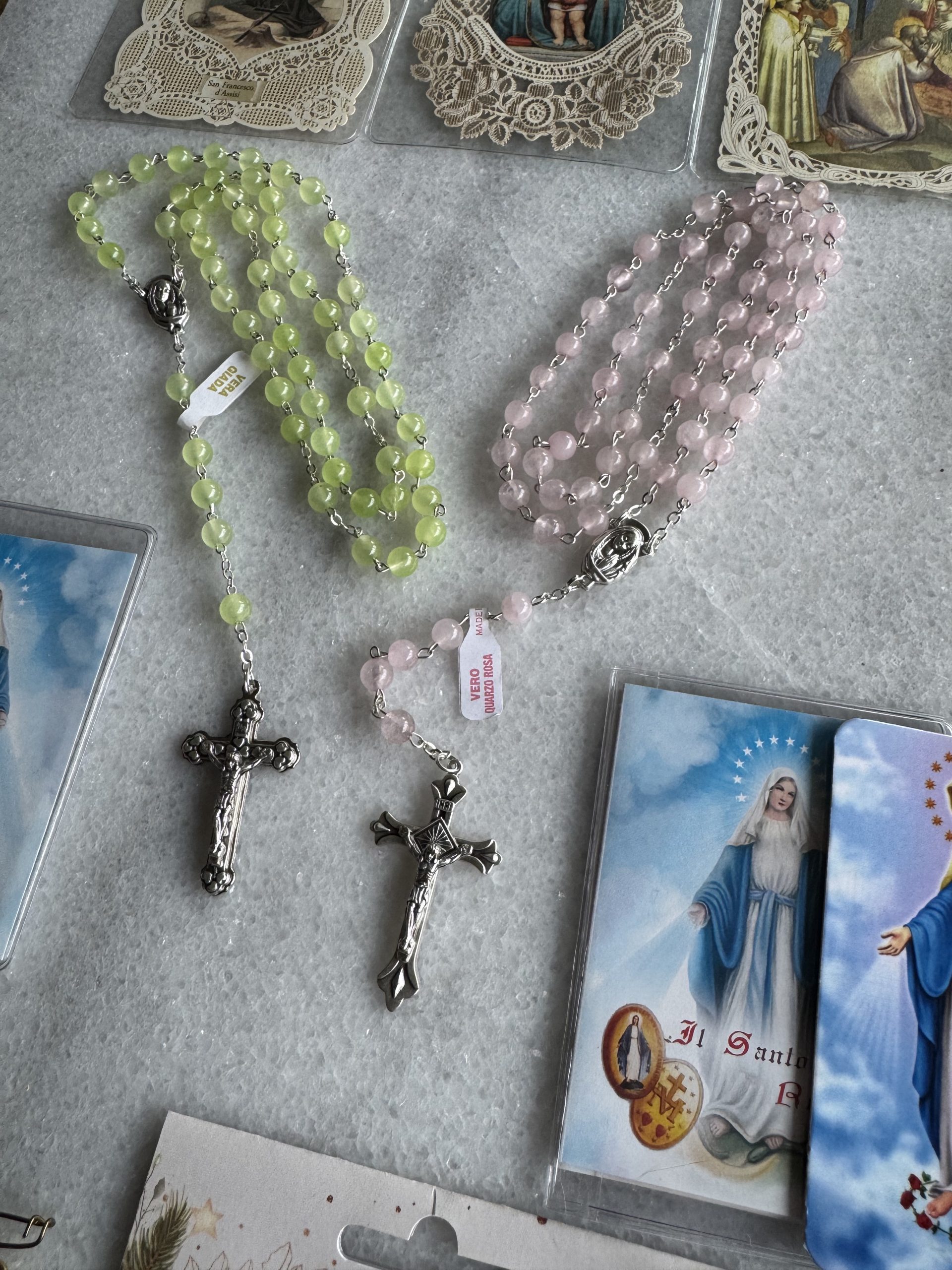 Each rosary is handmade in Italy with genuine gemstone beads, a Marian metal center, and a traditional Pardon Crucifix, then paired with an elevated collection of Italian holy cards, medals, and devotional keepsakes. Every detail is curated to honor Our Lord and the Blessed Virgin Mary with reverence, beauty, and tradition.