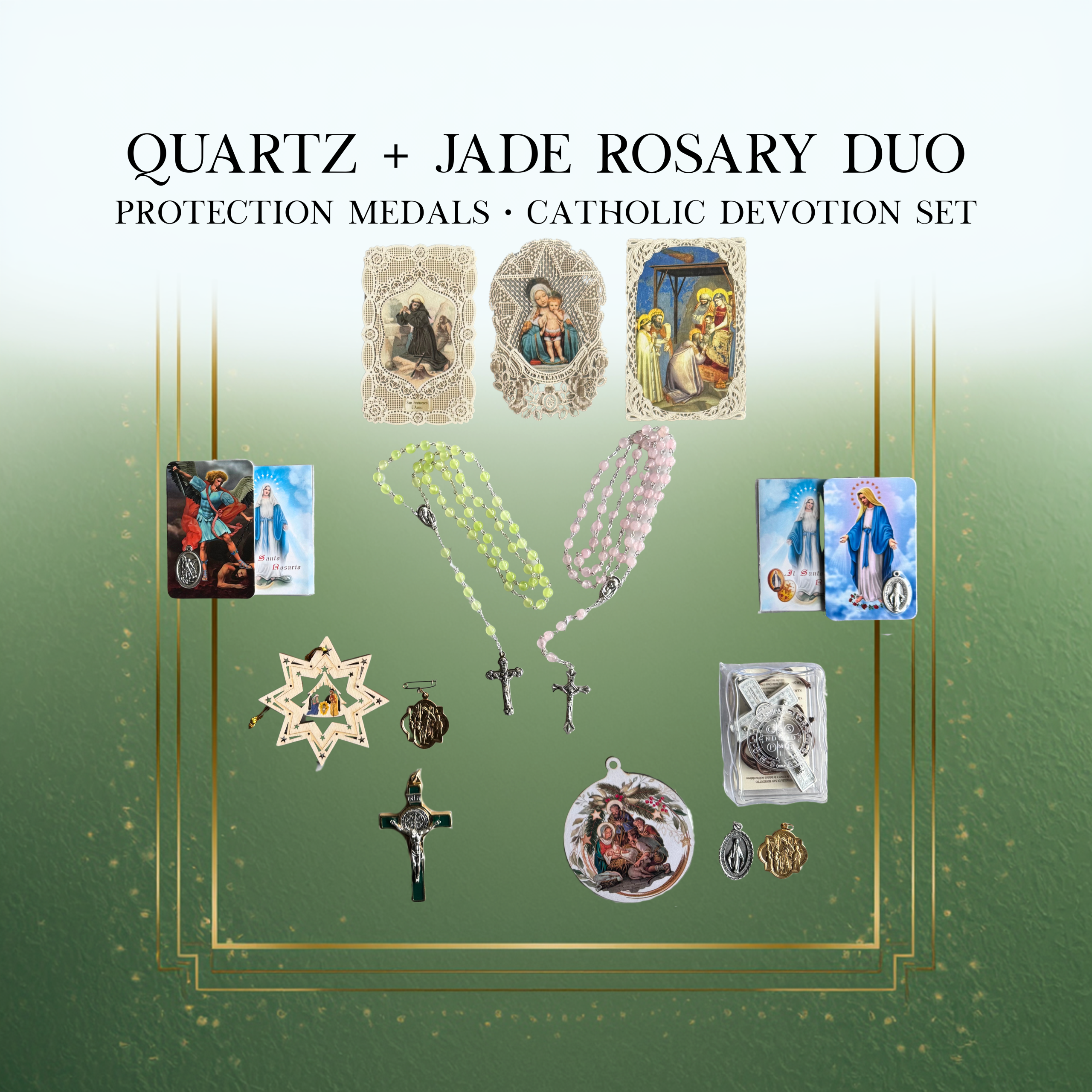 This heirloom Catholic rosary gift set features TWO handcrafted Italian gemstone rosary gift boxes — one in natural pink Rose Quartz and one in Green Jade — prayerfully assembled into a single, luxury devotional bundle.
