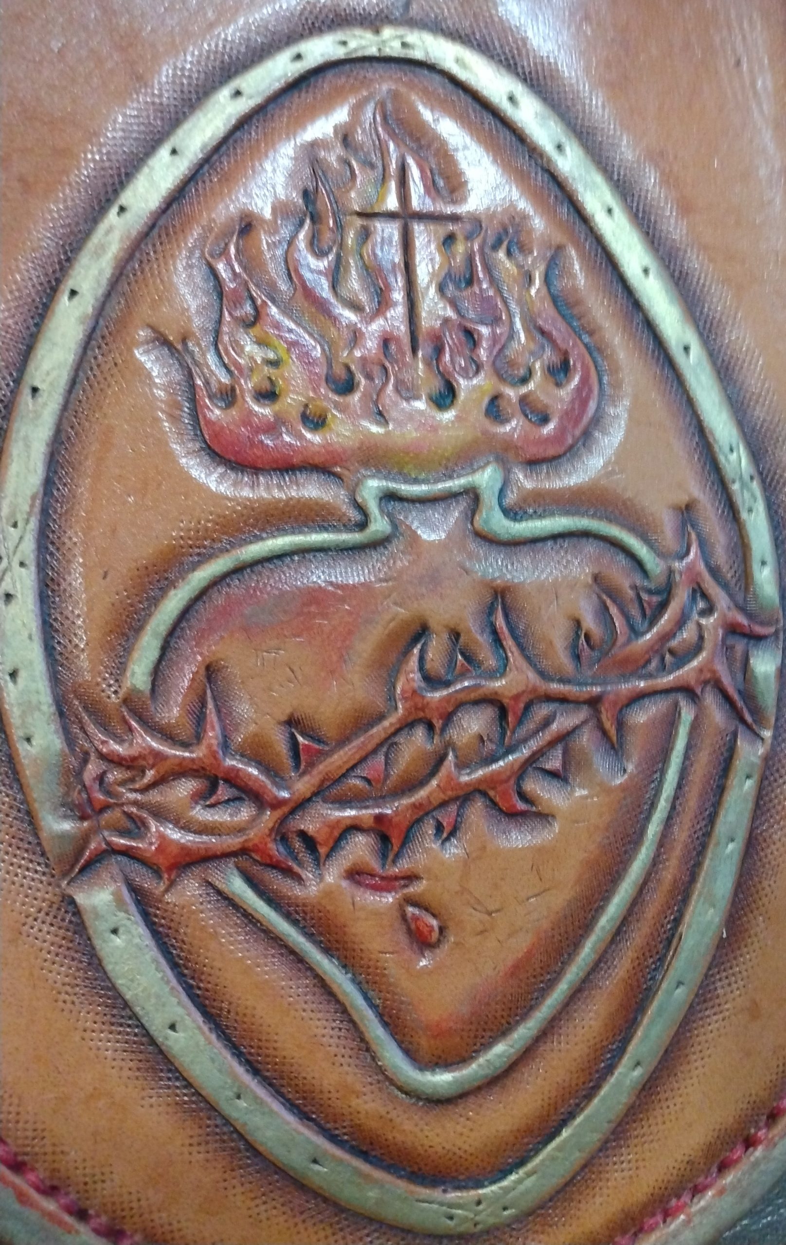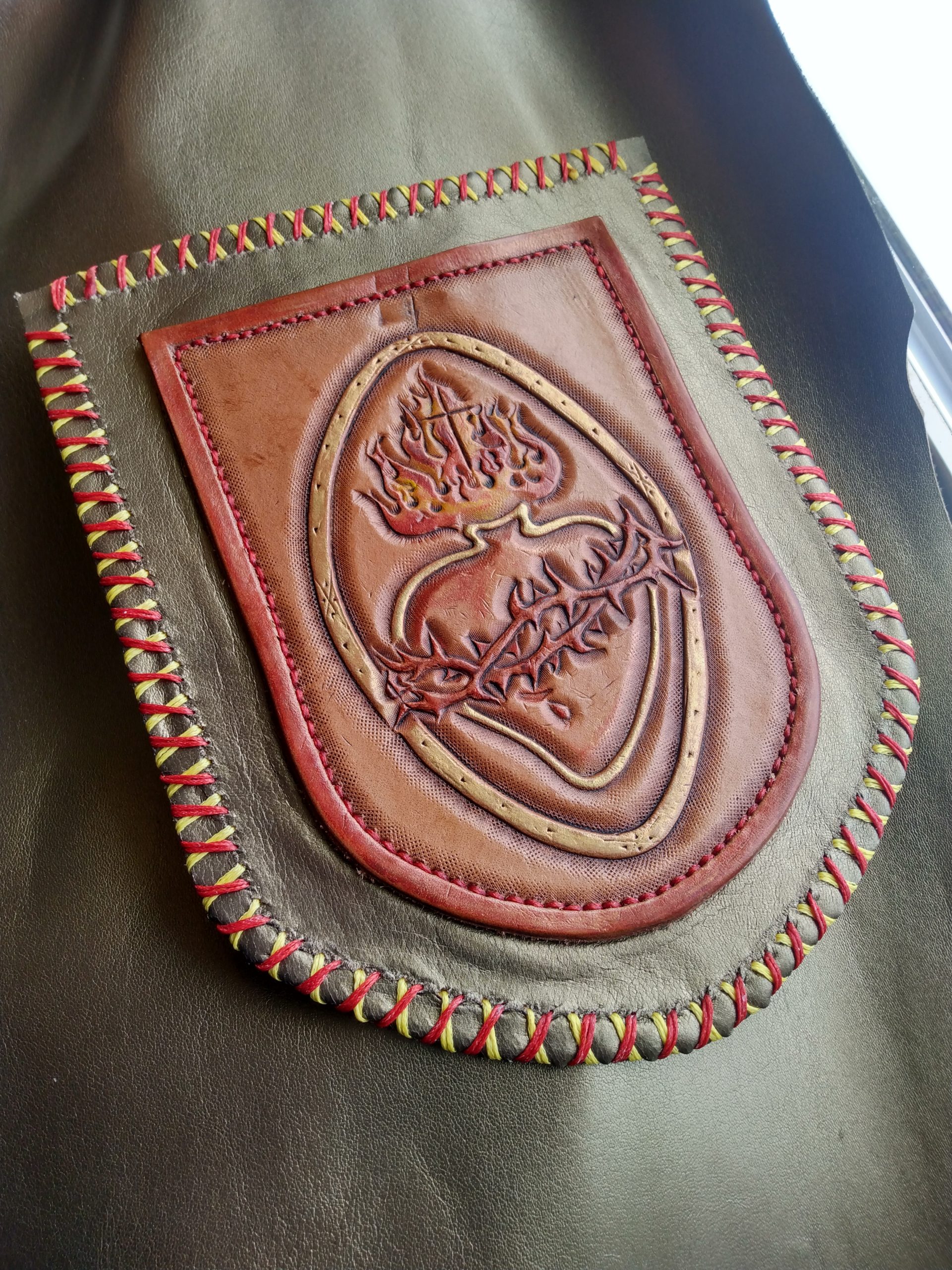 Centerpiece done in beautiful Hermann Oak veg-tan, framed on a field of gorgeous antique gold chrome-tan. Original, one of a kind, traditionally crafted, carved, tooled, stitched, finished, and gilded by hand.