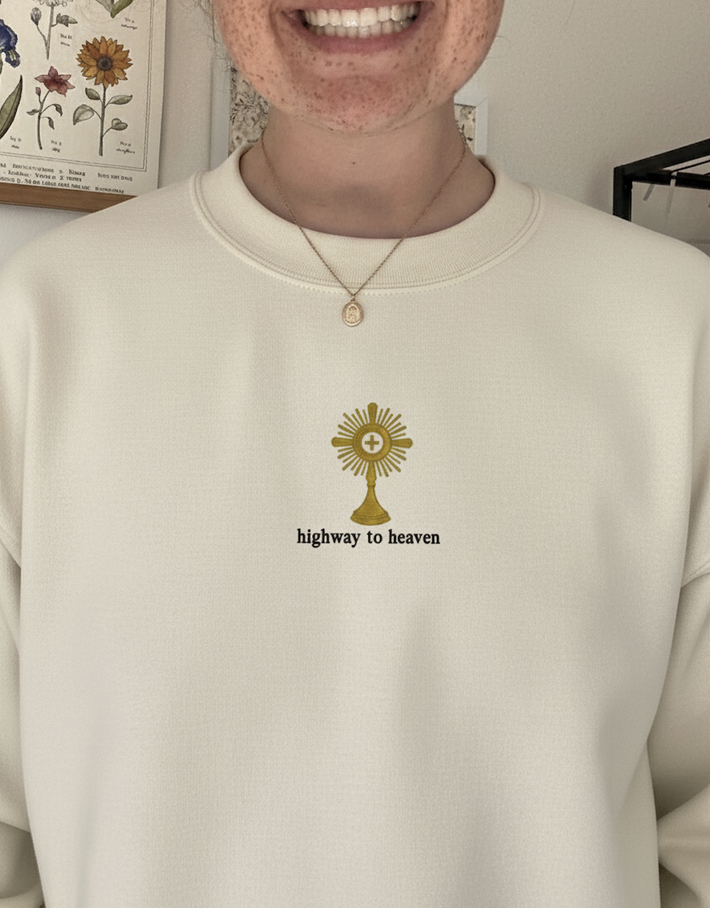Draw closer to the heart of Jesus with this soft crewneck, featuring a beautifully embroidered gold monstrance and the phrase “highway to heaven.” Inspired by Saint Carlo Acutis, who lovingly referred to the Eucharist as his “highway to heaven,” this design is a gentle reminder of the power and beauty of Christ’s presence.