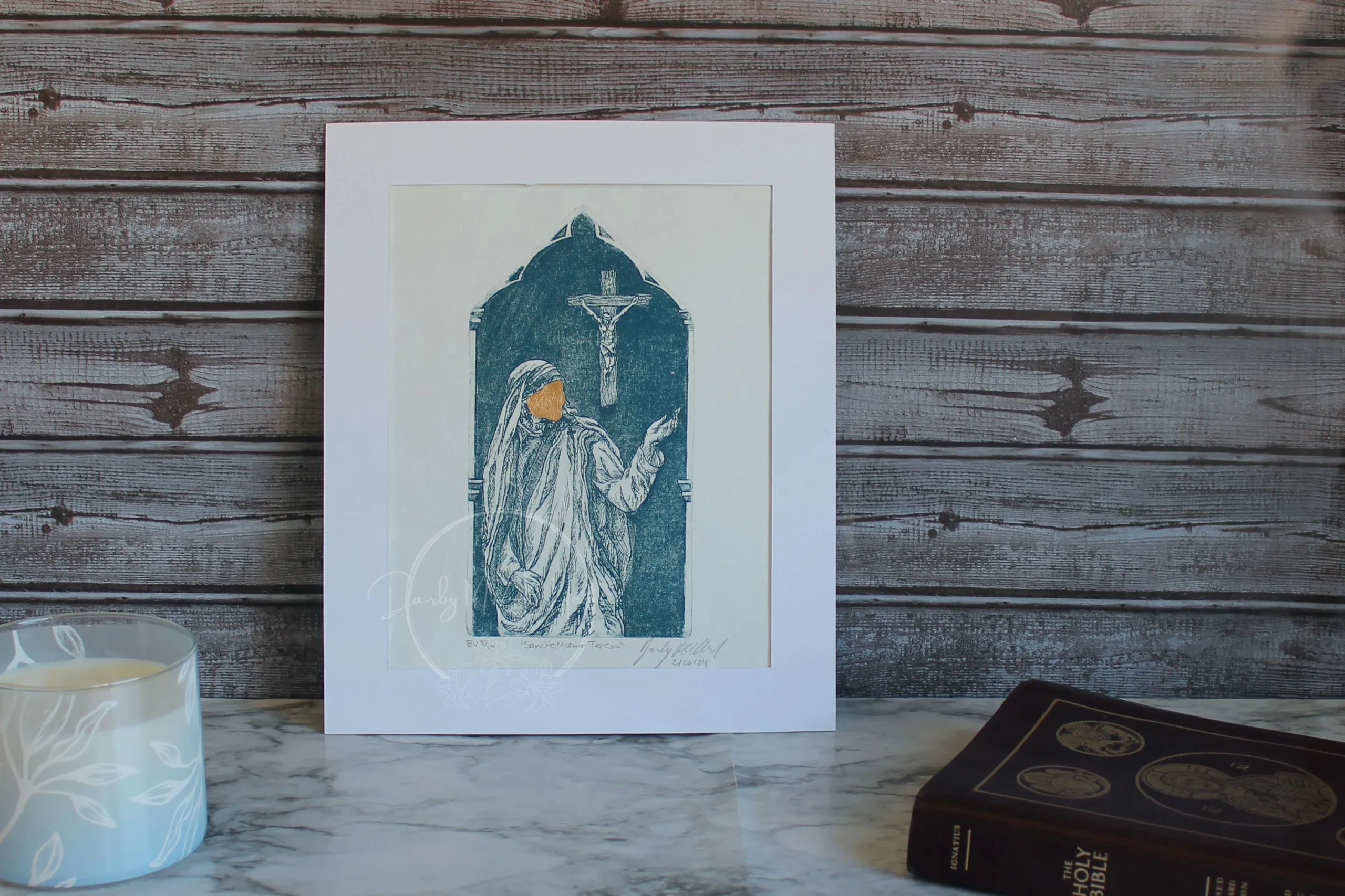 Honor the life and legacy of St. Teresa of Calcutta with “Sancte Mater Teresa”, an intaglio art print capturing her serene and compassionate spirit. This 8″x10″ artwork beautifully highlights her devotion and unwavering care for crucified Lord, making it a meaningful piece for prayer, reflection, or inspiration.