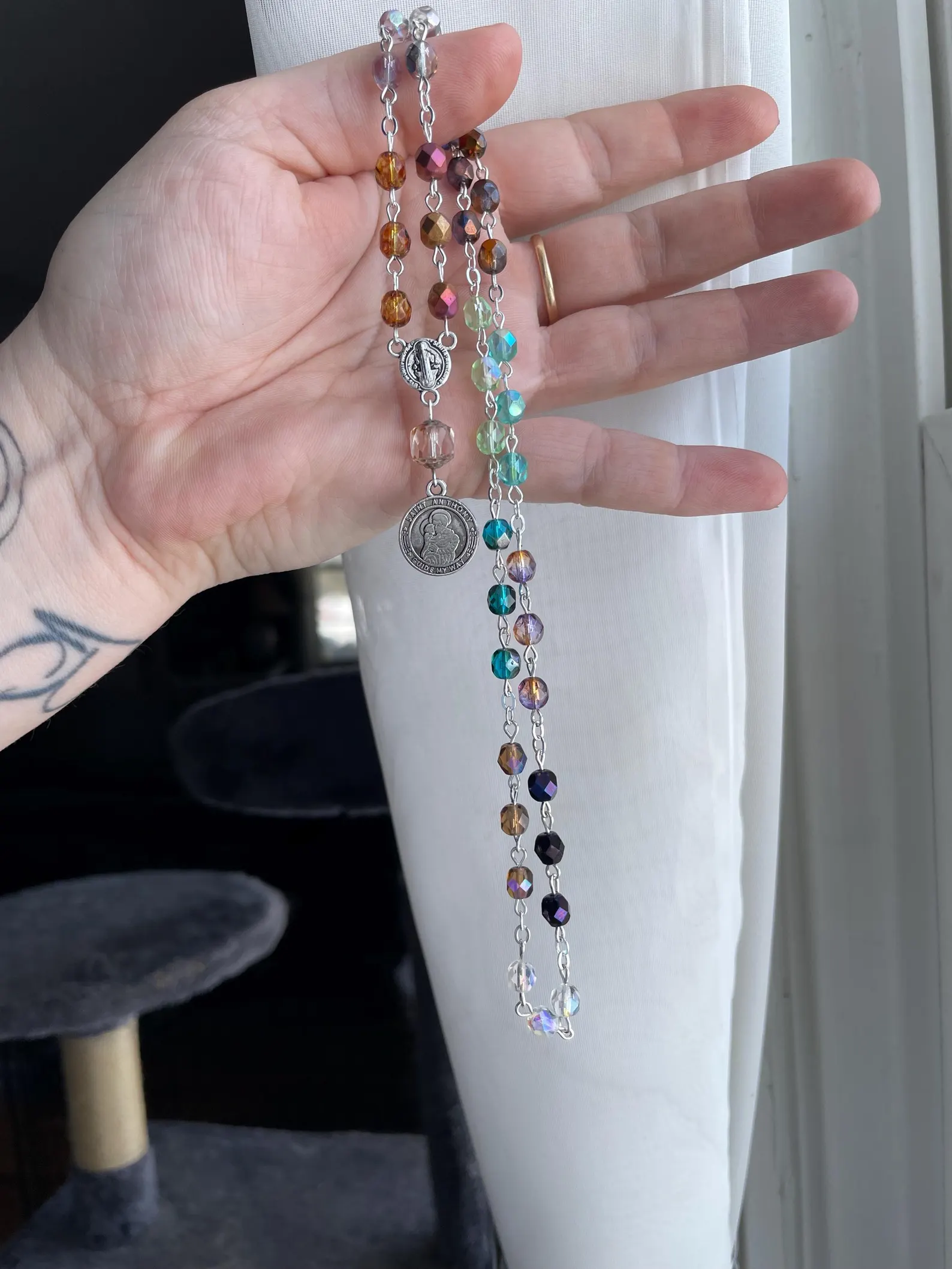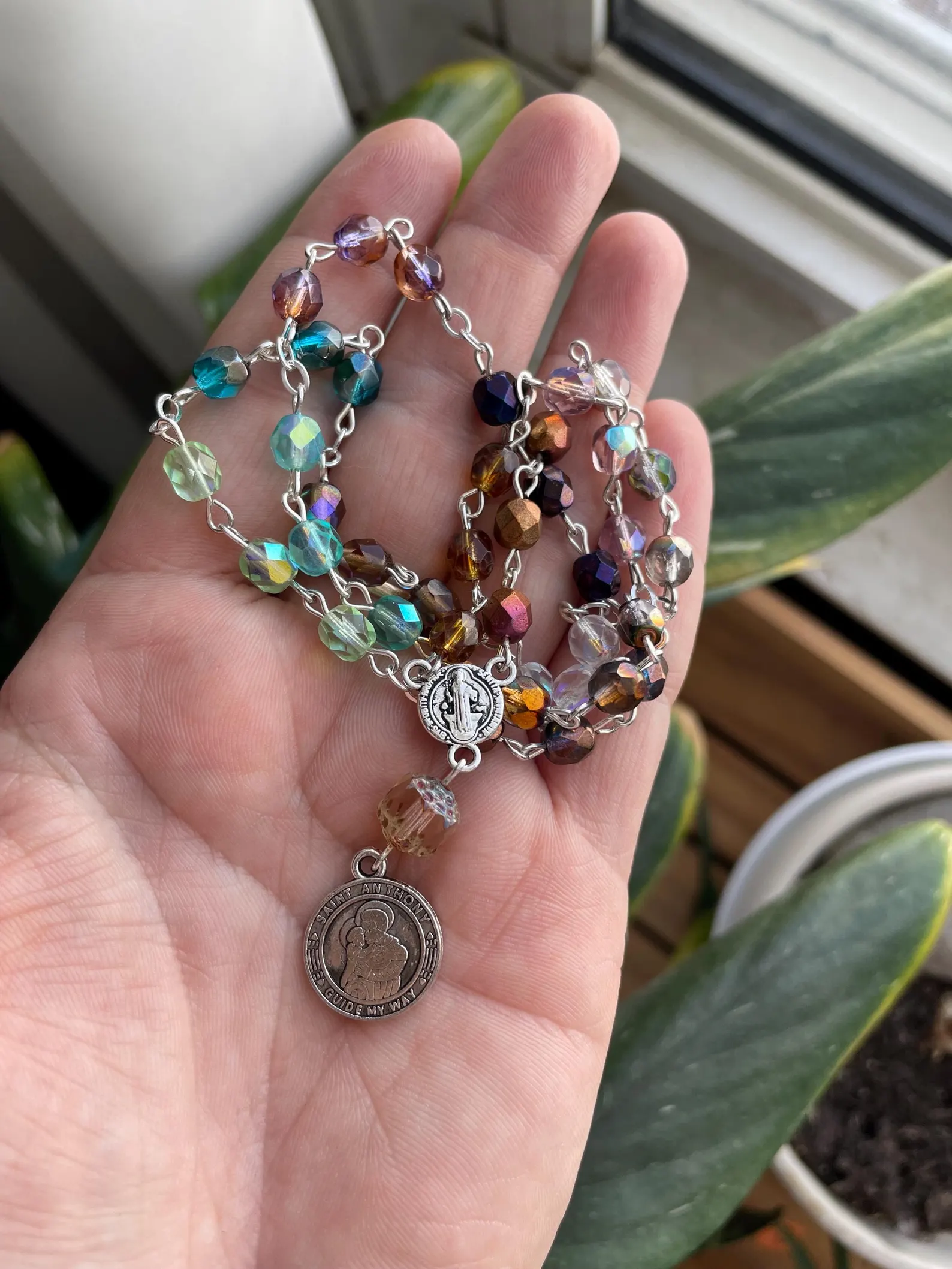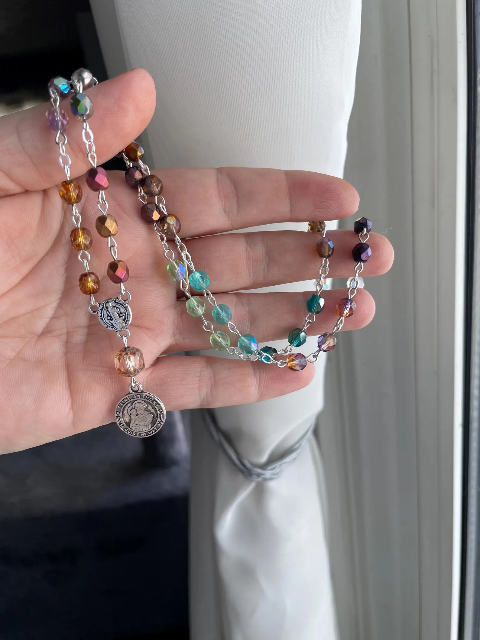 🪽Made from multicolor Czech glass beads, adorned with a silver crucifix and silver St. Anthony medal on the other end.